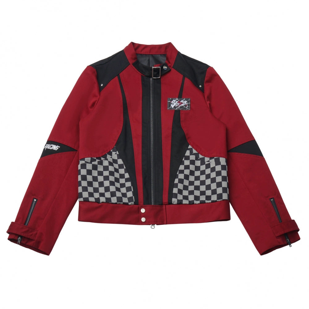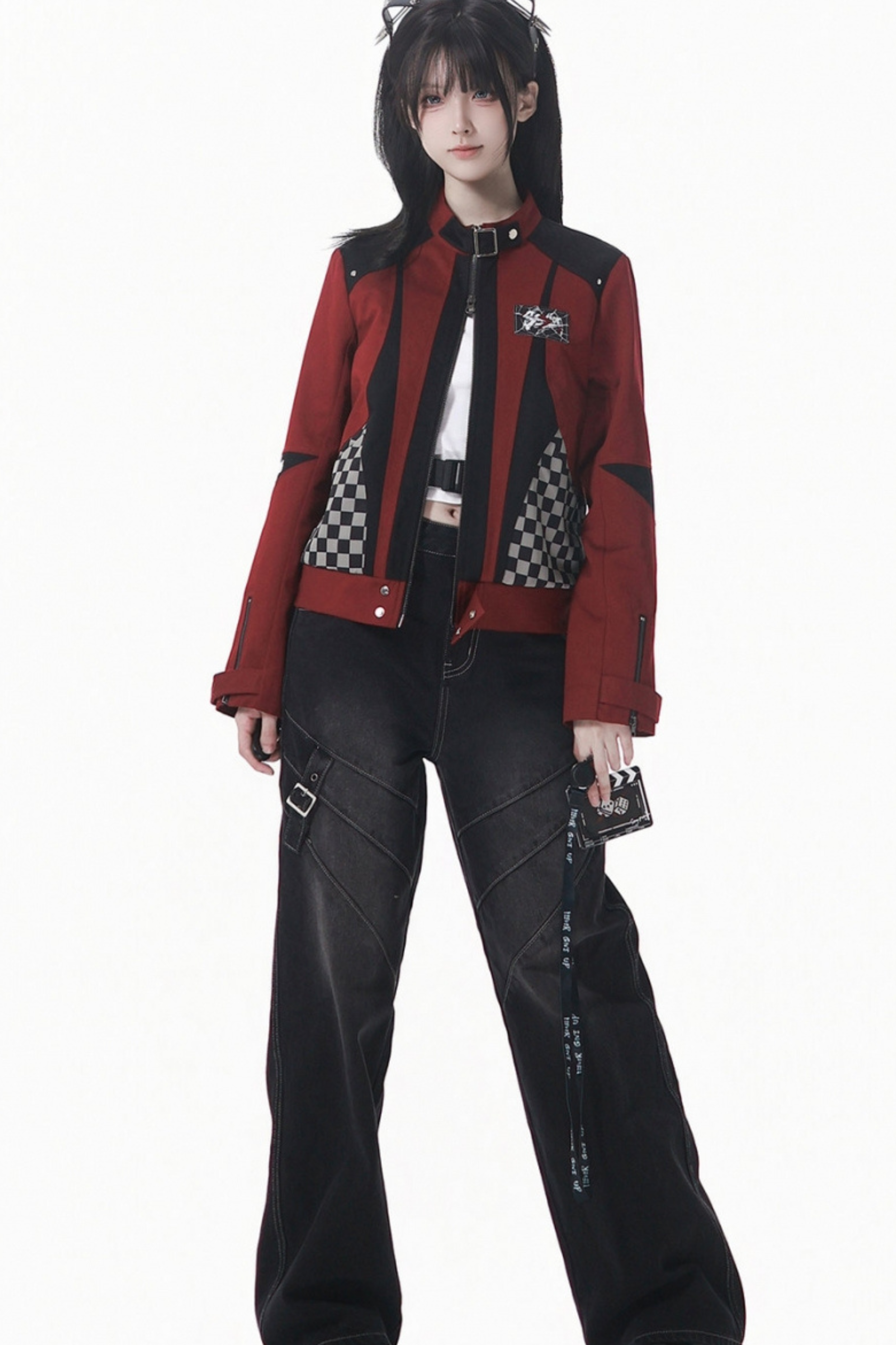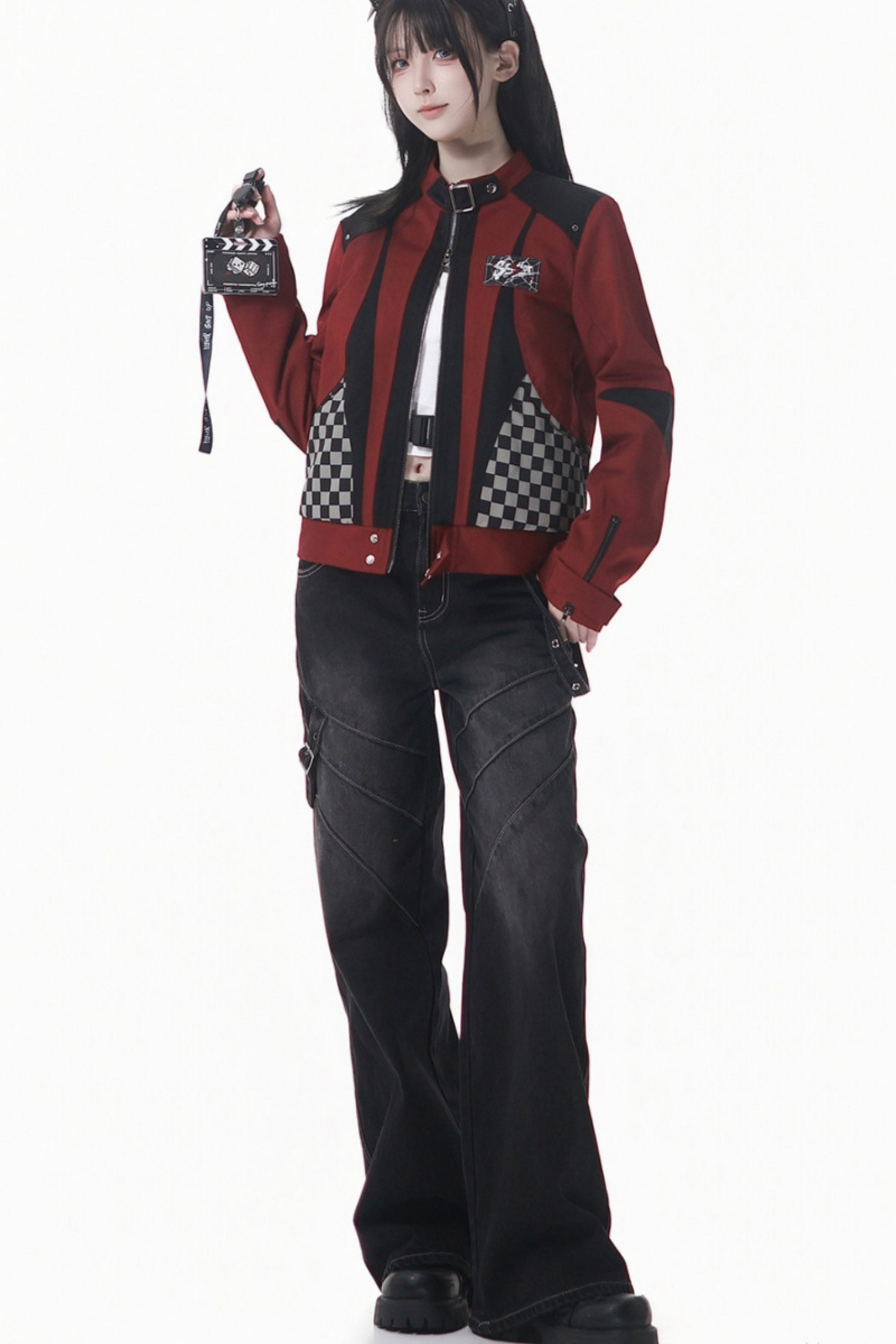 チェッカーボードオートバイジャケット+スウェット+デニムパンツ