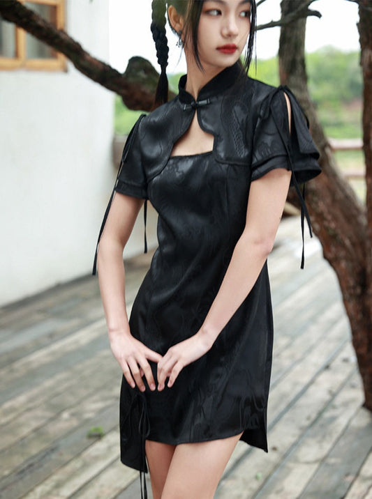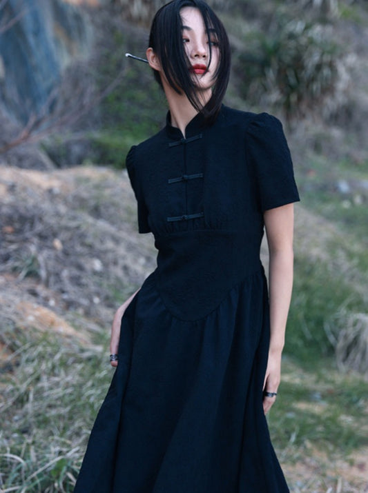 Chinesisches Stehkragen-Rosenkleid mit gerafften Schultern
