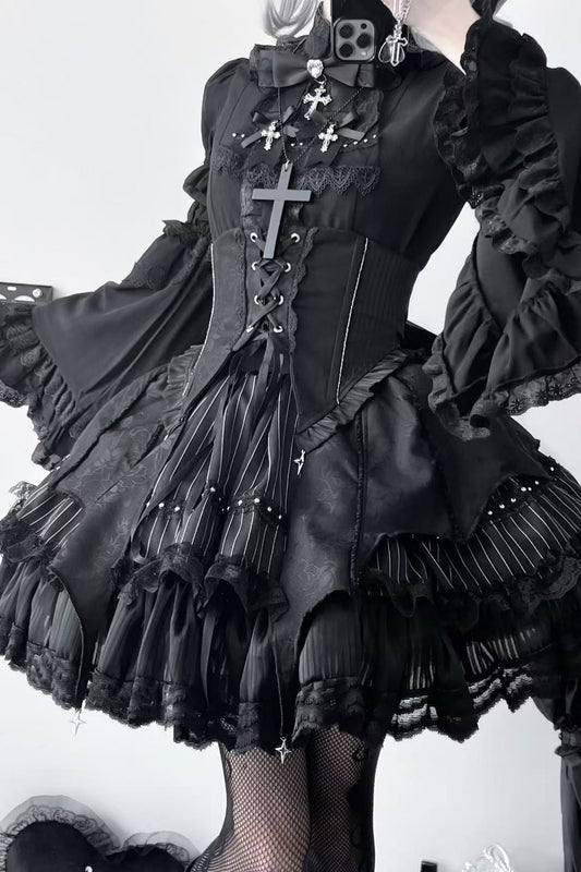 【予約商品】リボンスリーブ付きニットトップス+ゴシッククロスレースアップスカート