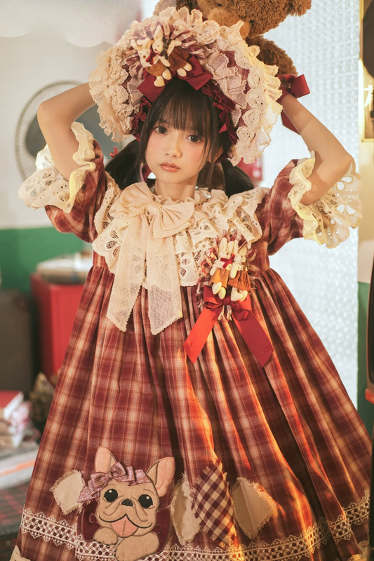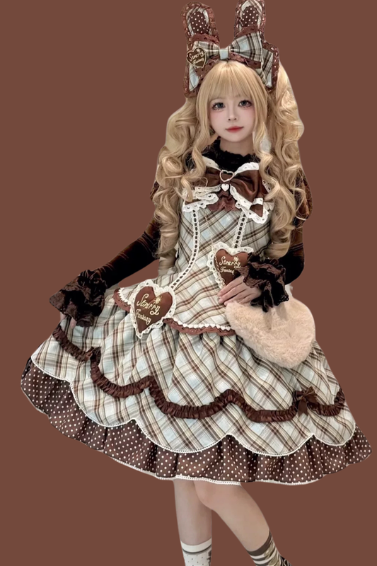 Kariertes Girly Lolita-Kuchen-Kleid + Haarreif + Haarband