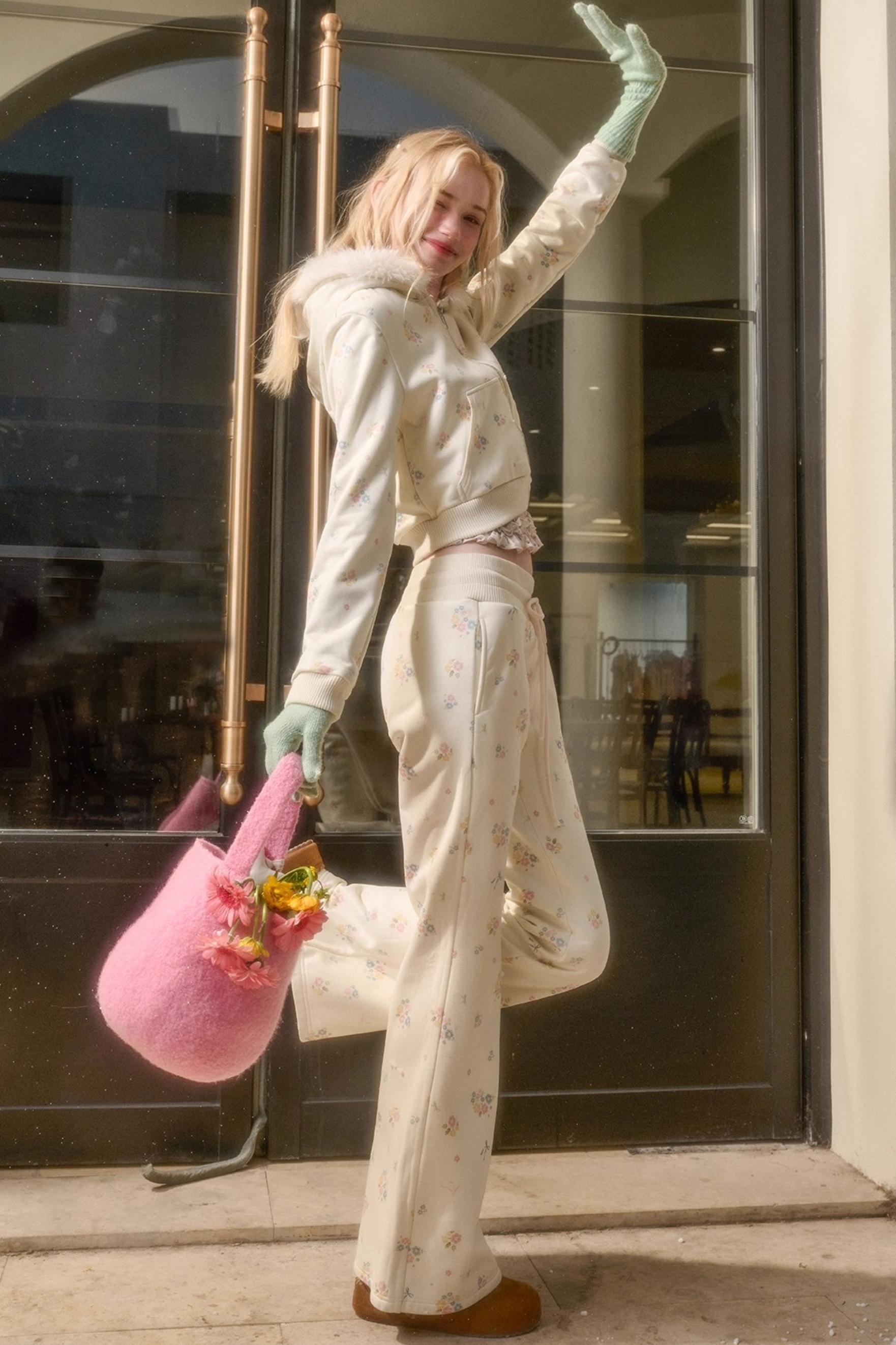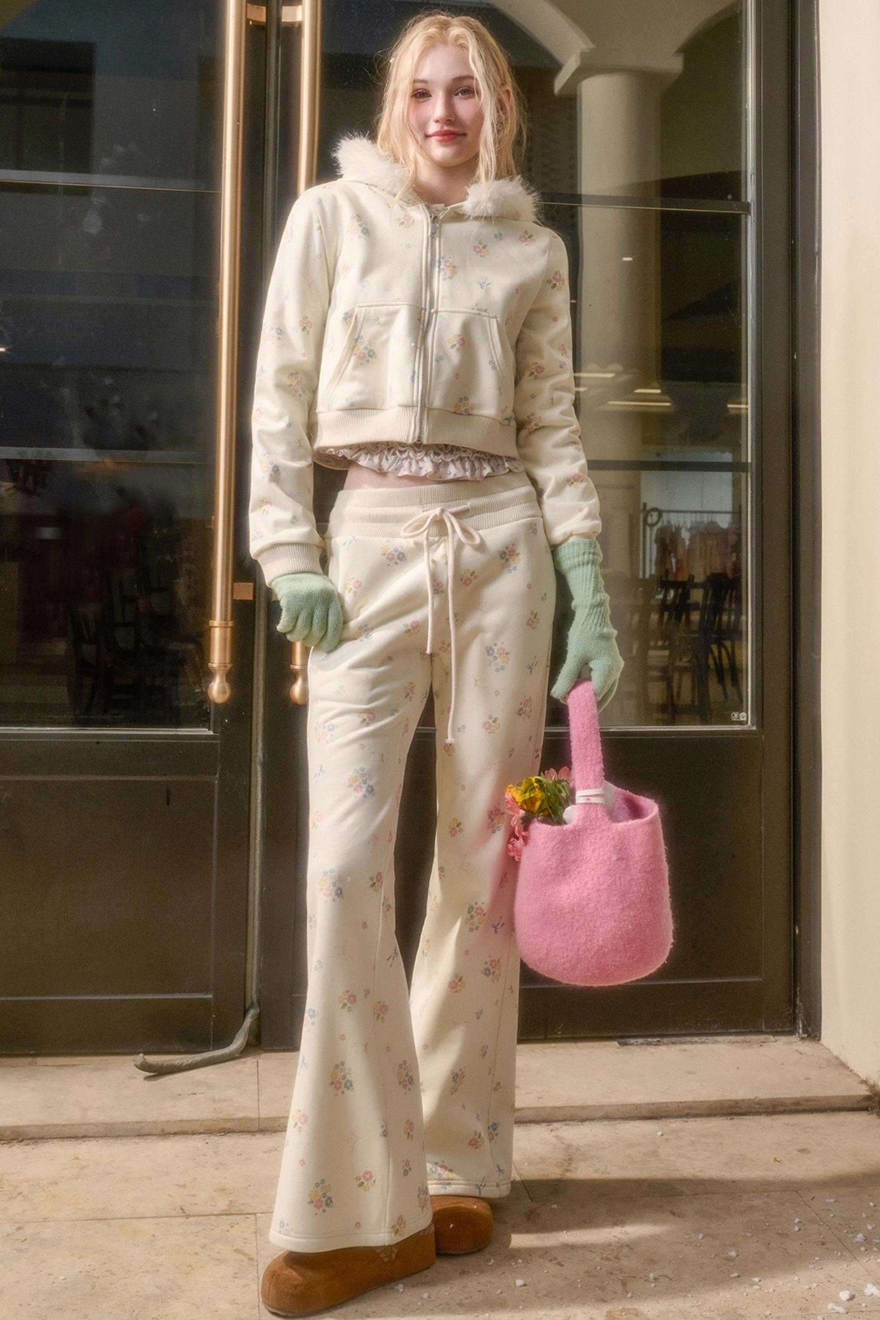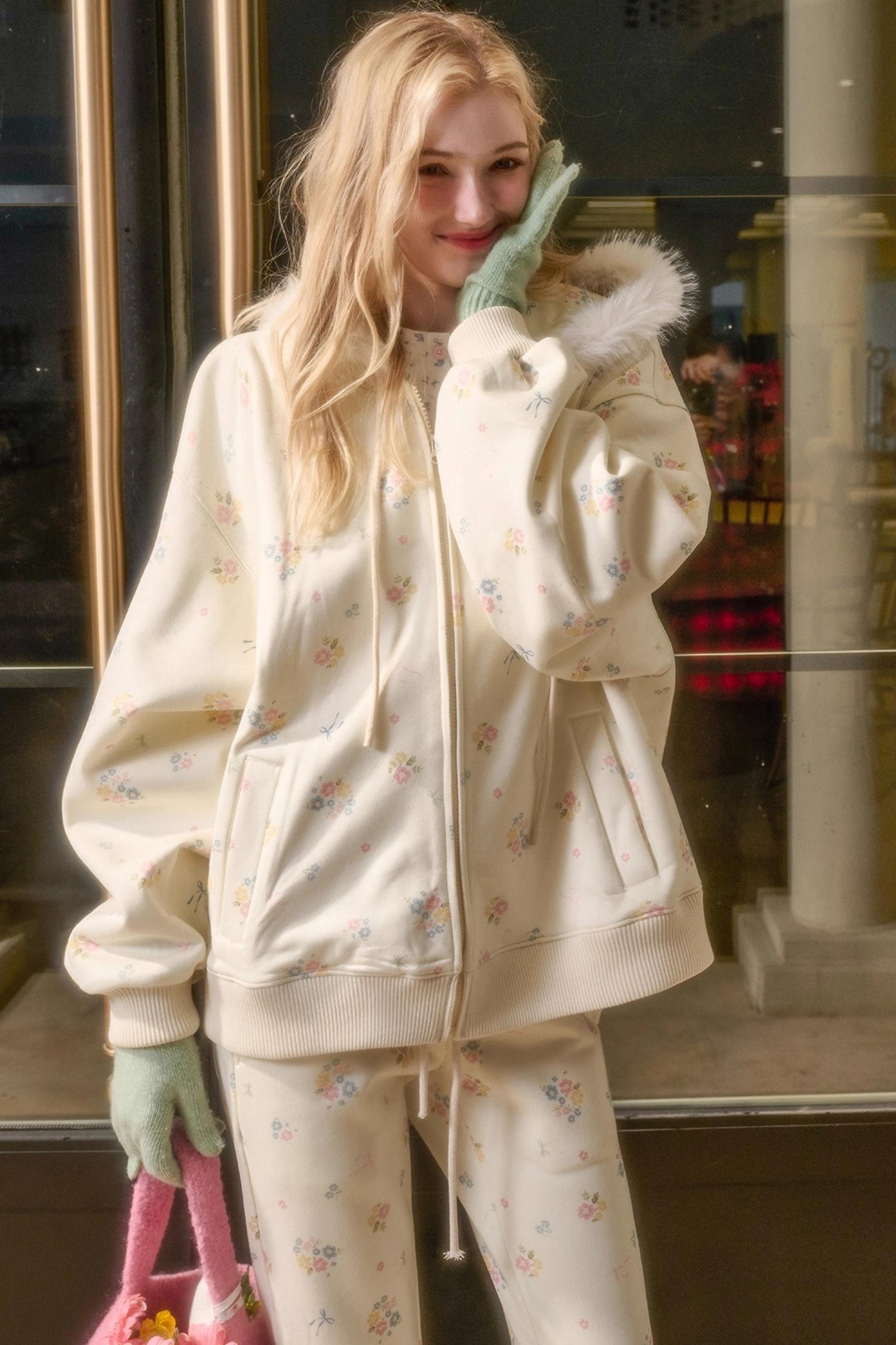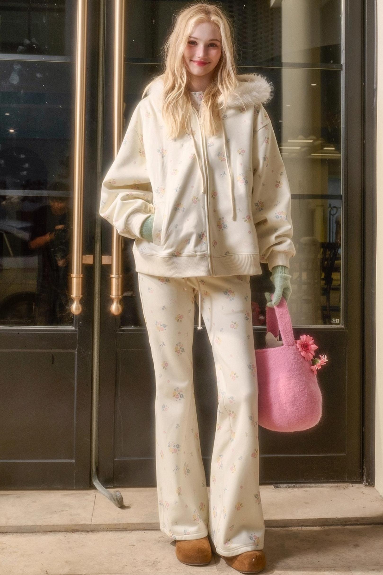 フローラルフラワーファーフードジャケット+ルーズコート+ロングパンツ
