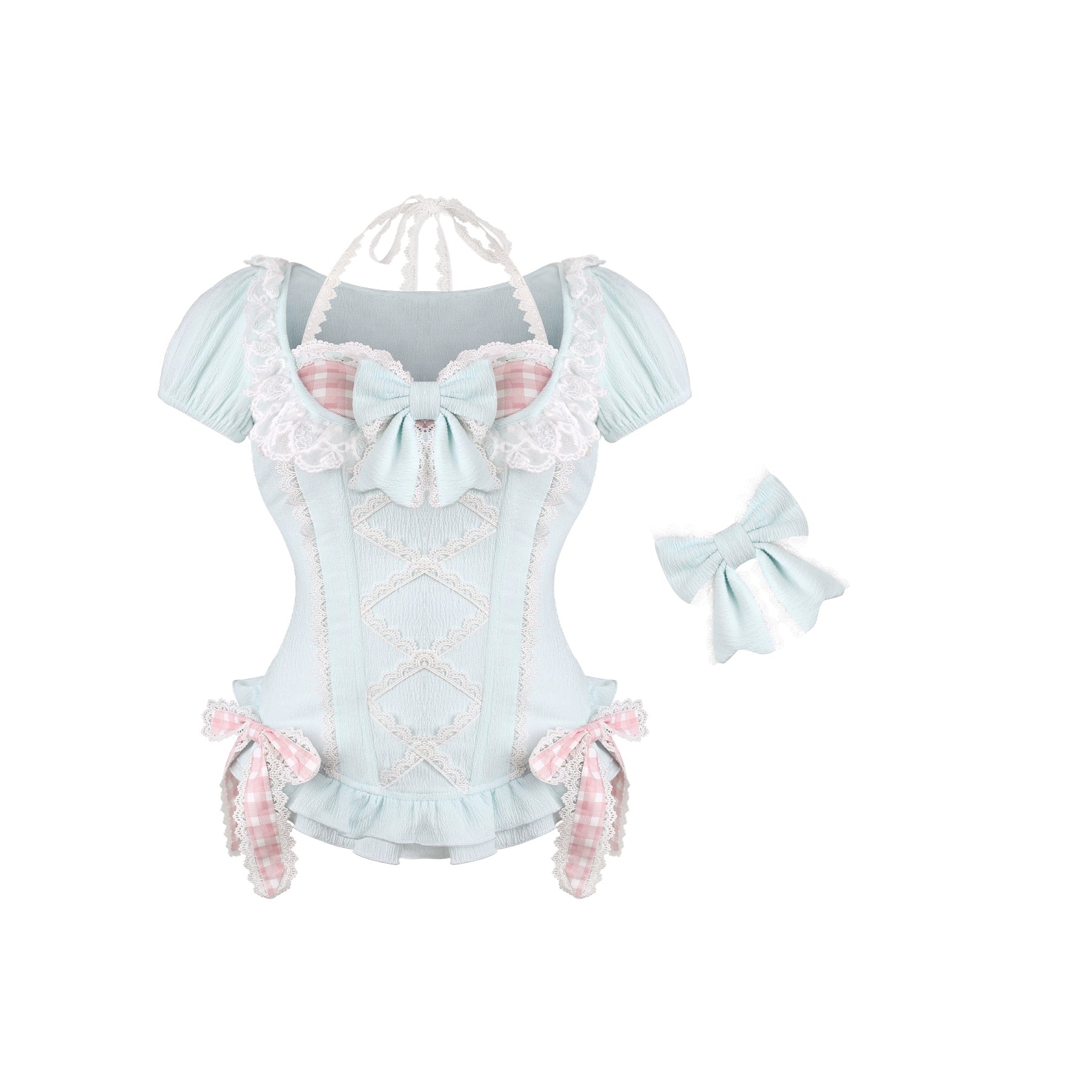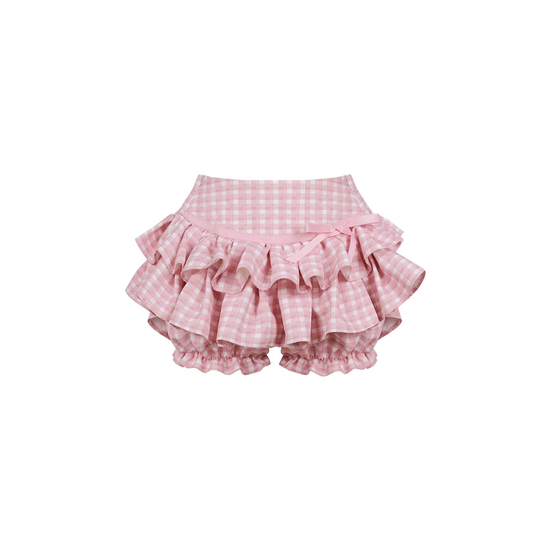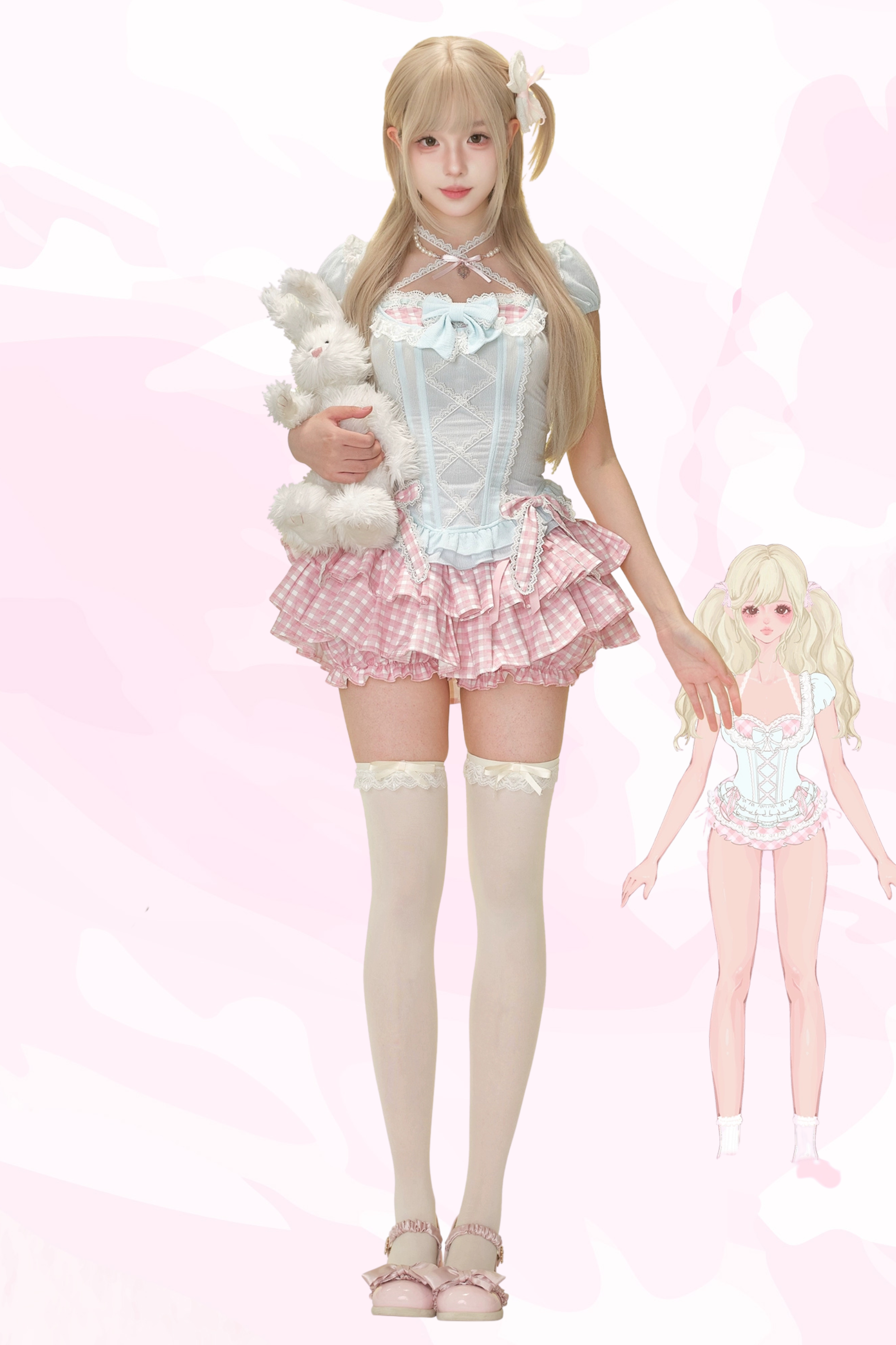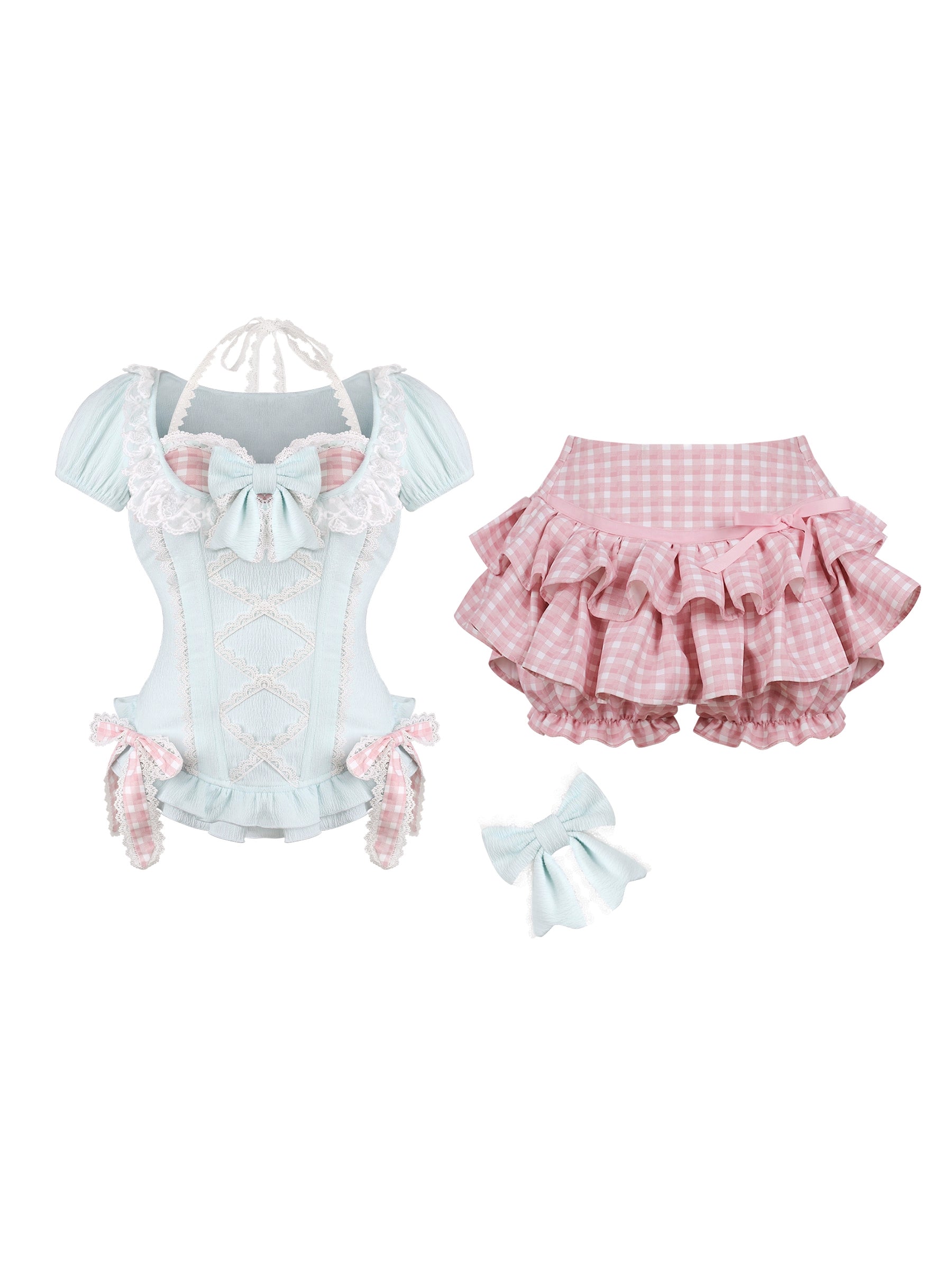 ミントコーンブルーリーリボン+ピンクチェックケーキスカート