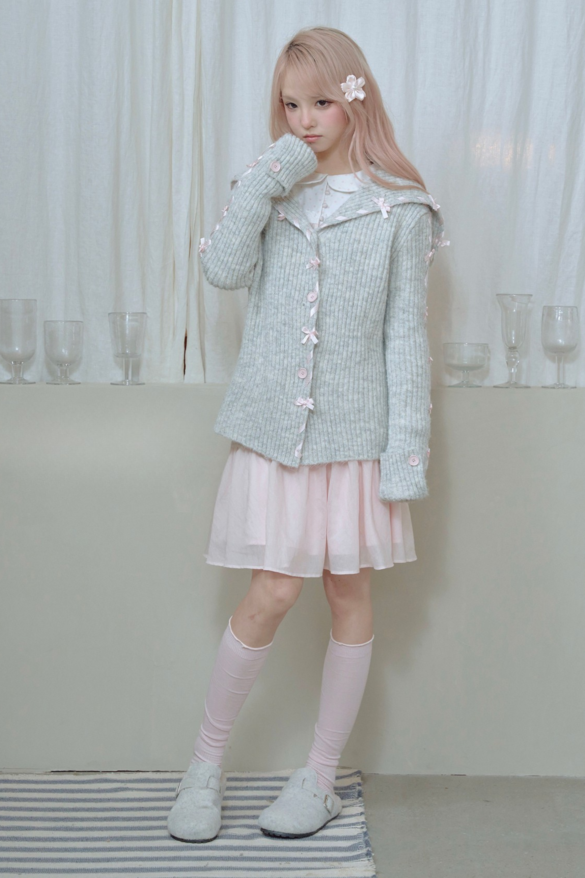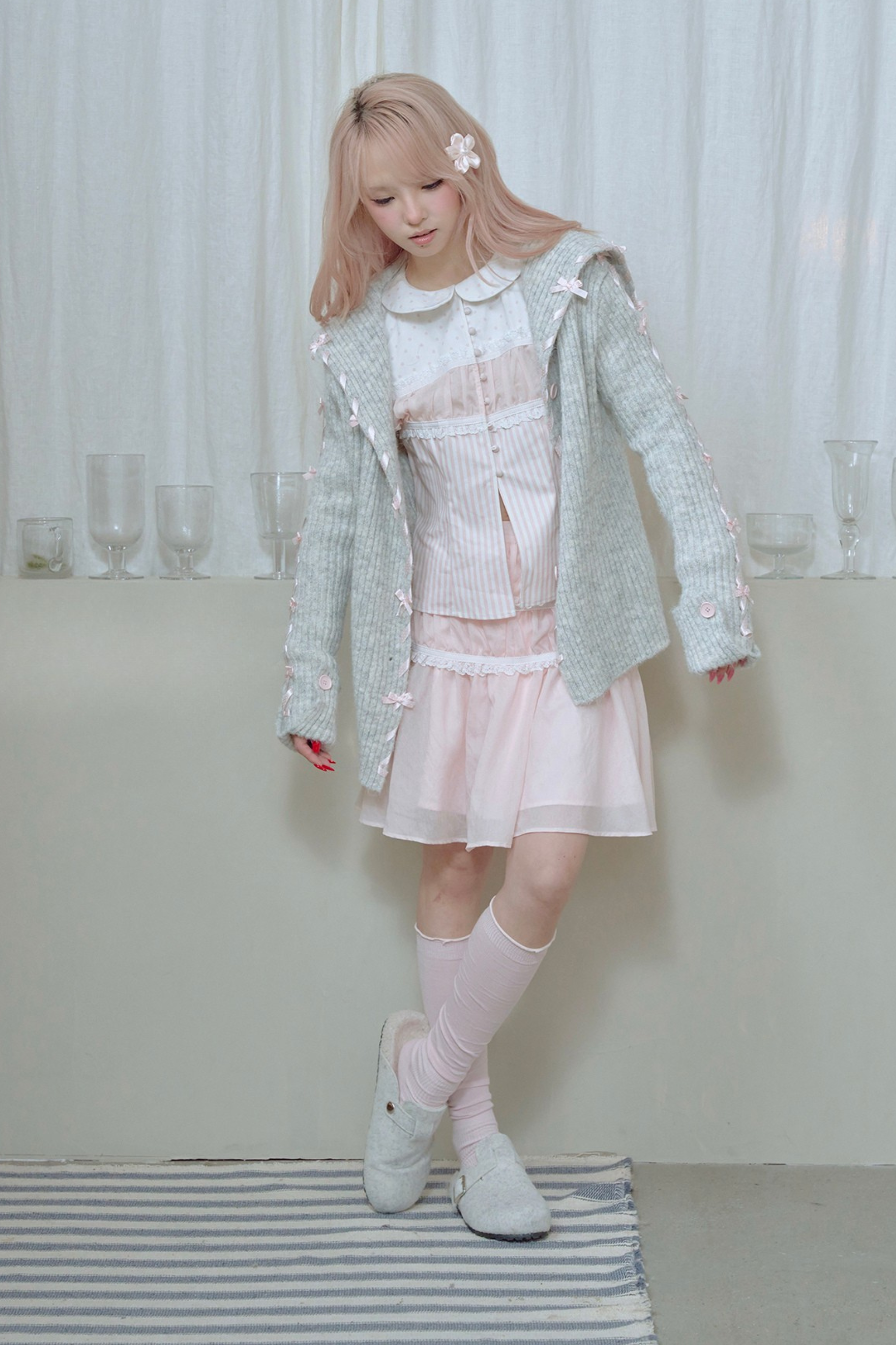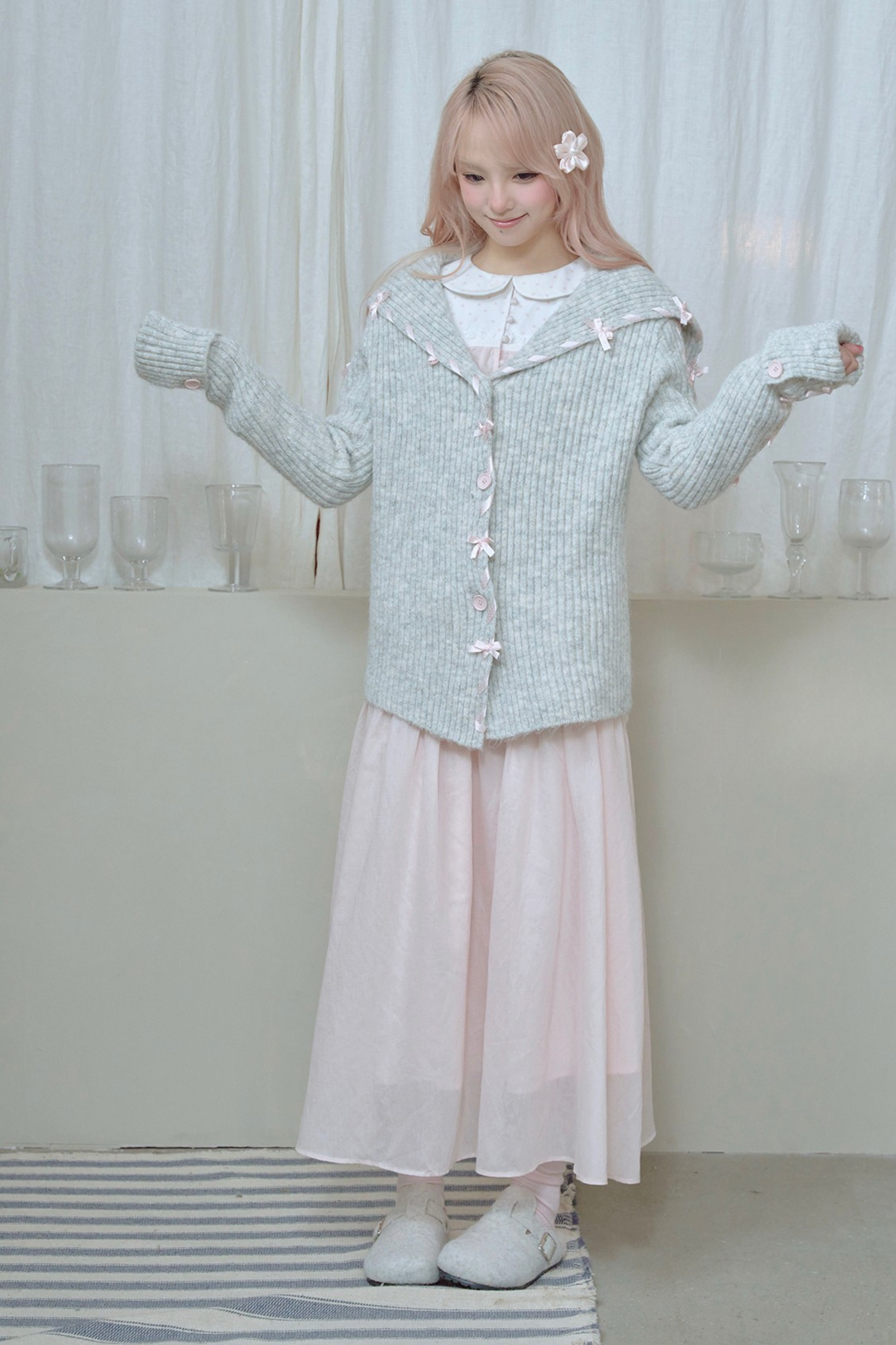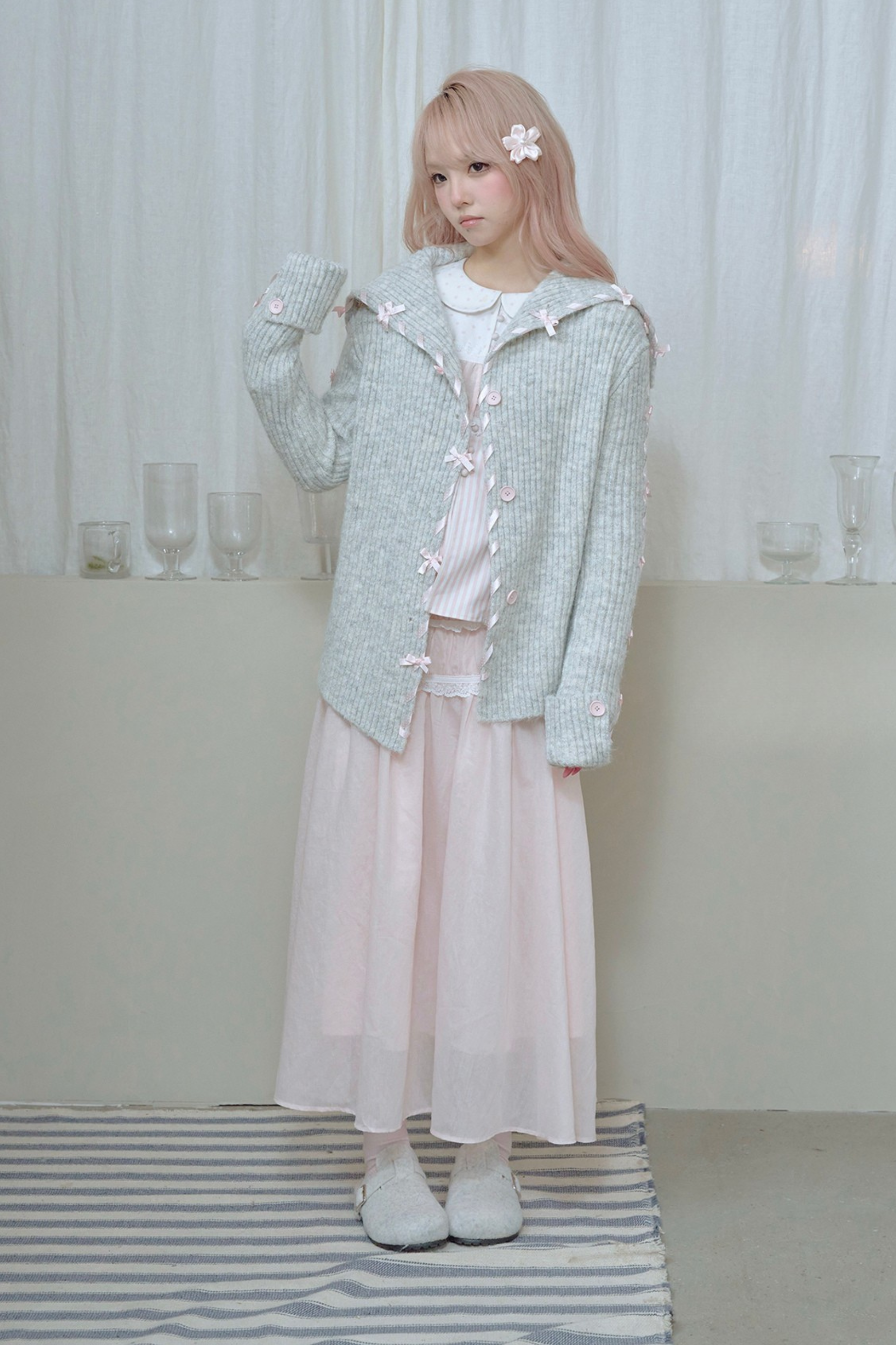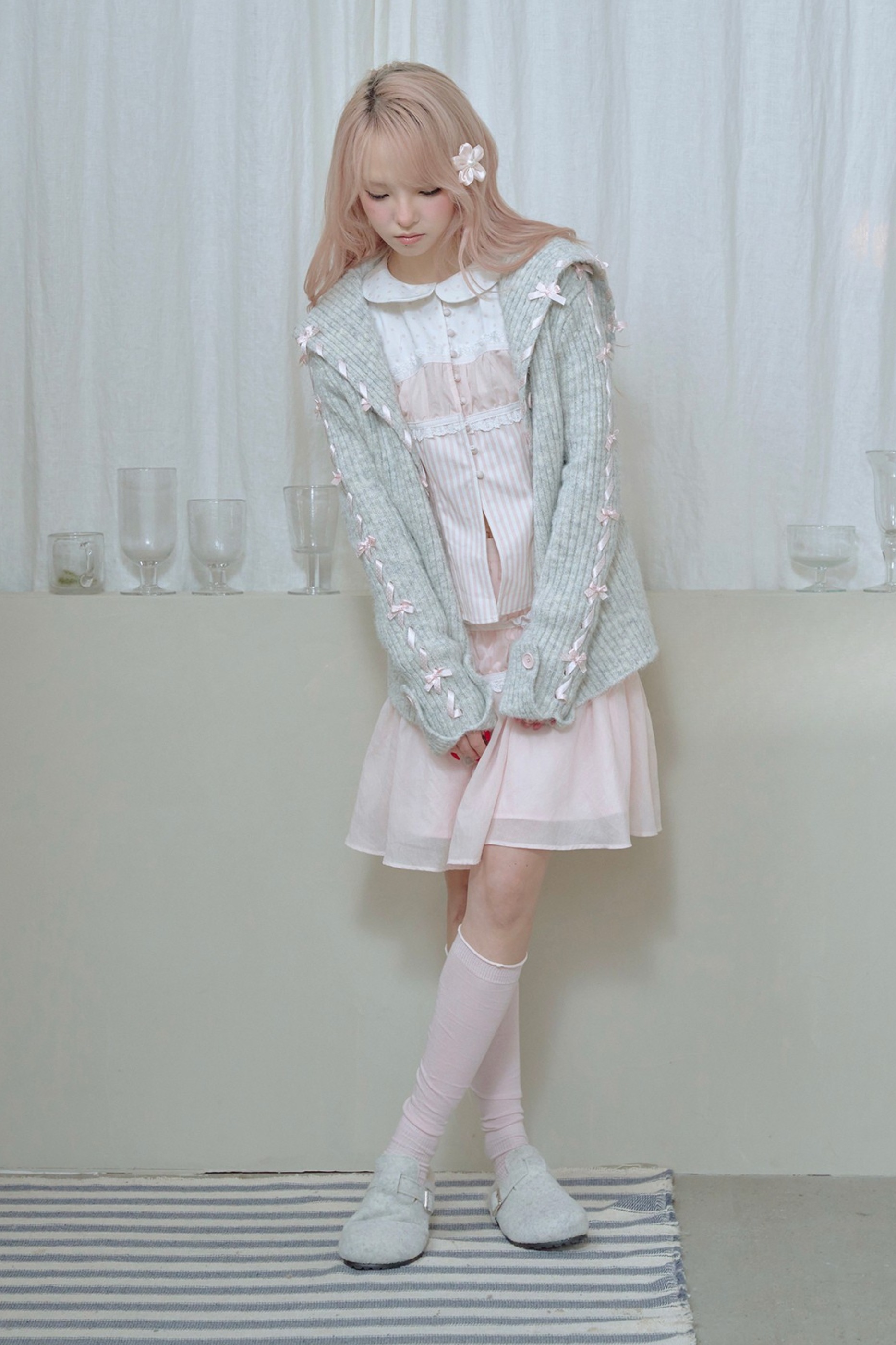 レースアップラインリボンニットカーディガン