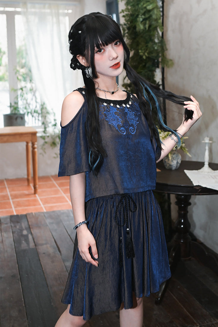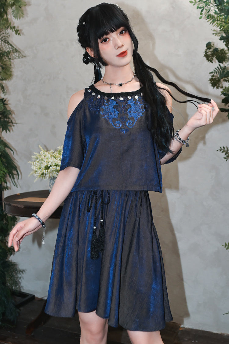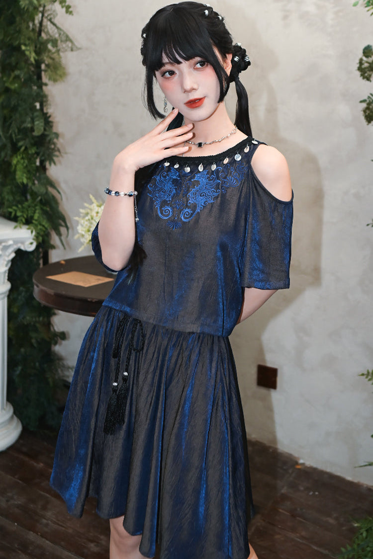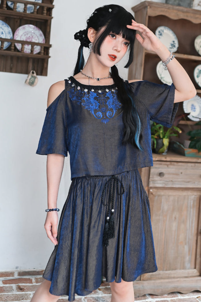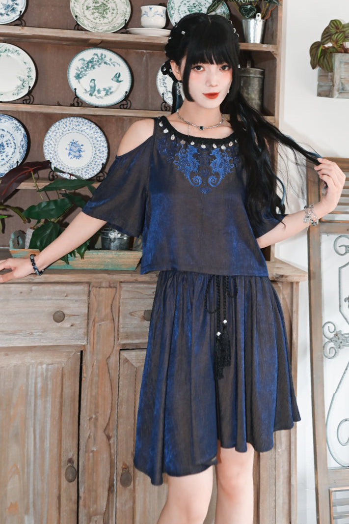 チャイナデザインオフショルダートップス+タッセルスカート