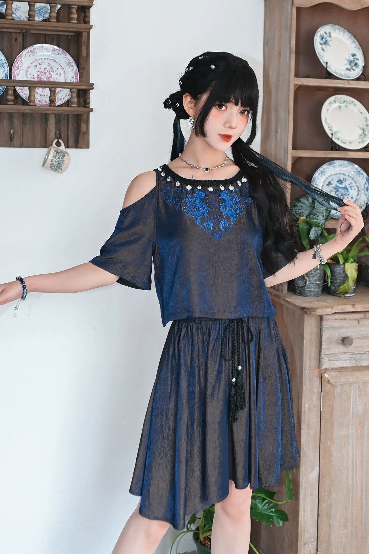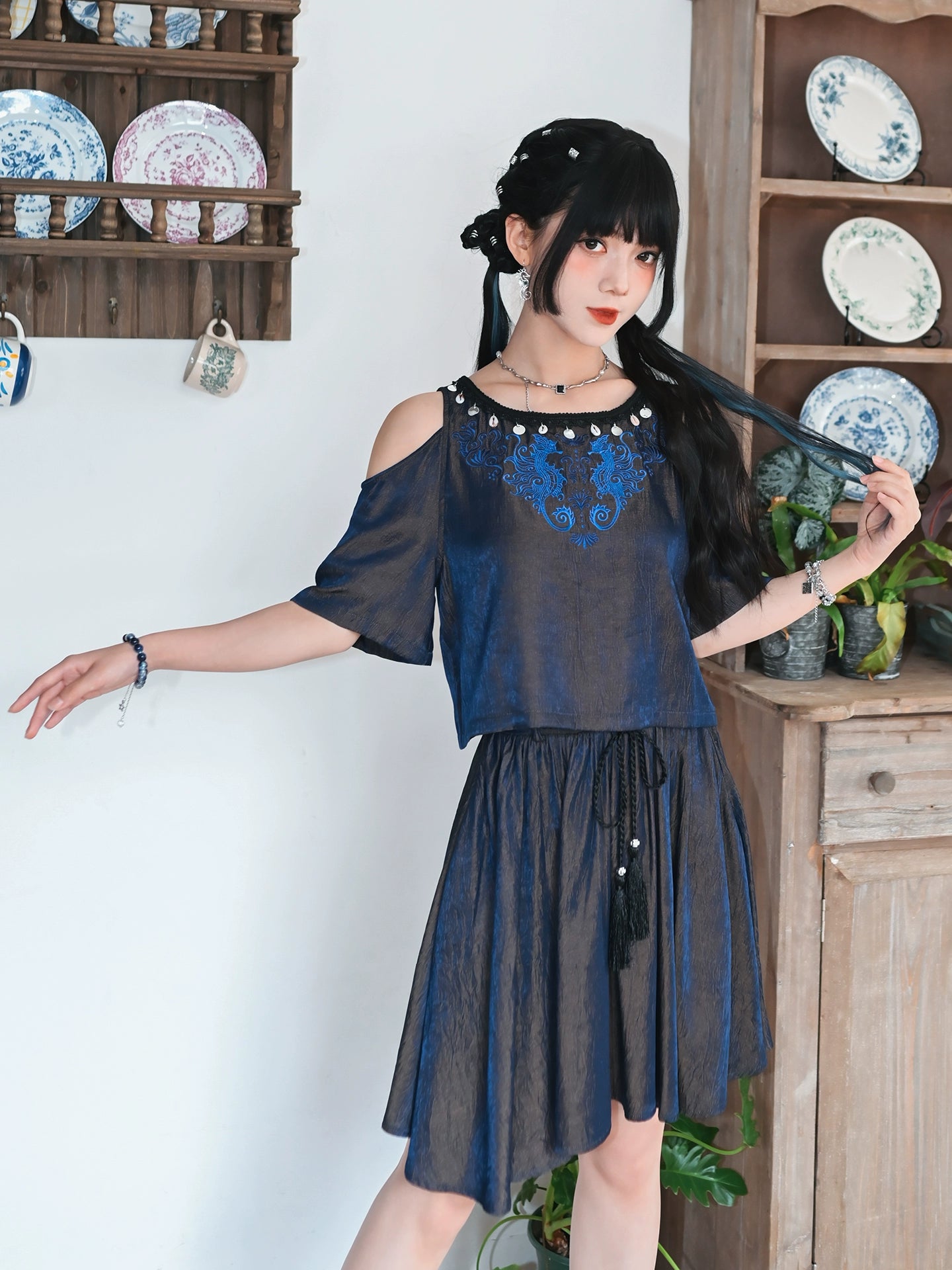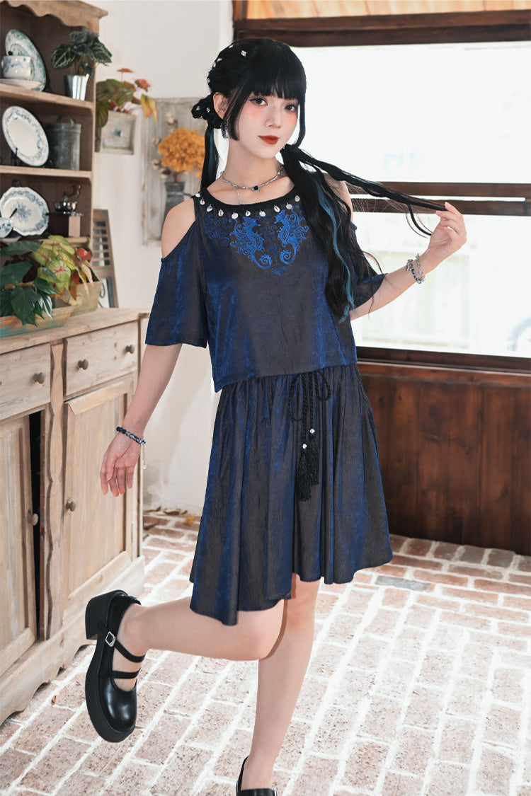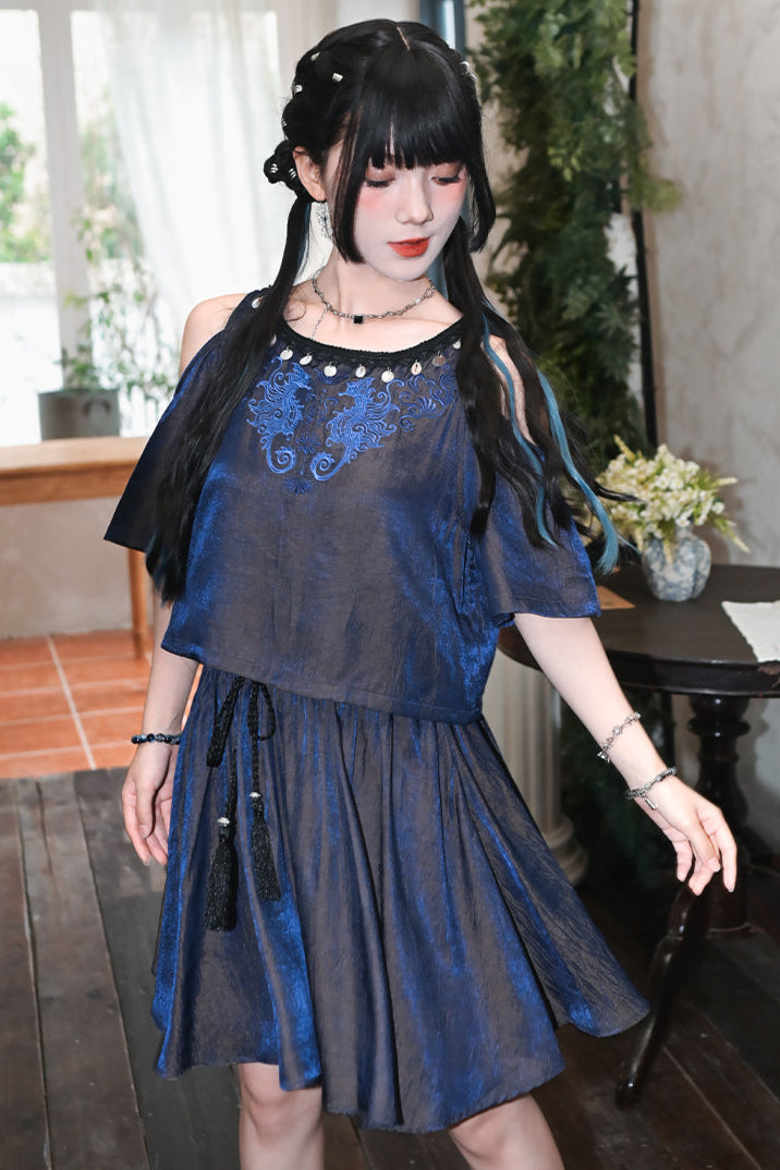 チャイナデザインオフショルダートップス+タッセルスカート