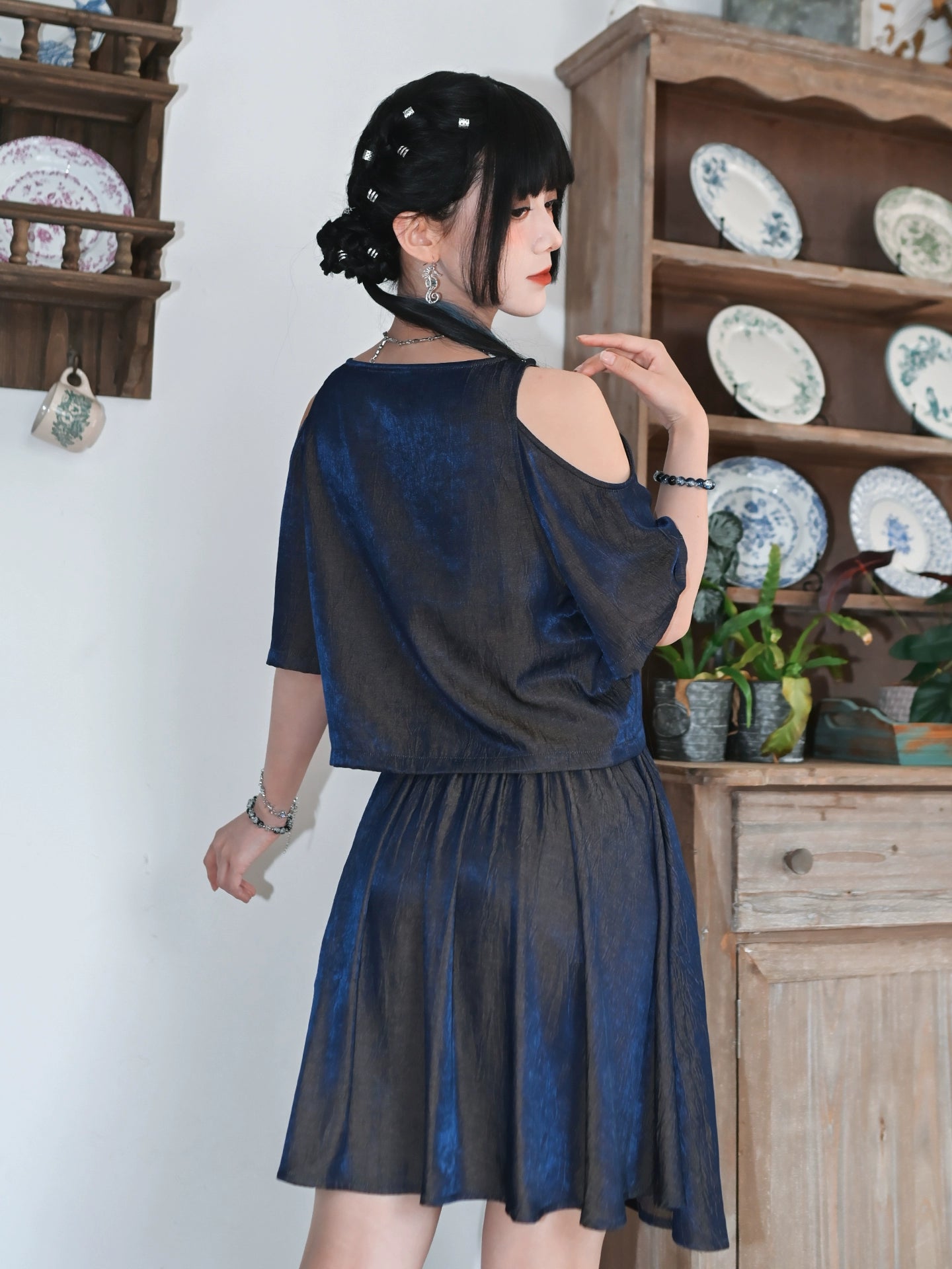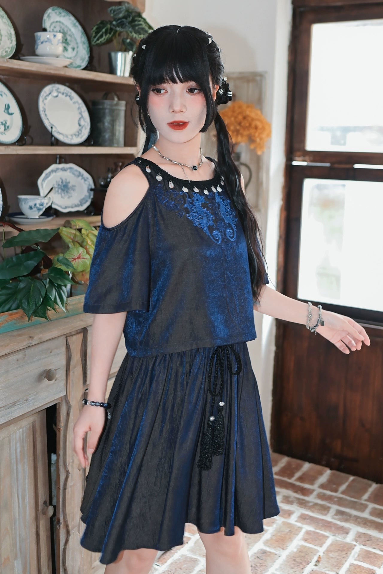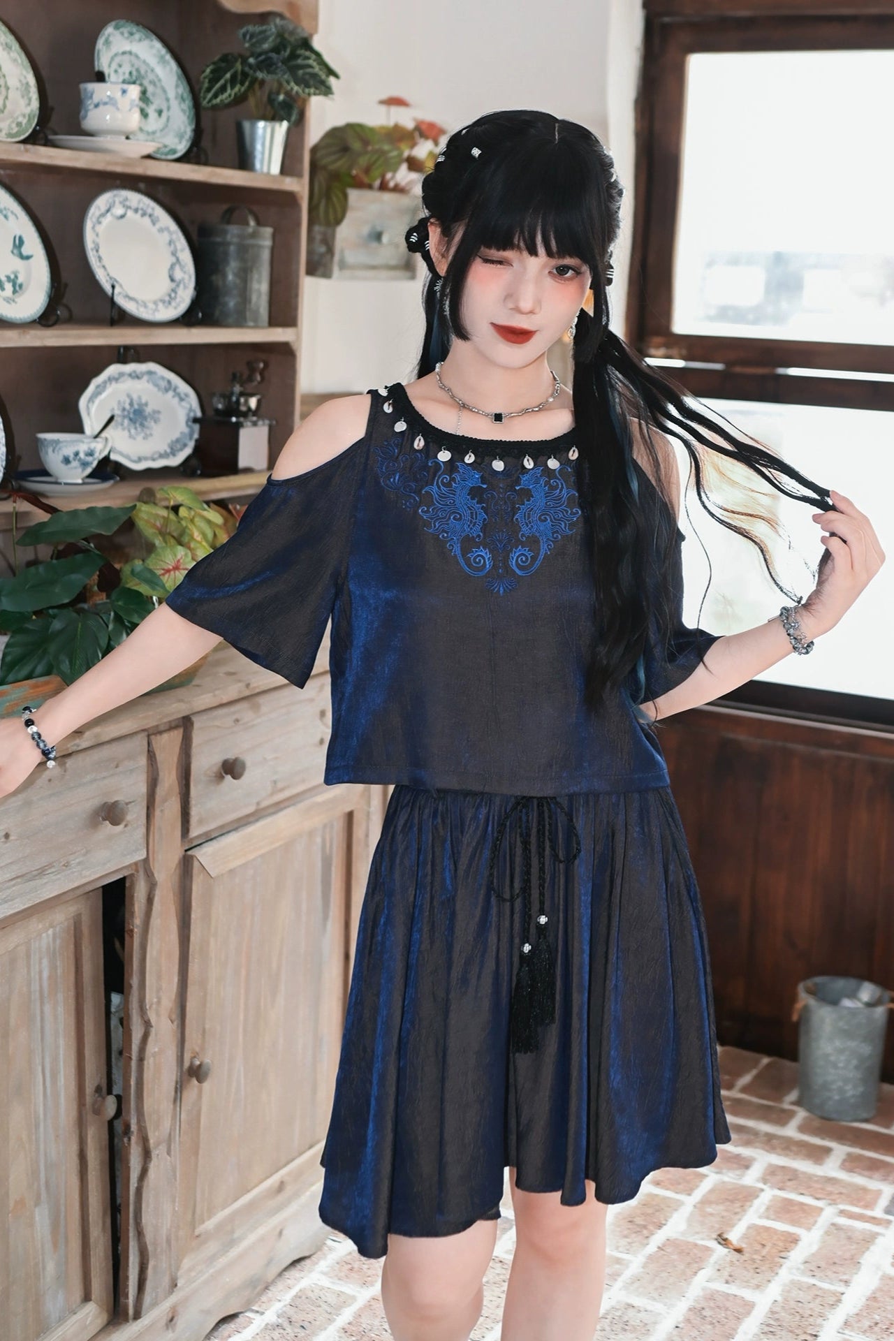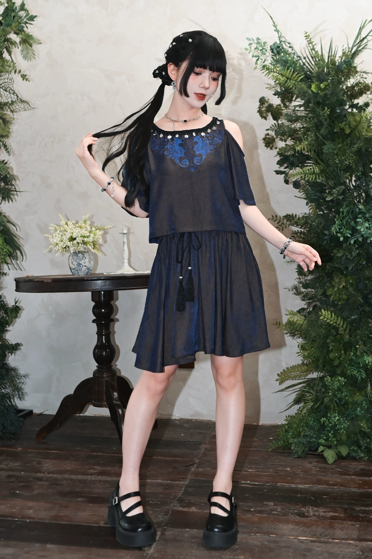 チャイナデザインオフショルダートップス+タッセルスカート
