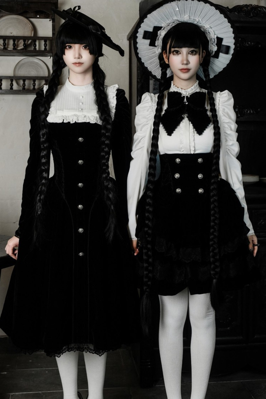 [Vorbestellung bis 14. März] Dunkles Gothic-Samtkleid + Hemd + Rock + Schleife