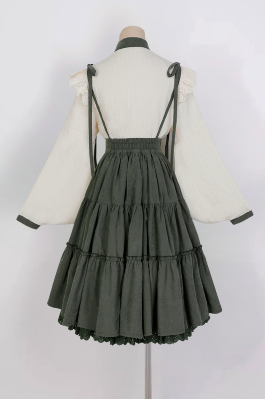 Große Schleifen-Bluse + Retro-Hosenträgerrock