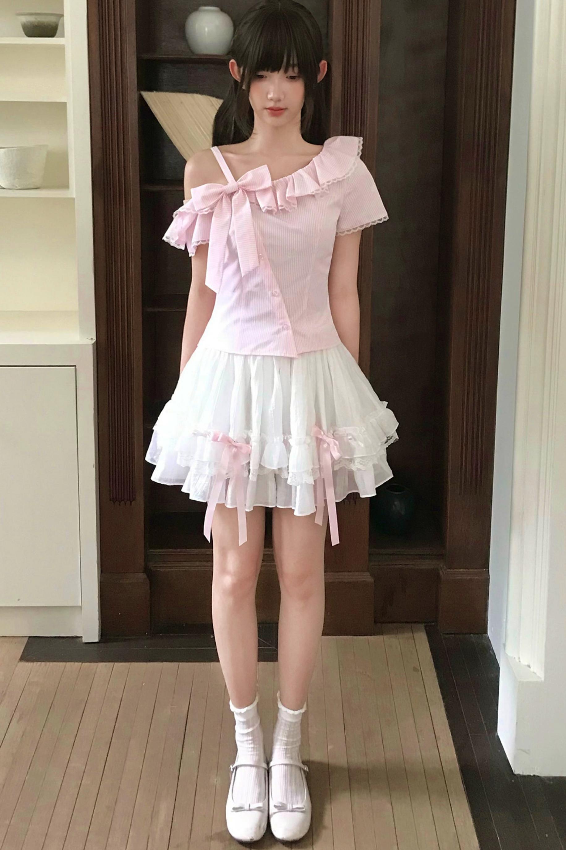 Flauschig-süßes schulterfreies Rüschen-Bluse + Rock ❤