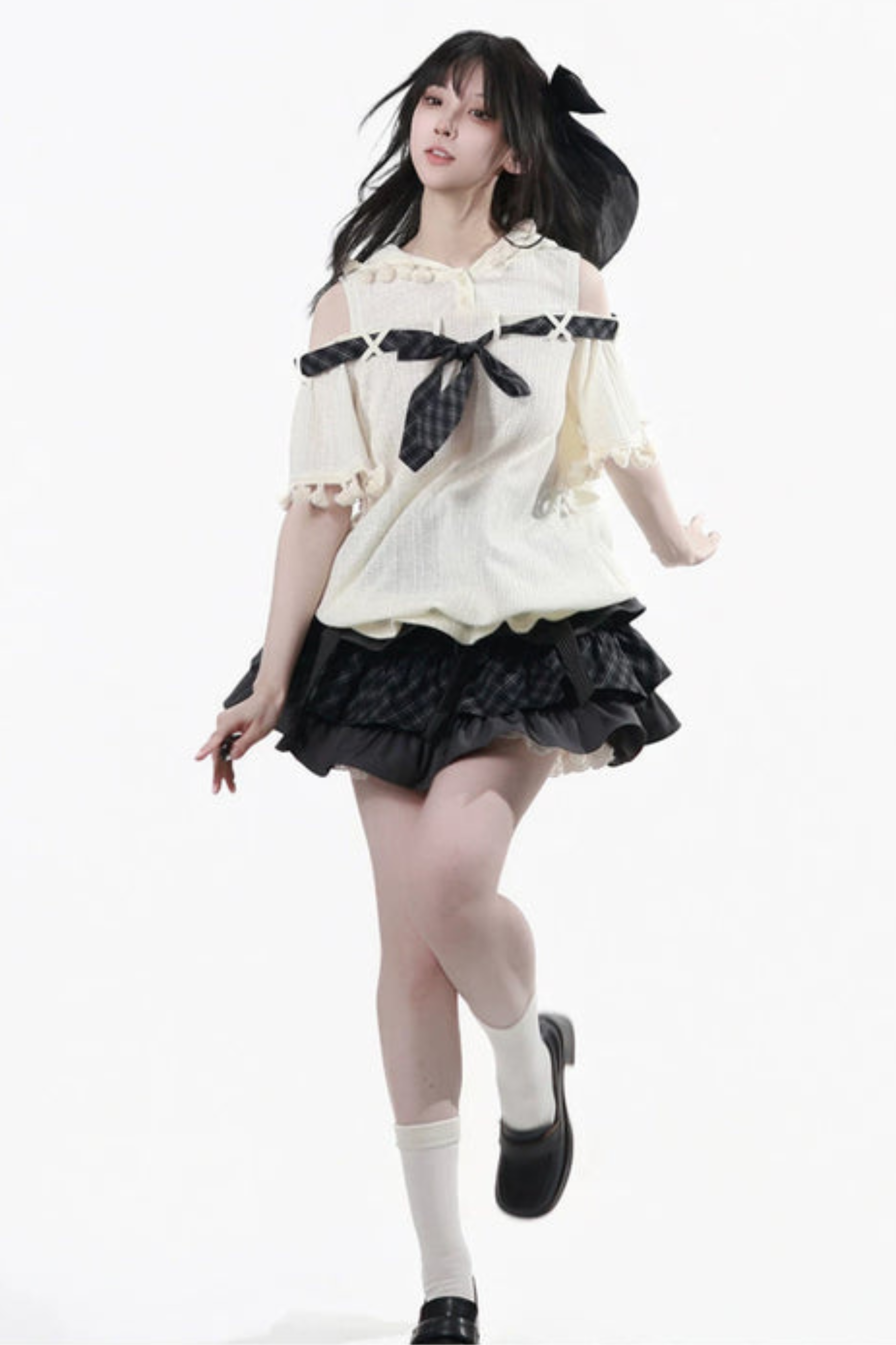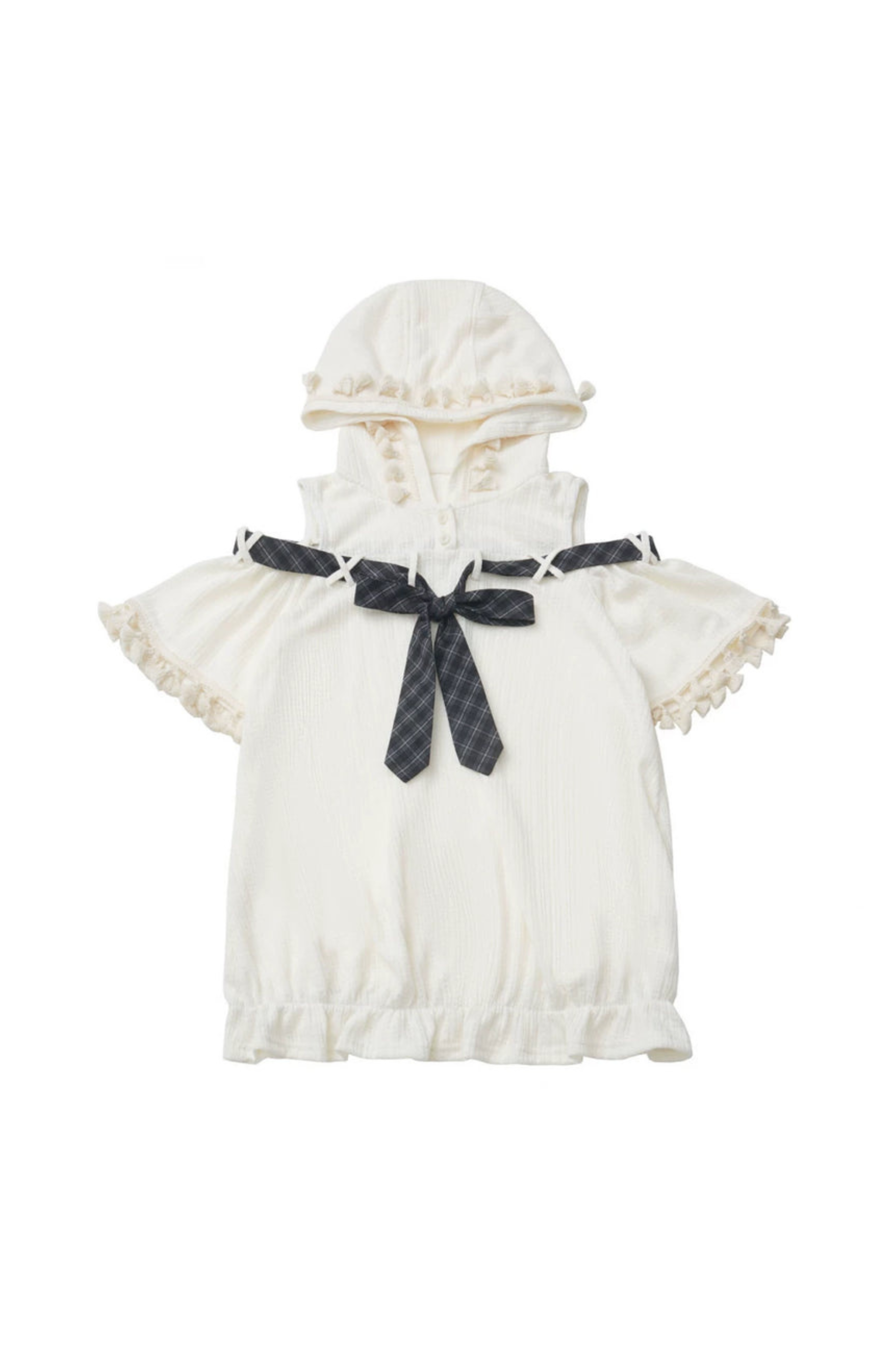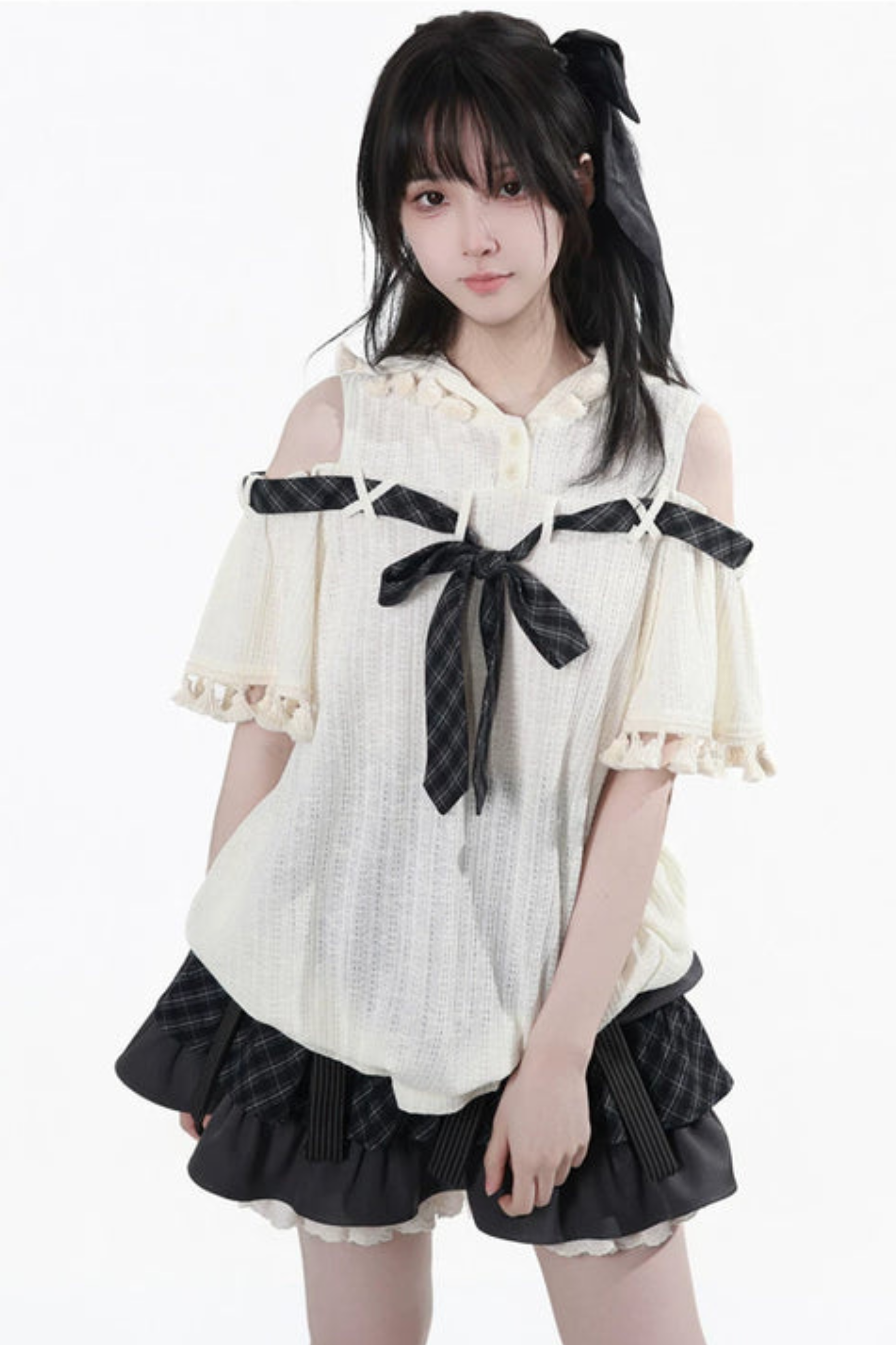 Schulterfreies Kapuzenoberteil + Rüschenoberteil + Stufenrock + Unterhemd