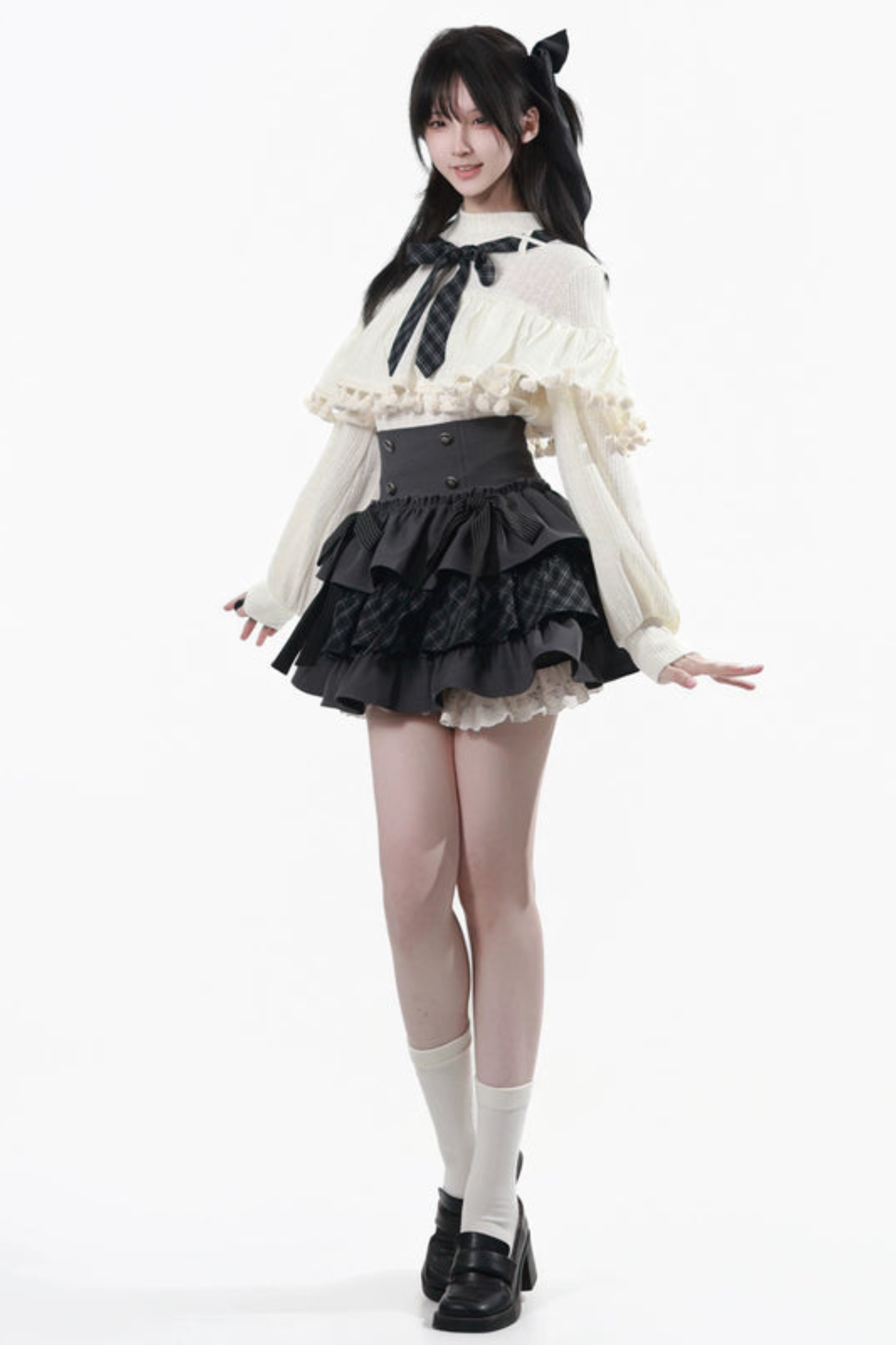❤ Schulterfreies Kapuzenoberteil + Rüschenoberteil + Stufenrock + Unterhemd ❤