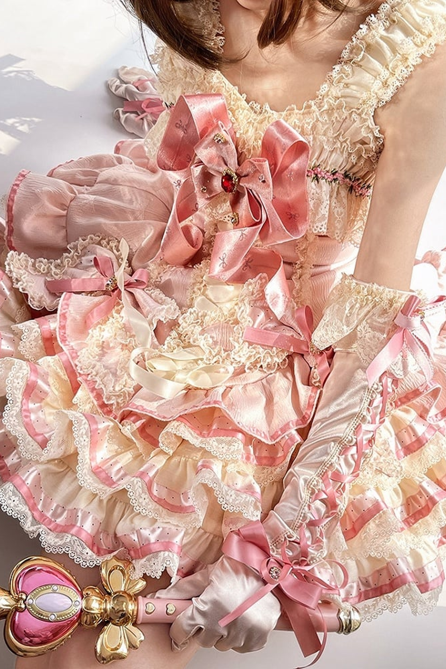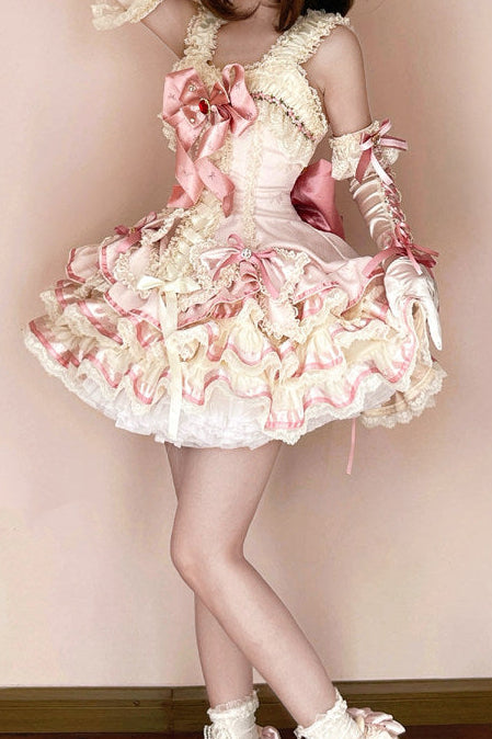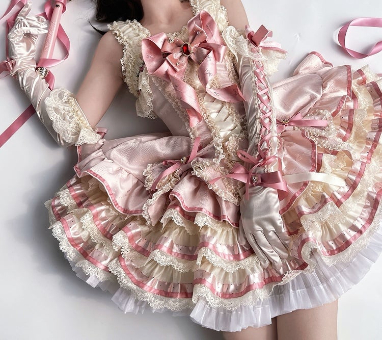 [Bestellfrist 30. April] Süßes Rosa-Lolita-Spitzen-Schleifenkorsett-Stufenrock-JSK-Kleid