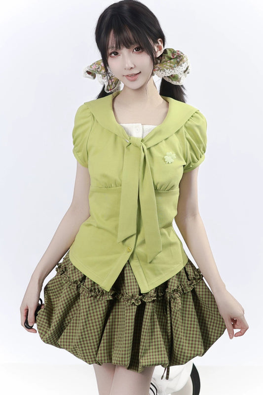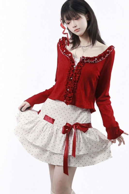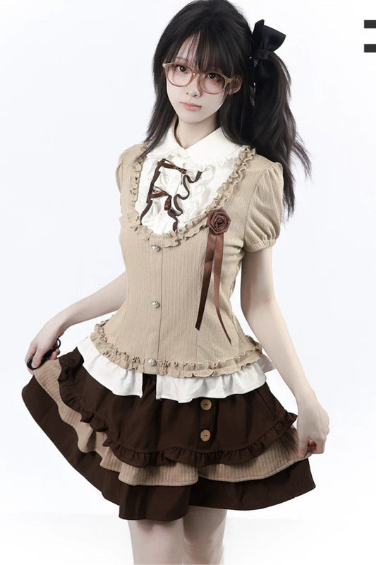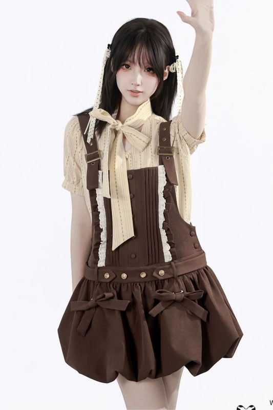 [Pre-order Deadline: April 29] Strawberry Rabbit Ear Ribbon Shirt + Ruffled Shoulder Lace Ribbon JK School Uniform Dress + Full Set/Complete Set