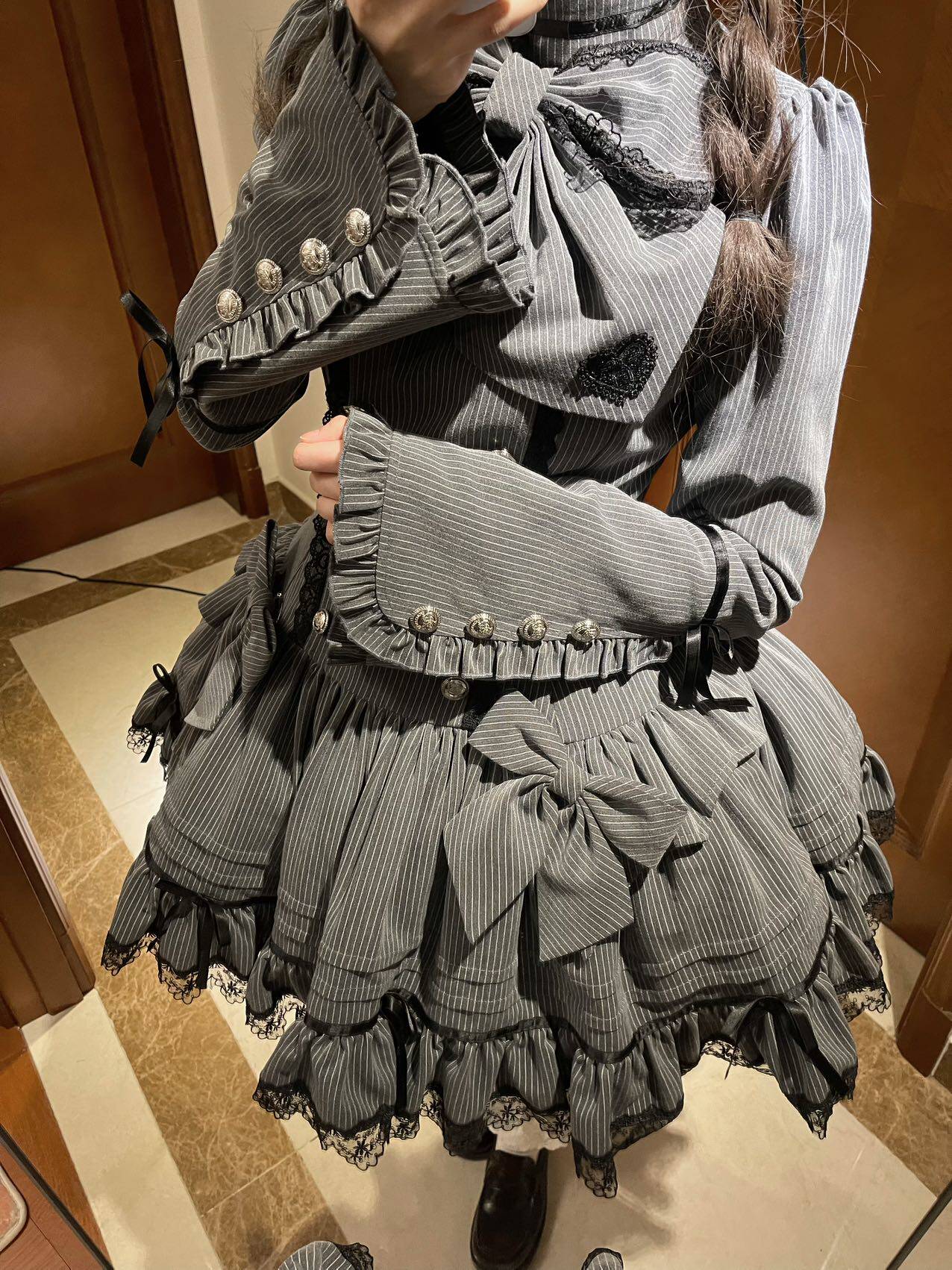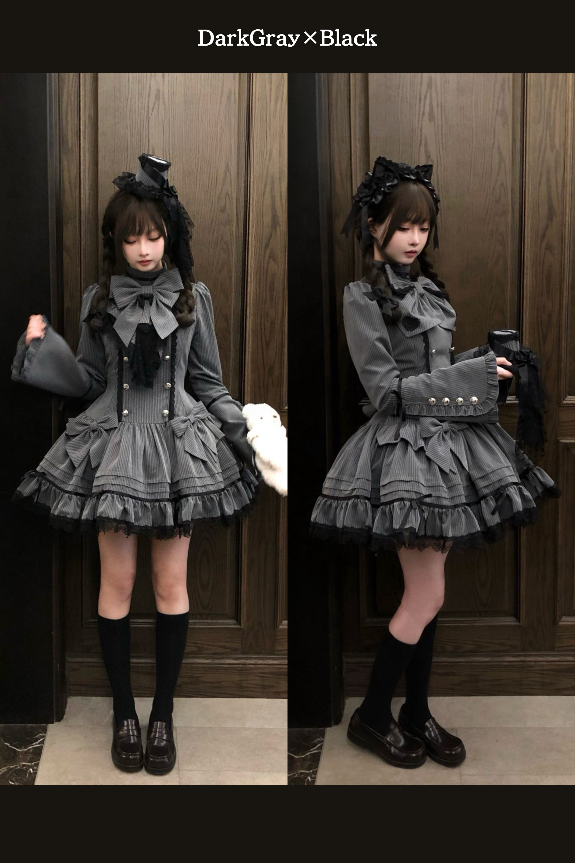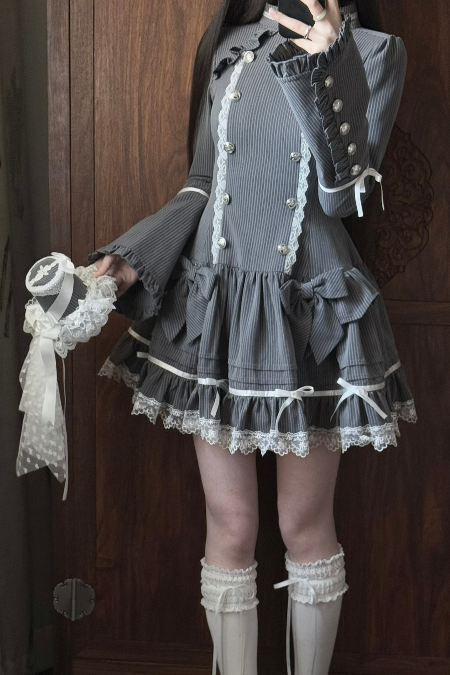 ❤︎[Pre-order Deadline: April 25] Phantom Cat Sweet Ribbon Gray Stripe Lace Bell Sleeve Lolita Dress❤︎ ⚠️Due to the popularity of this product, it may take 4-6 months to deliver