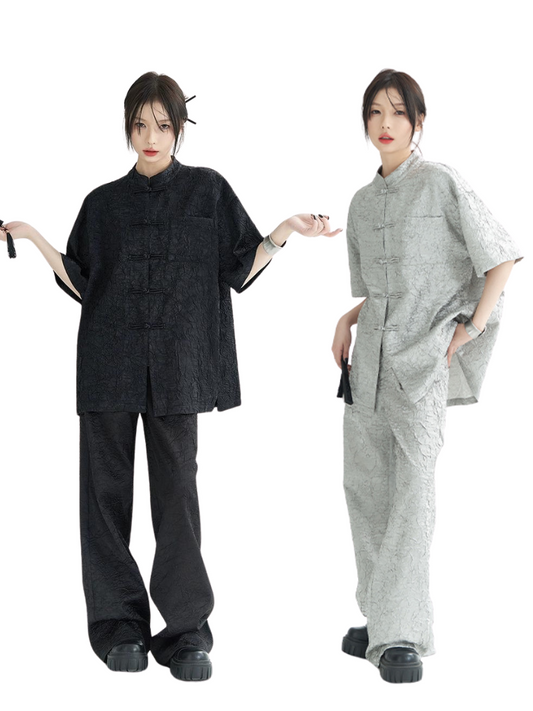 Retro Rose Print Stitch Shirt + Pleated Slit Skirt