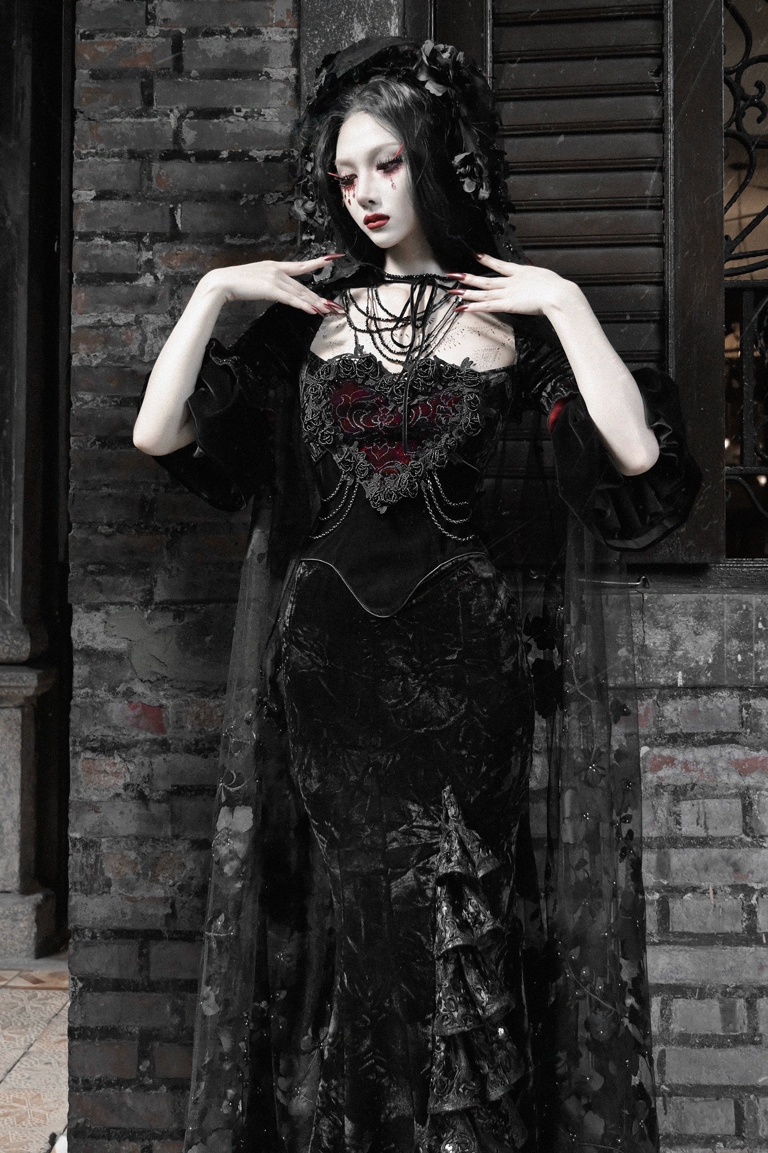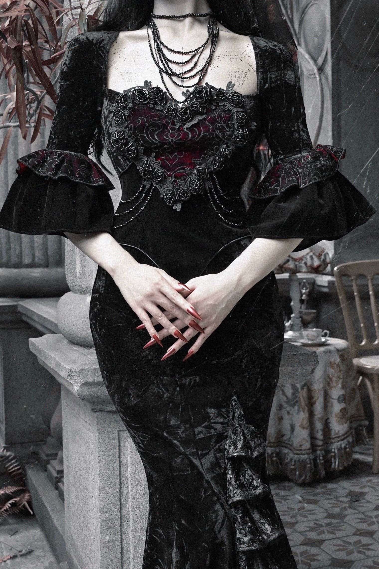 Thriller Crimson Gothic Velvet Mermaid Dress + Gloves