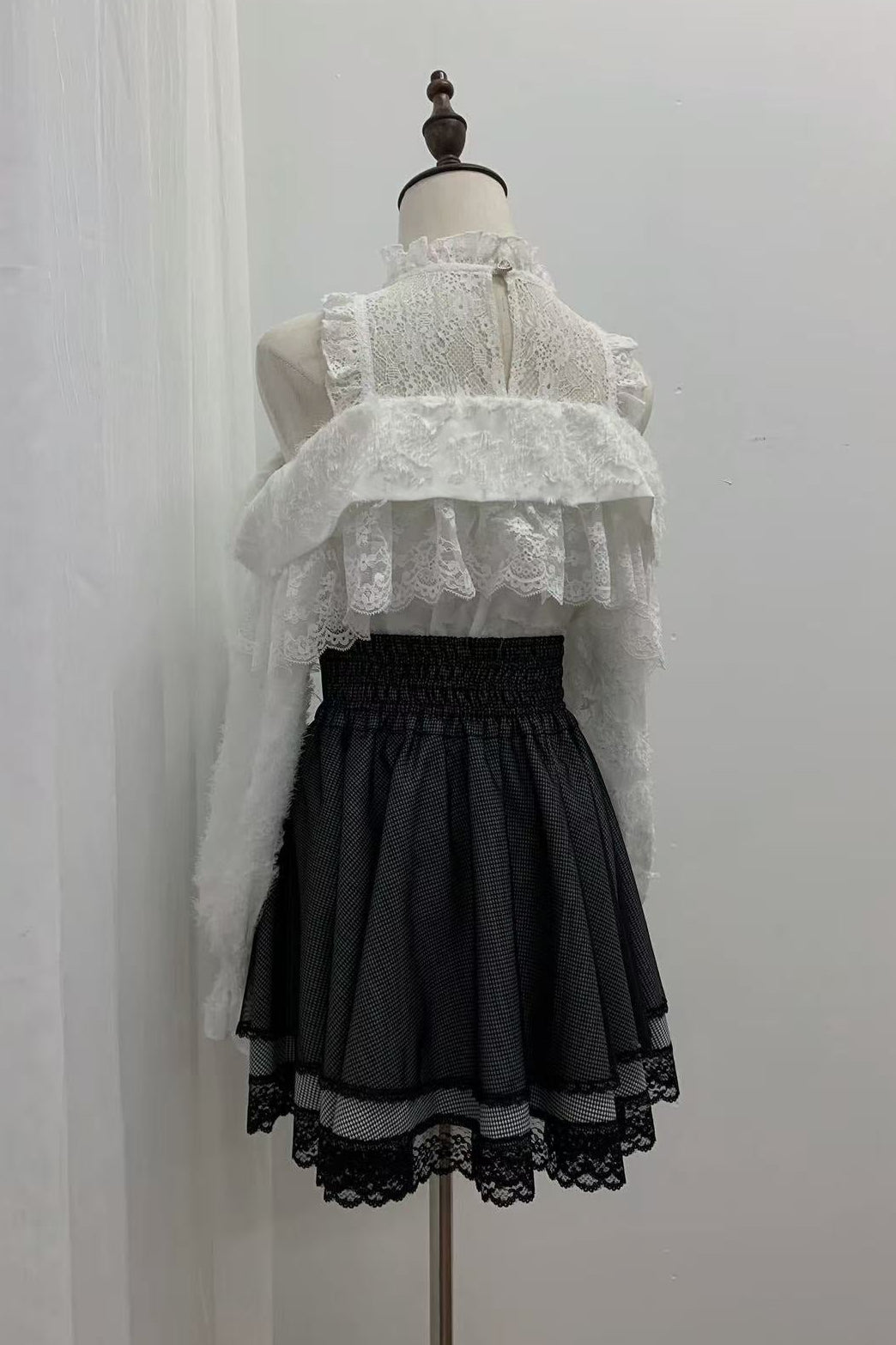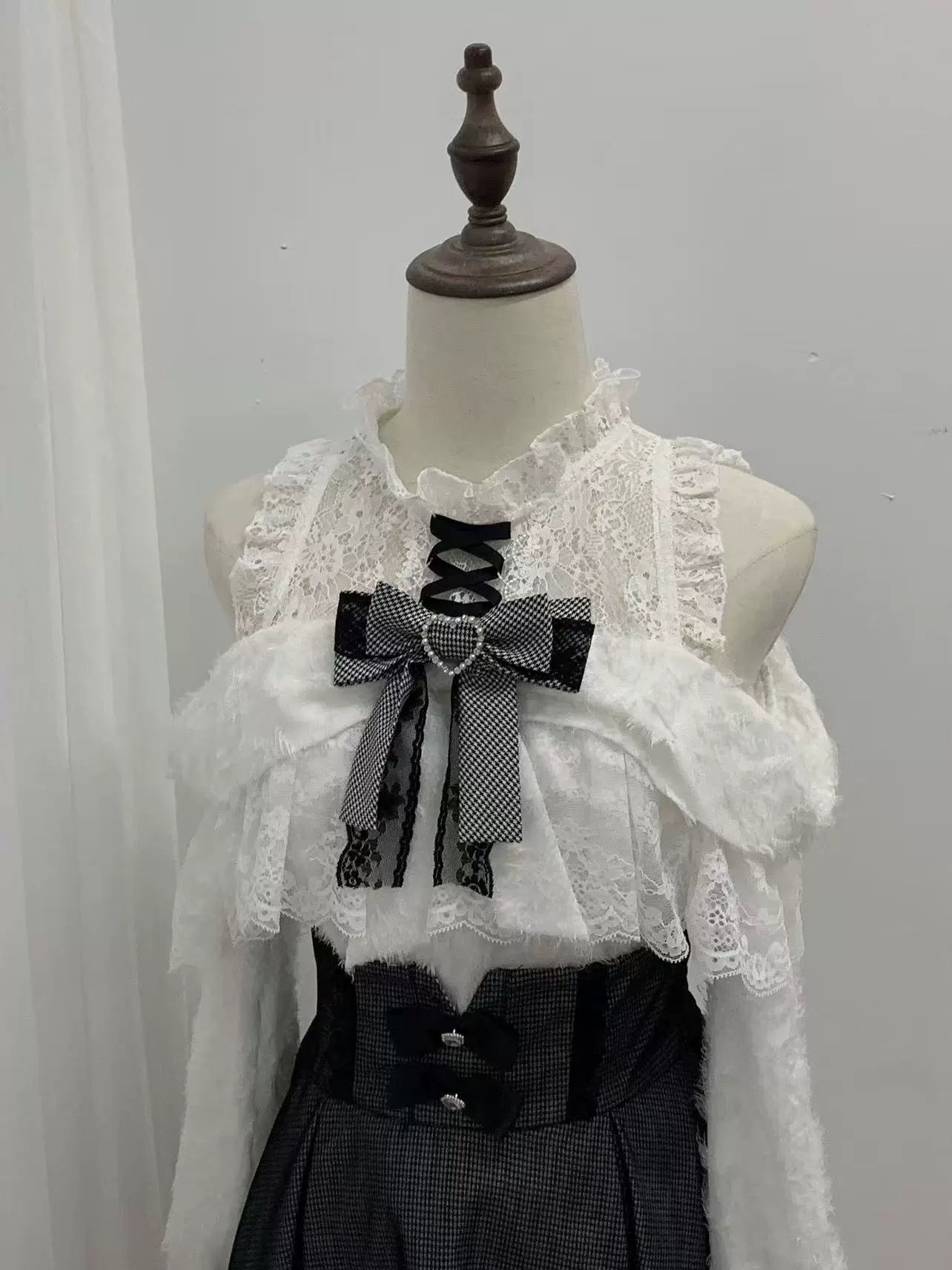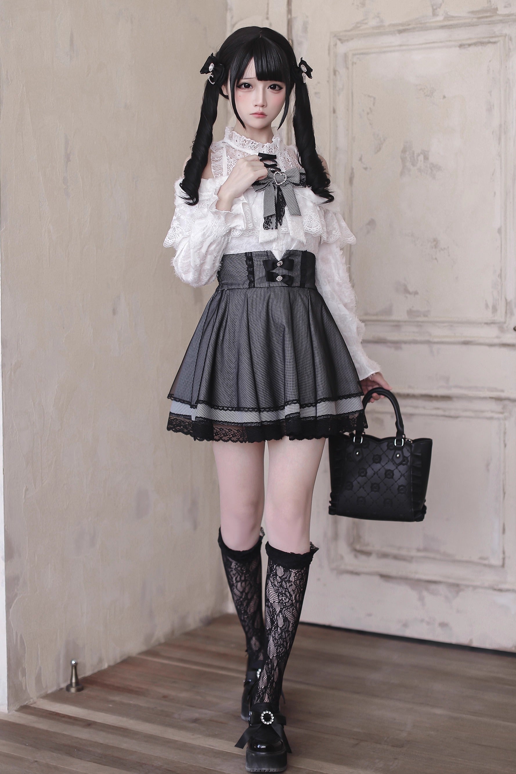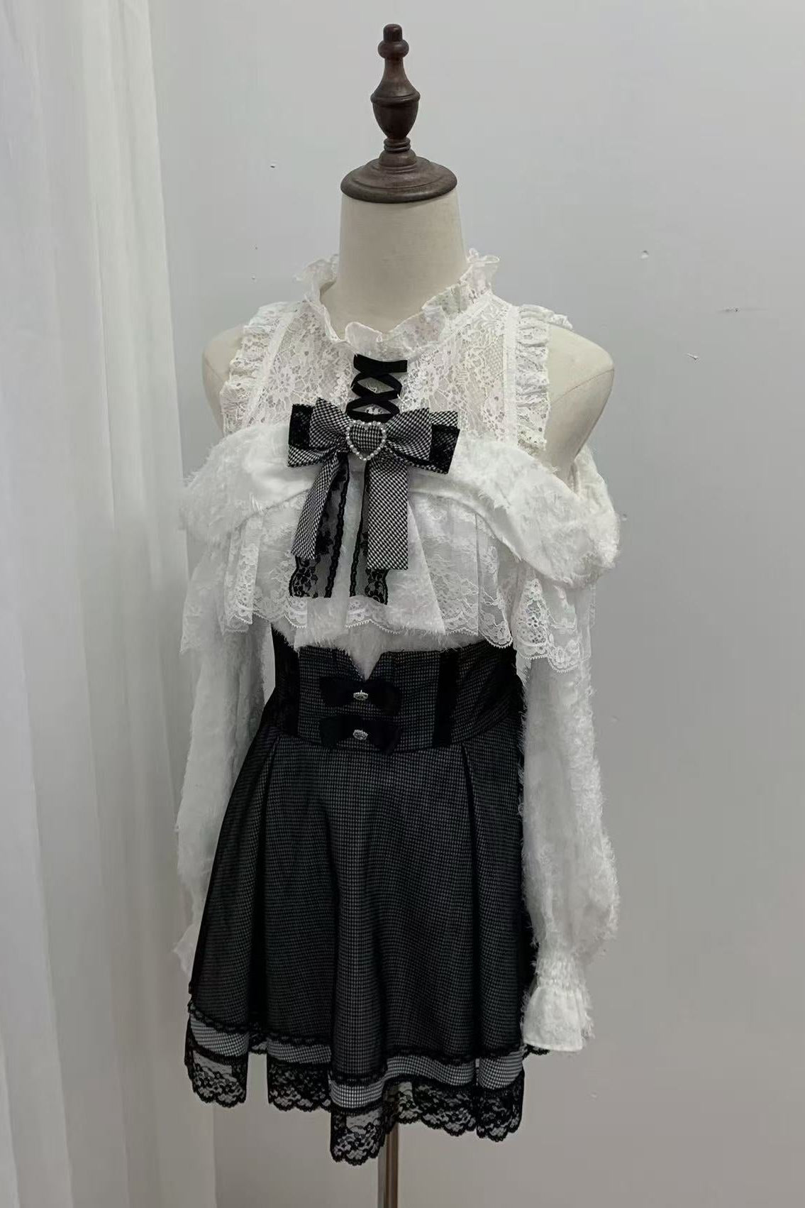 【1月6日予約締切】ホワイトレースオフショルダーリボンニットトップス+千鳥格子スカート