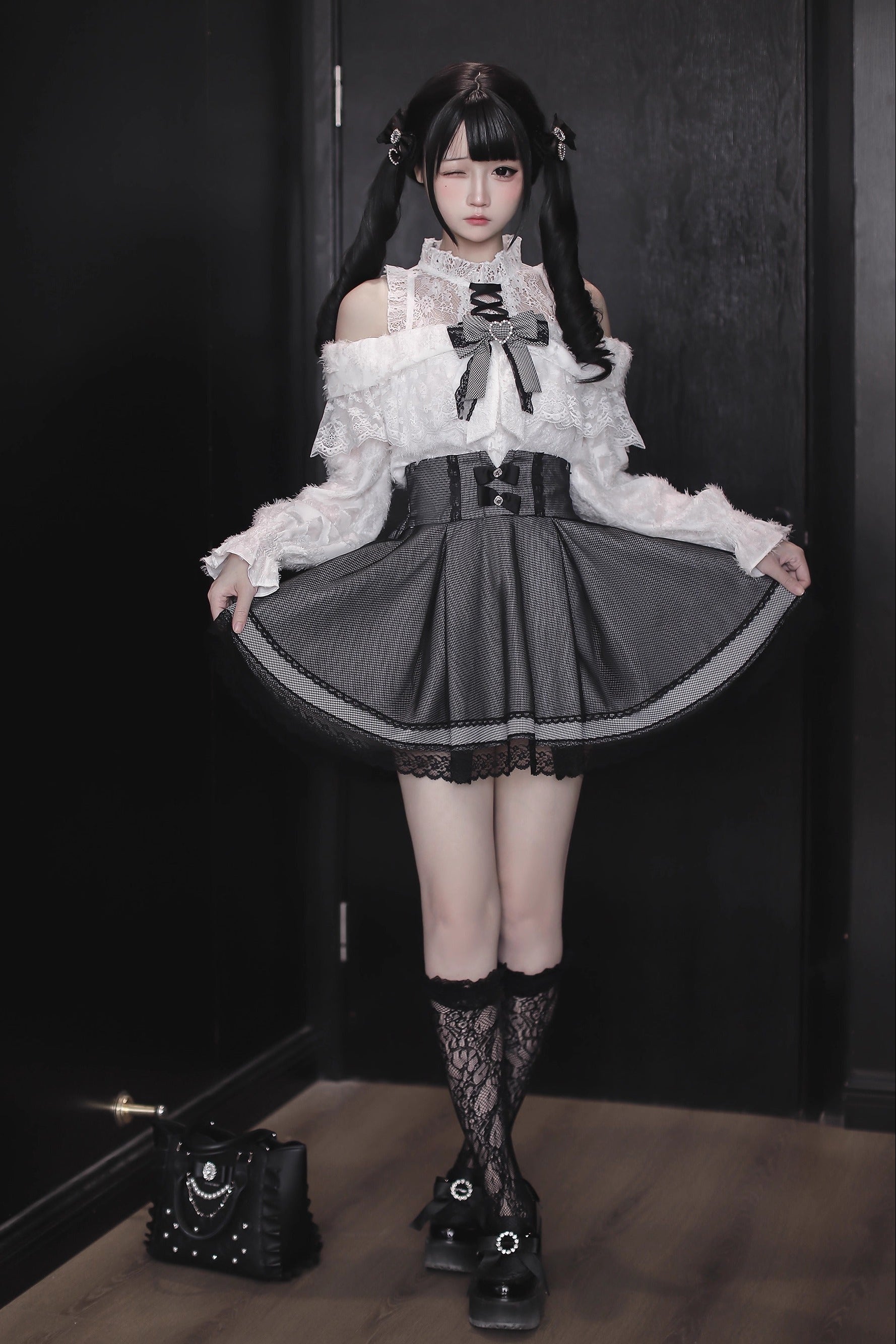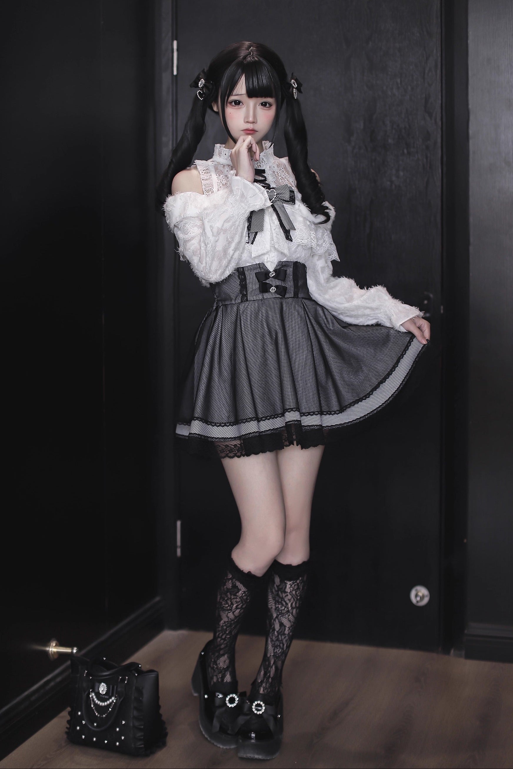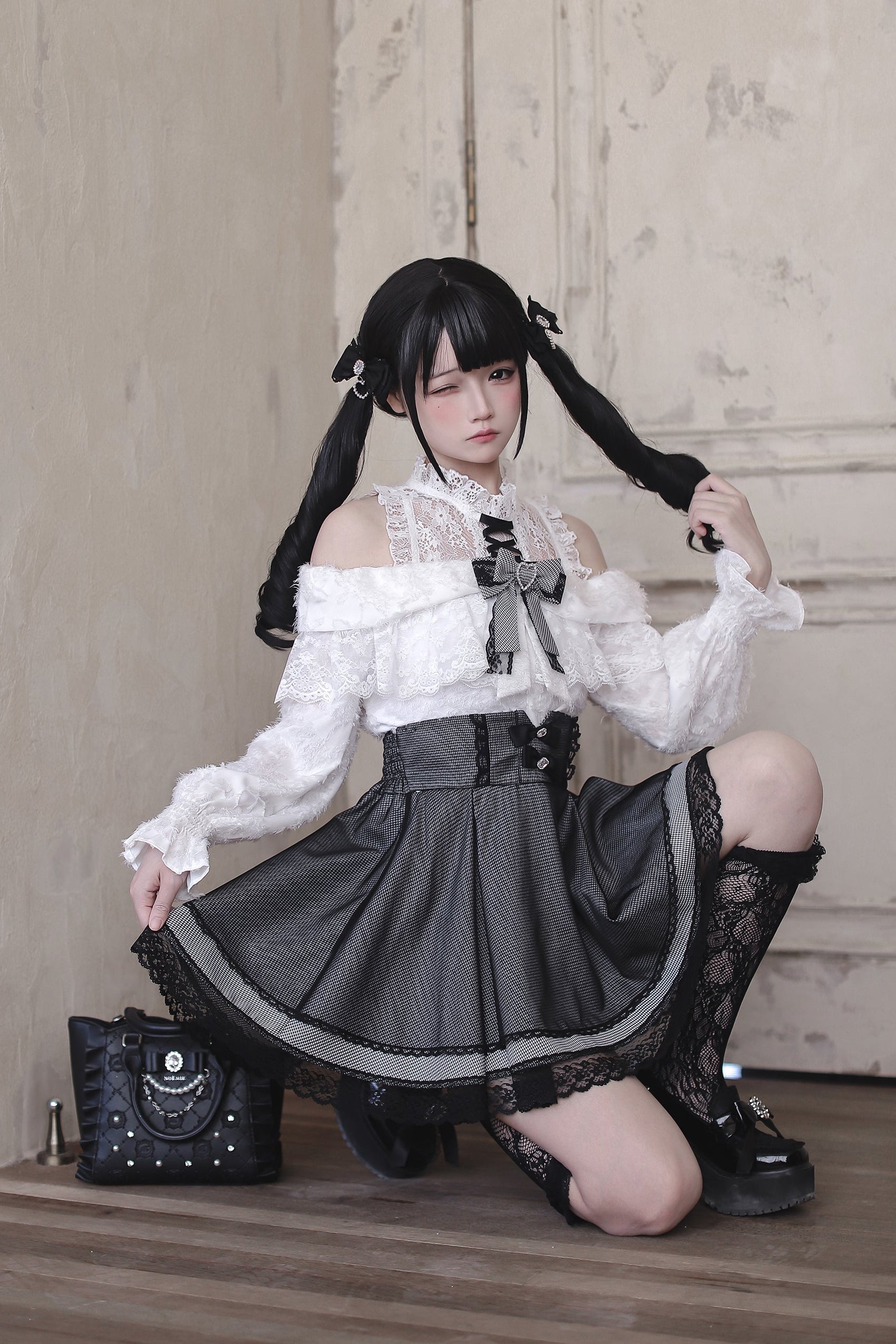 【1月6日予約締切】ホワイトレースオフショルダーリボンニットトップス+千鳥格子スカート