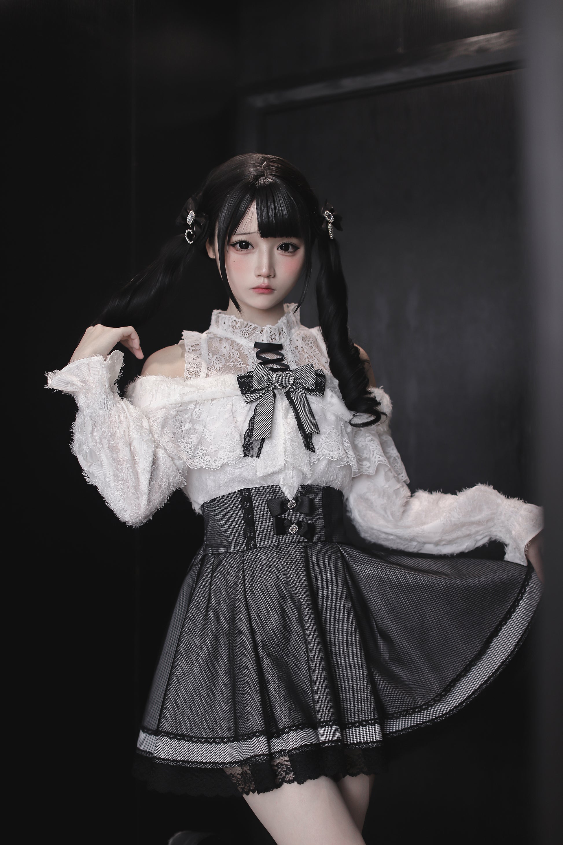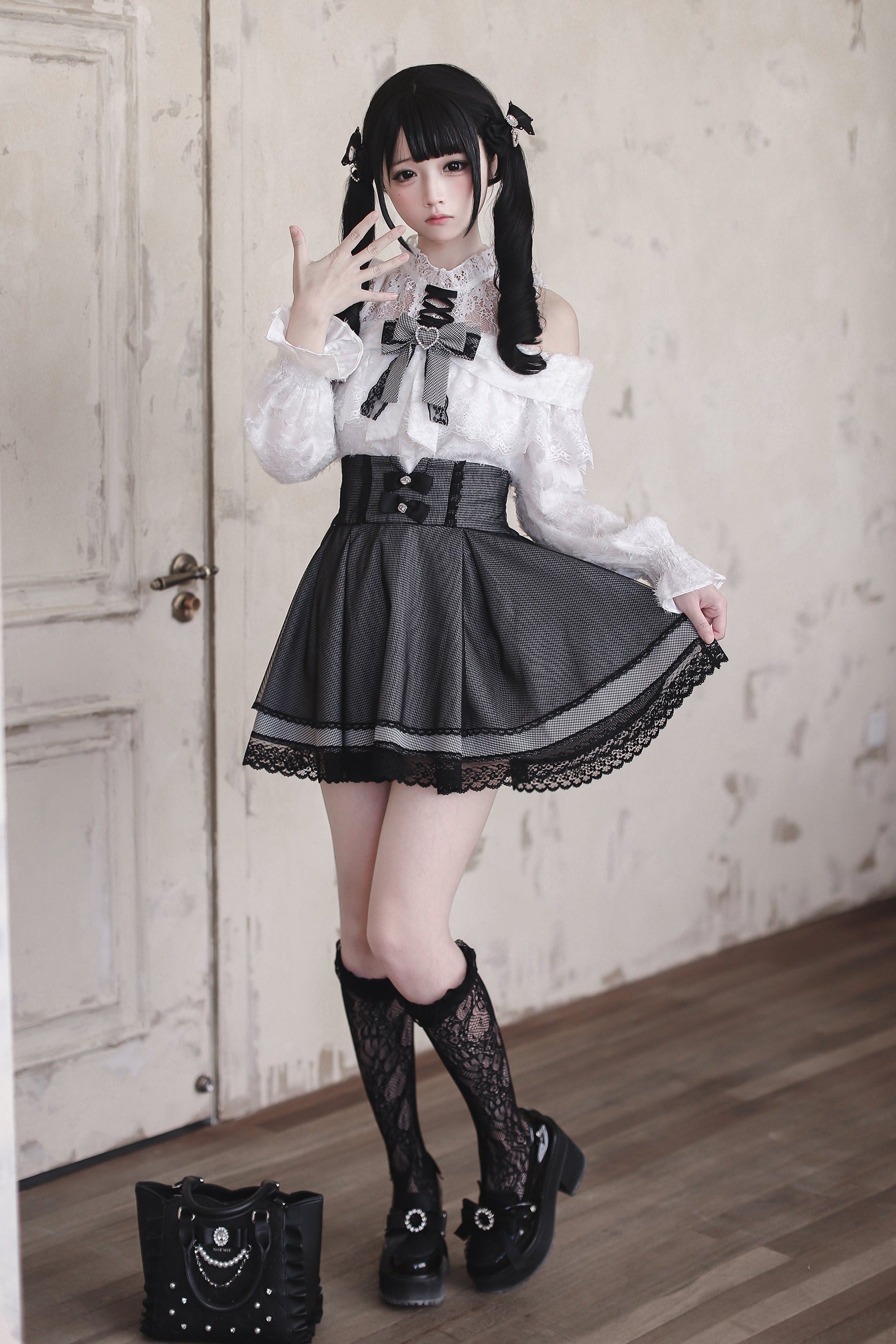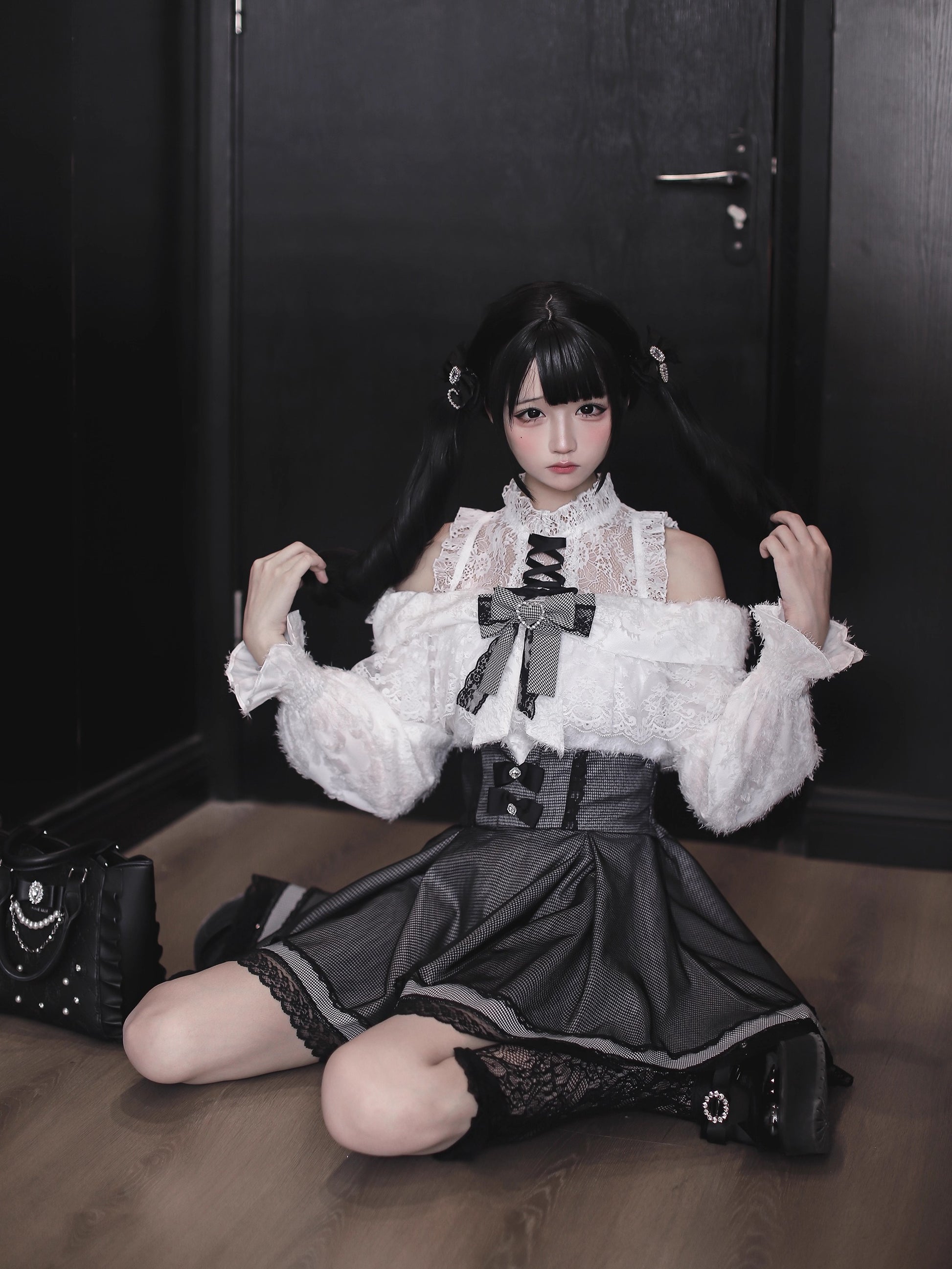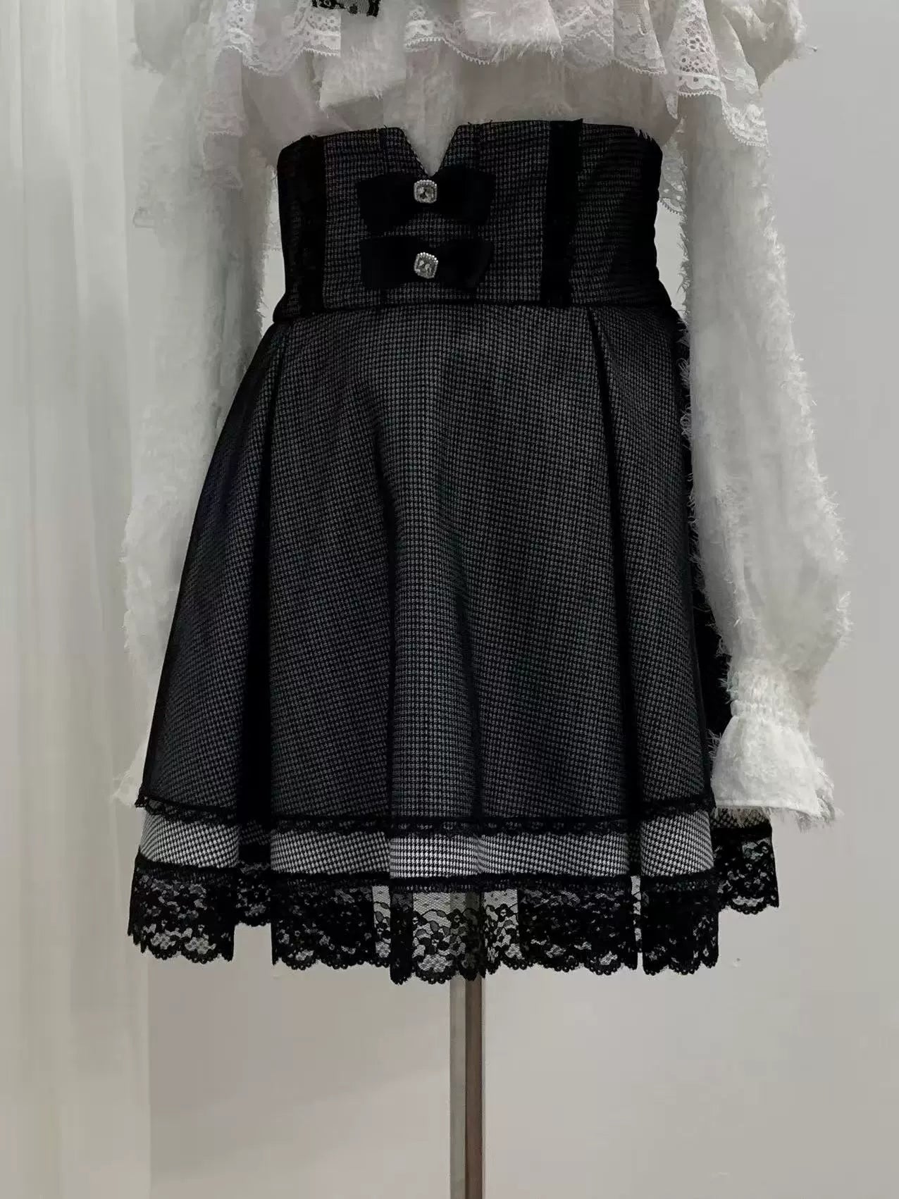 【1月6日予約締切】ホワイトレースオフショルダーリボンニットトップス+千鳥格子スカート