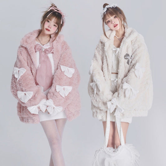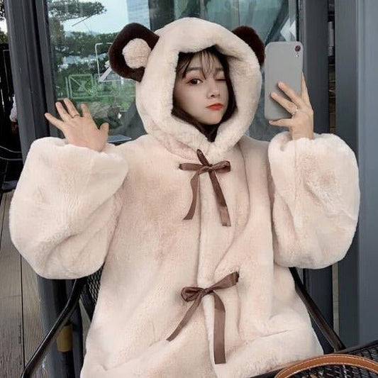 Bear Ear Ribbon Hooded Frill Collar Fluffy Coat