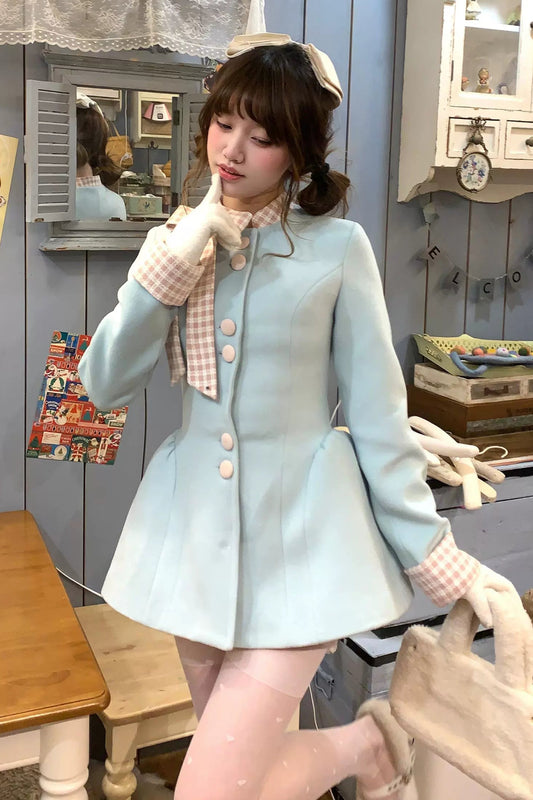 Peach Check Sweet Bow Coat + Check Tight Skirt + Fur Check Skirt