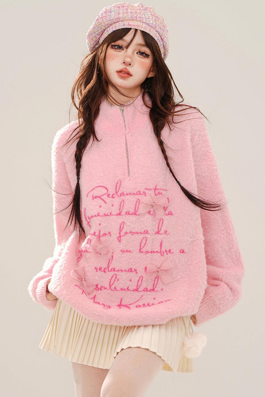 Candy Sweet Doll Print Suspenders + Pink Knit Cardigan + Blue Hip Skirt
