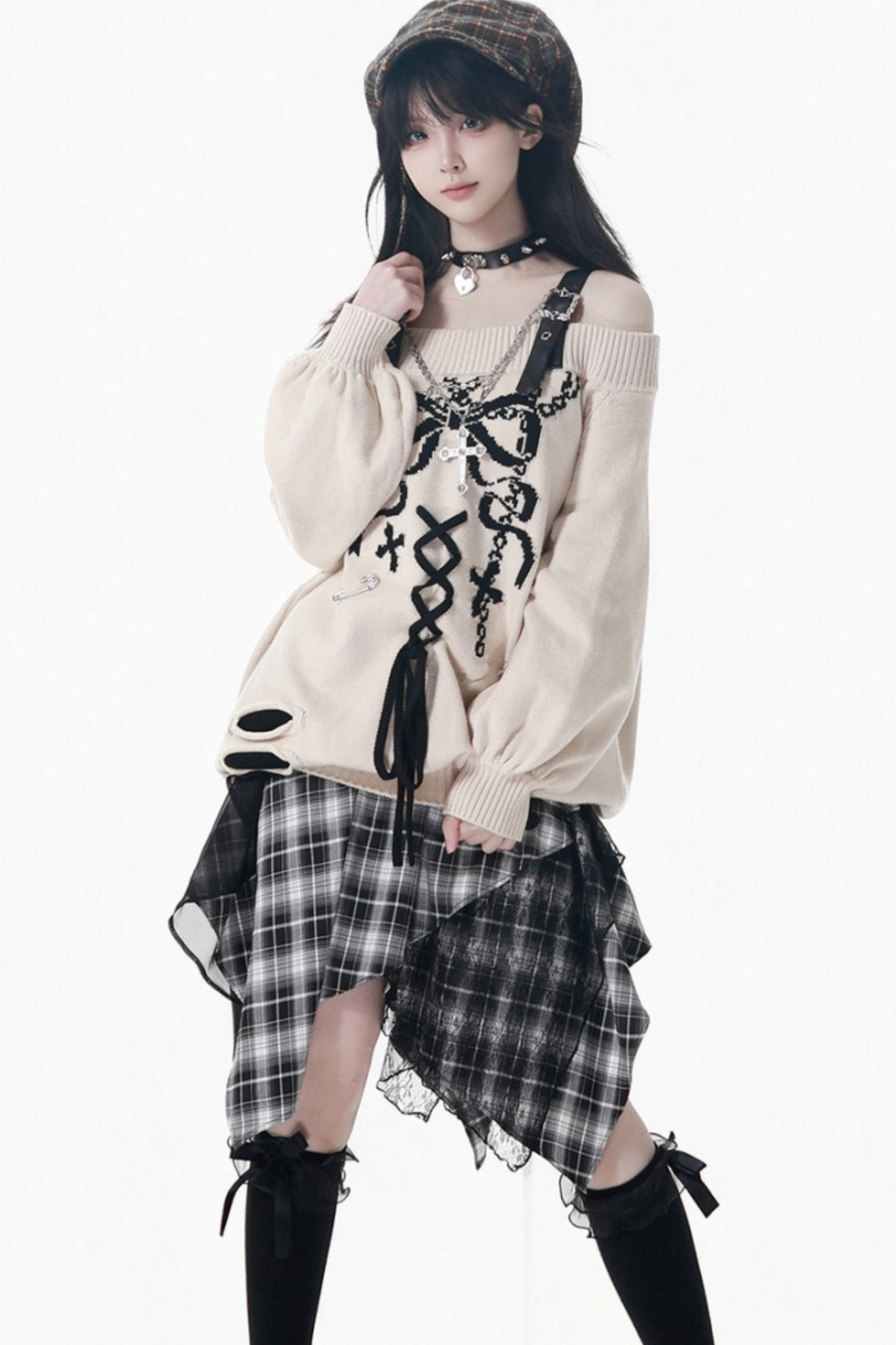 ❤One Shoulder Ribbon Top + Check Asymmetrical Skirt❤