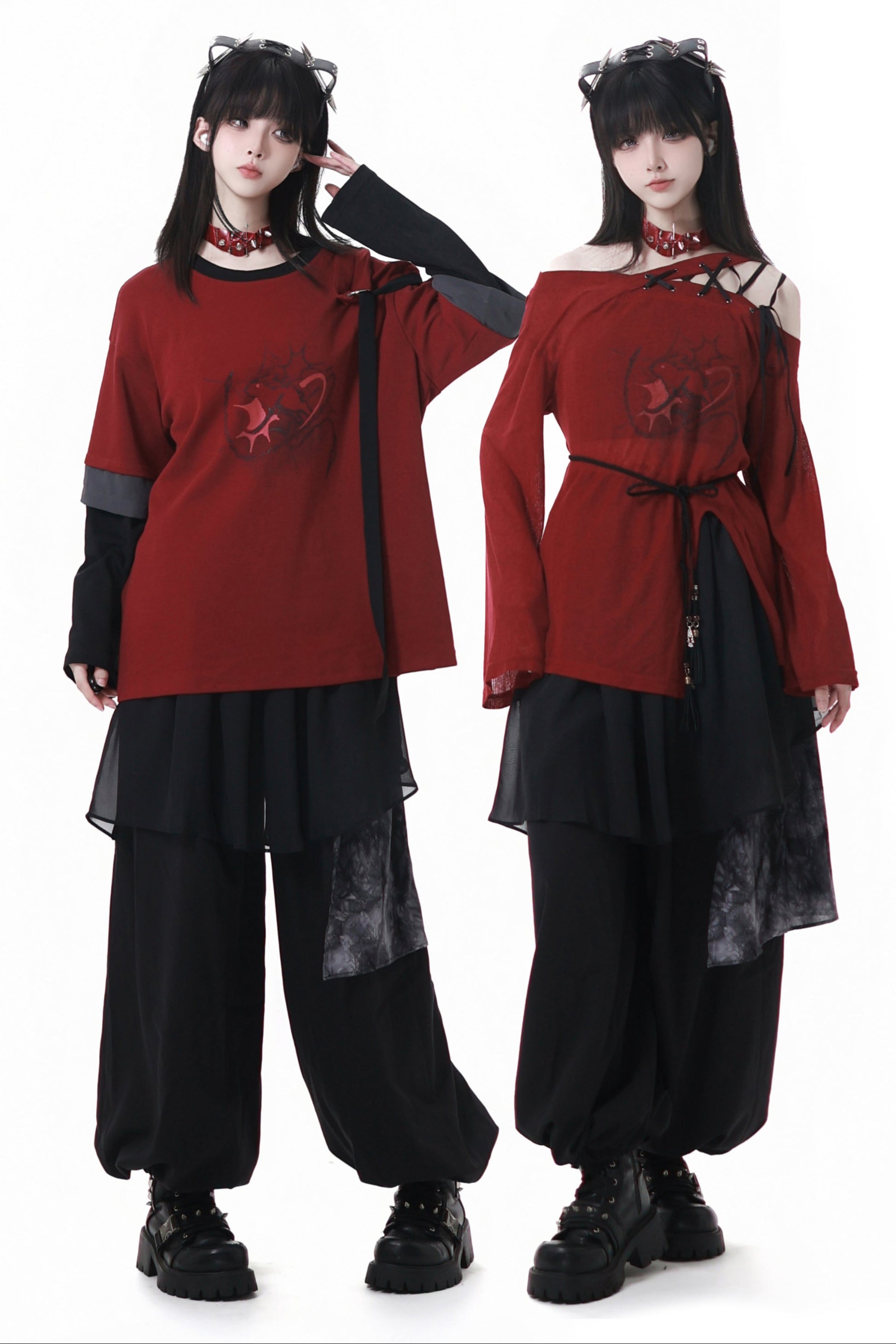 ❤Spliced Mode Red Top + Mode Pants + Rose Belt❤
