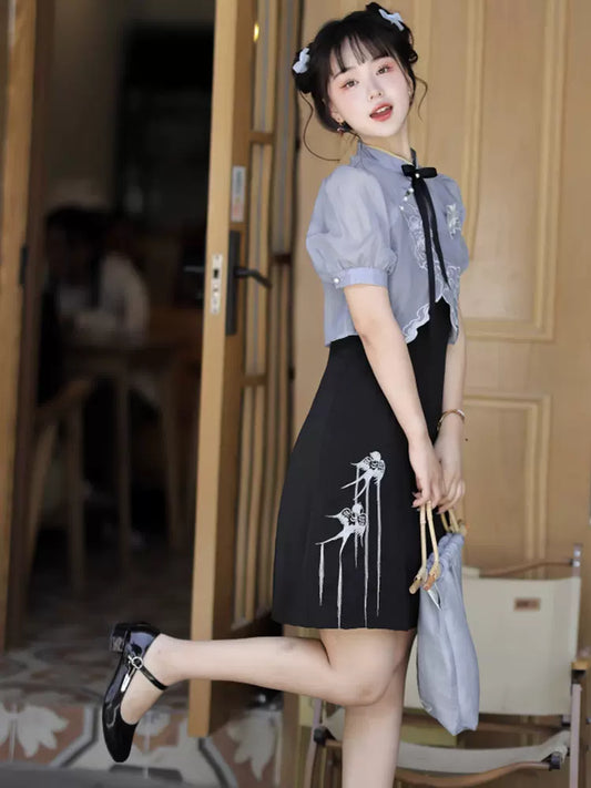 Kung Fu Panda Mint Puff Sleeve China Chiffon Shirt-Skirt Set + Dress