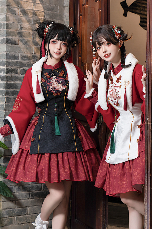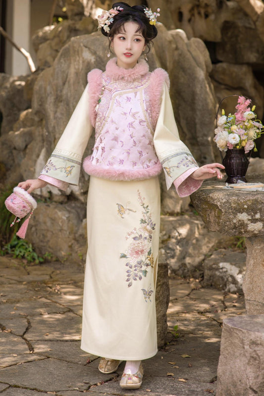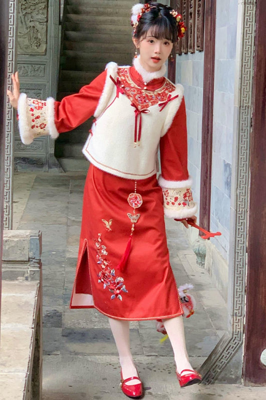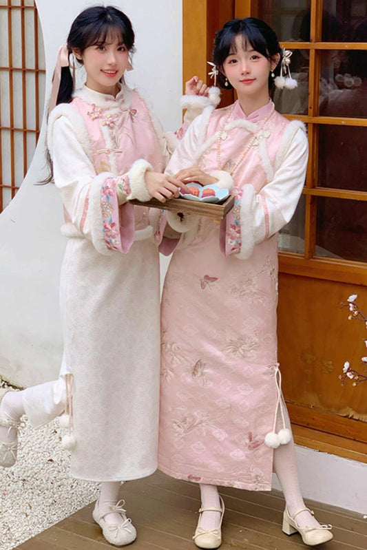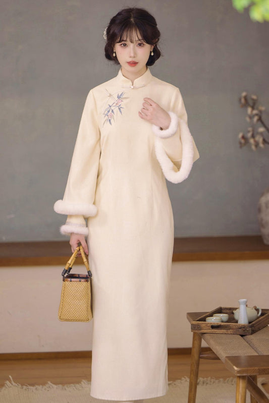 Retro Elegant Chinese Dress + Short Fur Coat