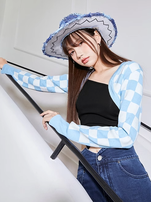 Checkerboard Grid Shoulder Strap Knit Sweater