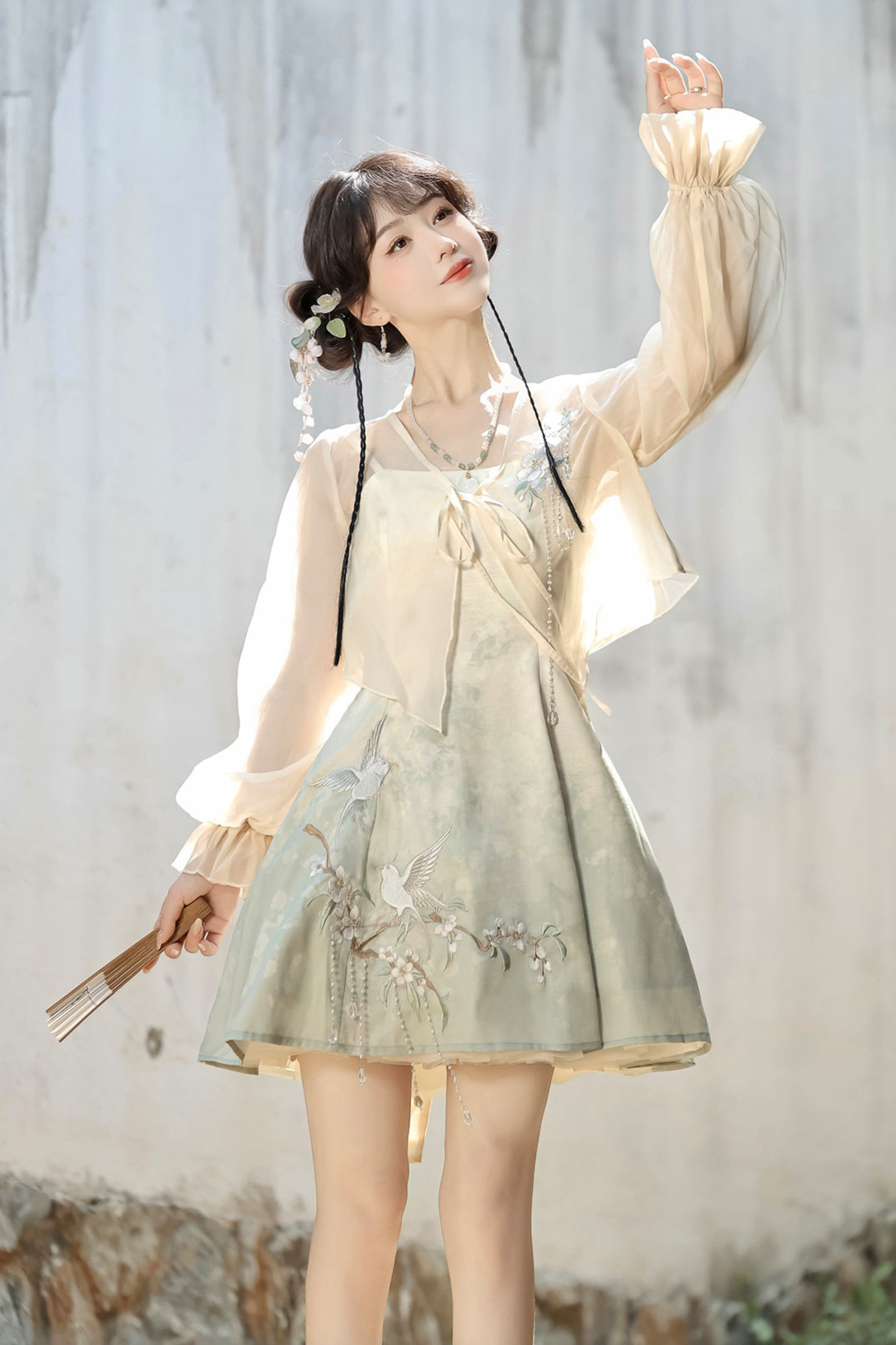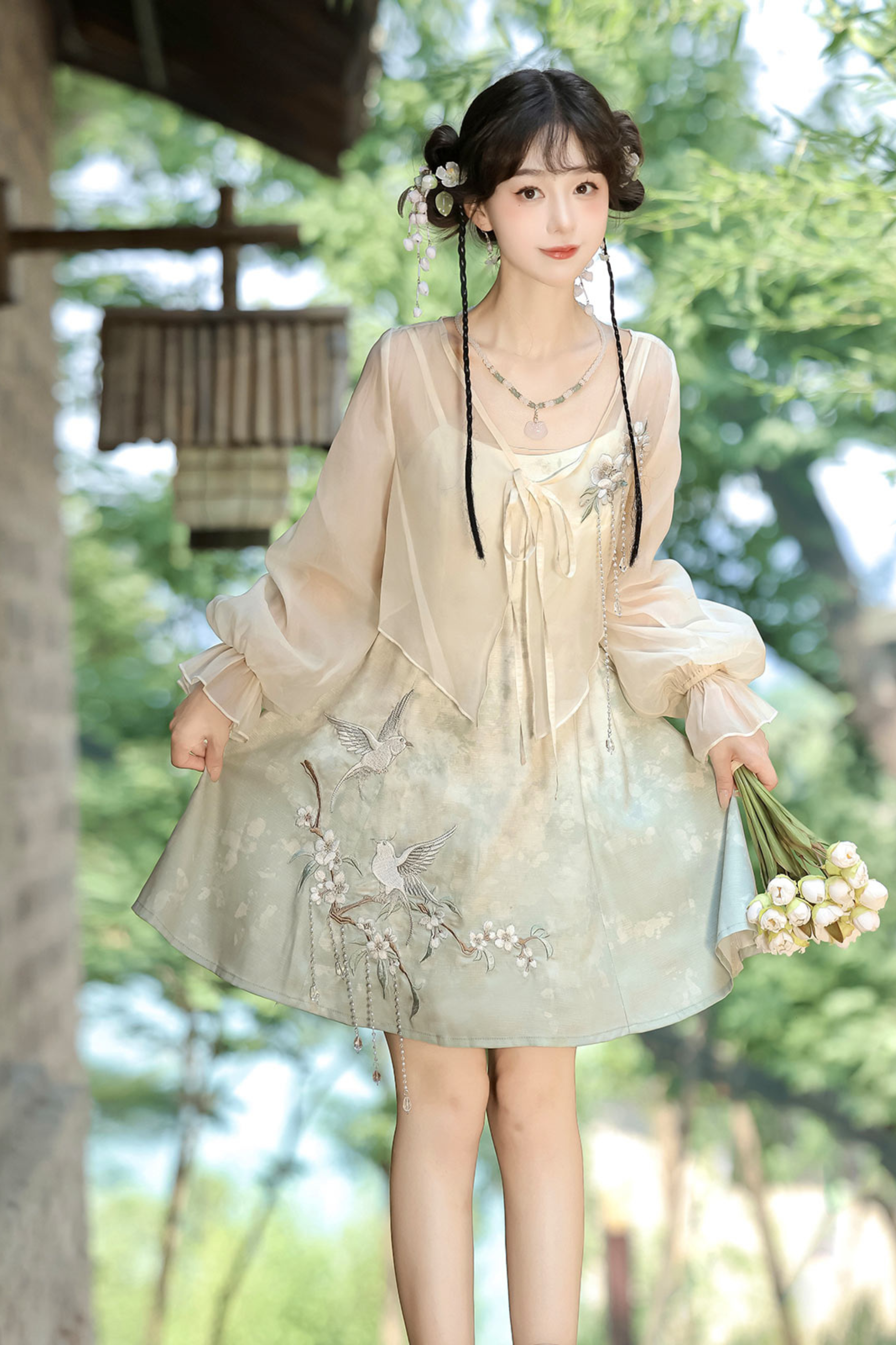 China Gradient Flower Retro Dress + Sheer Cardigan