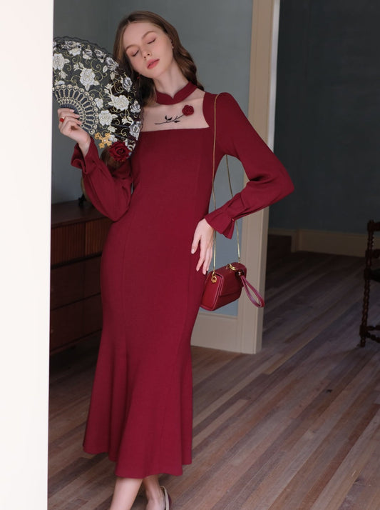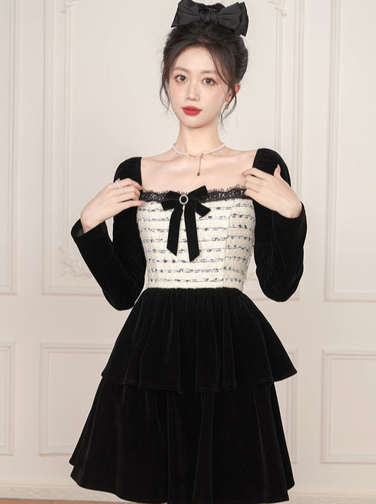 Queen Classic Serenade French Lapel Splicing Black Knit Long Dress