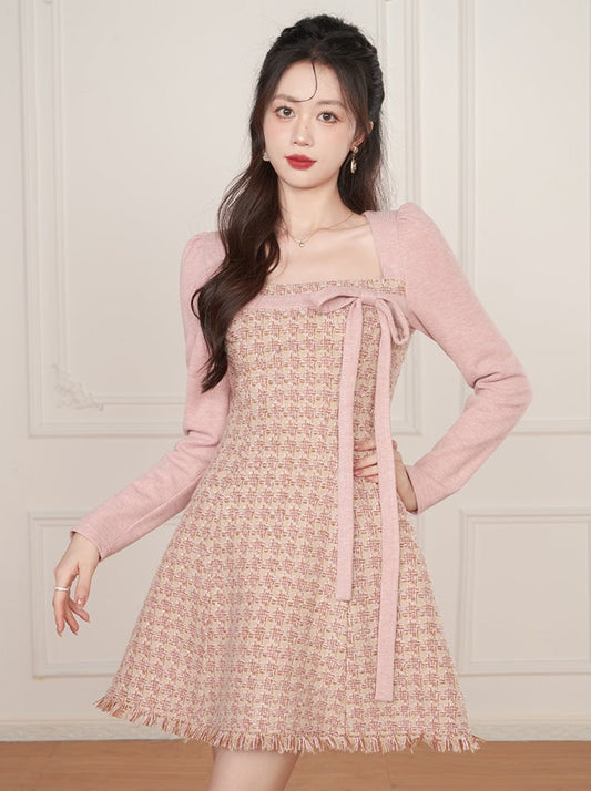 Pink Tweed Faux Two-Piece Ribbon Dress