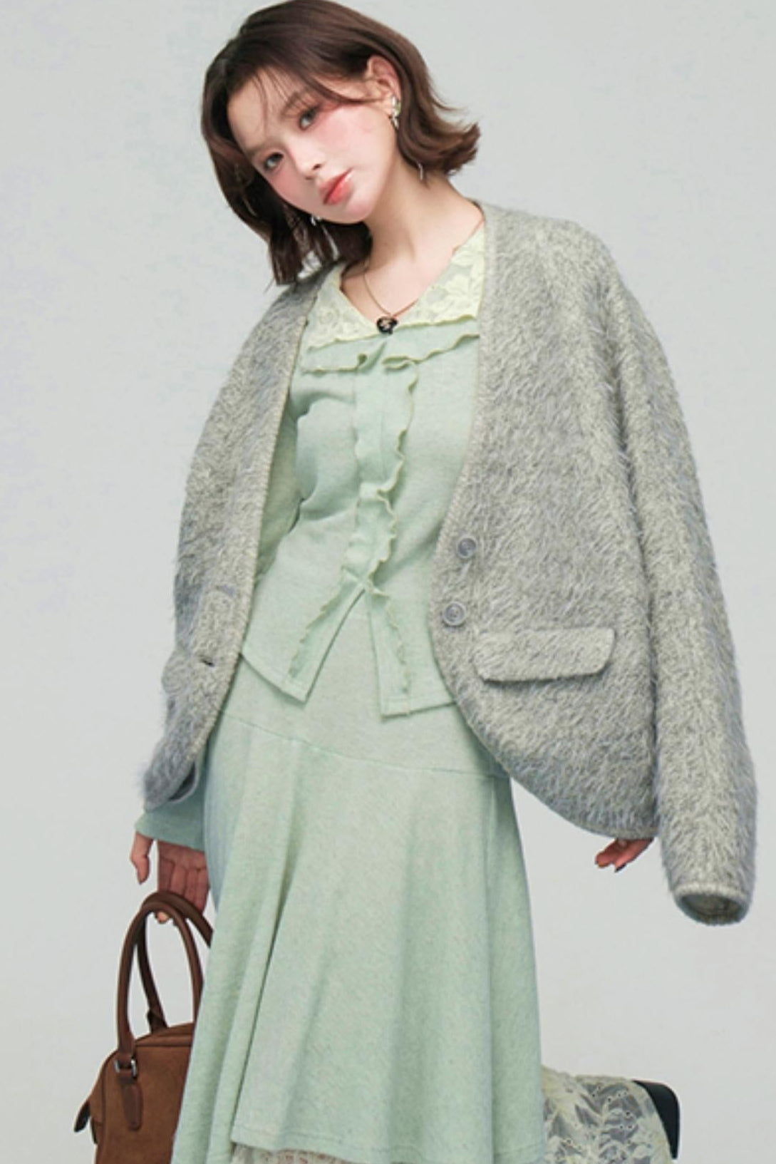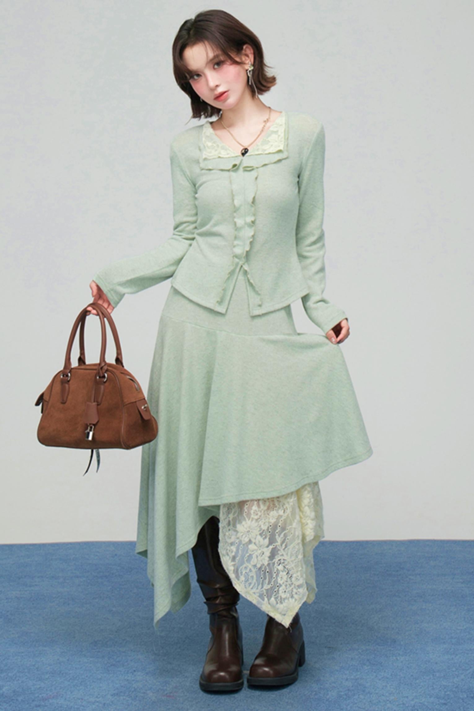レースカラーニットトップス+アシメスカート