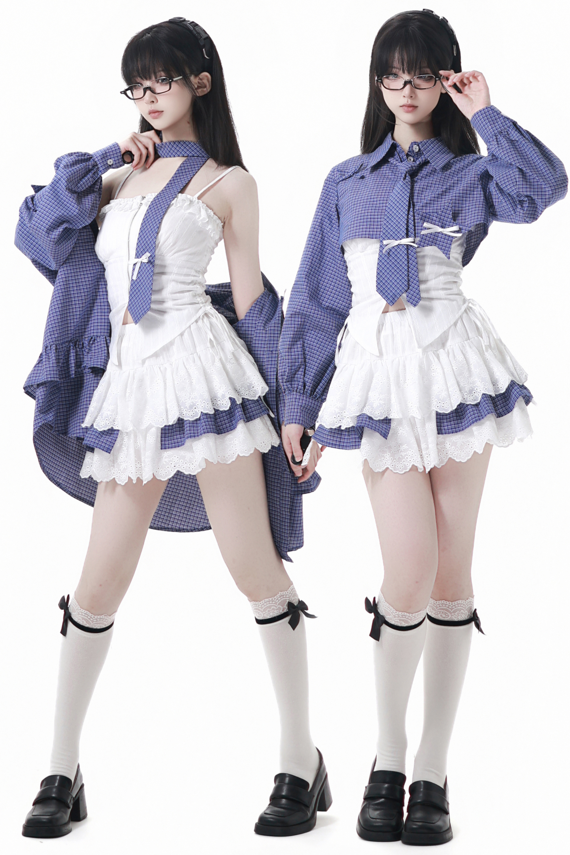 ❤ Check Tie Blouse Uras Camisole + Skirt + Short Top❤