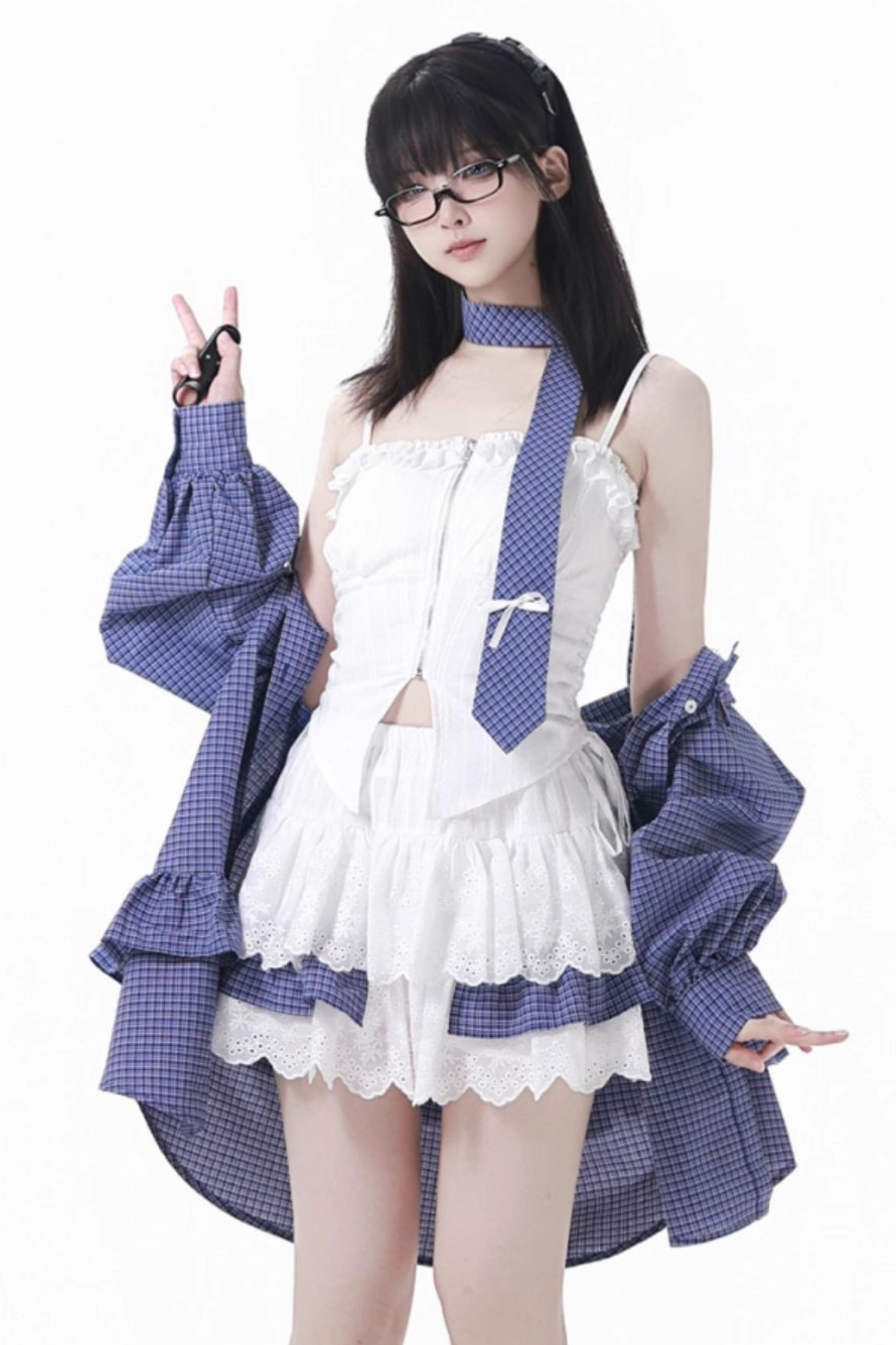 Check Tie Blouse Ursus Camisole + Skirt + Short Top