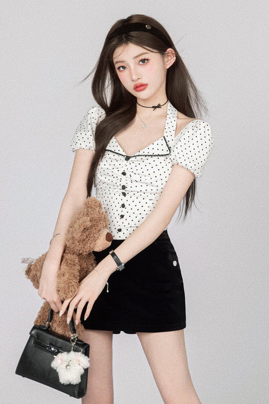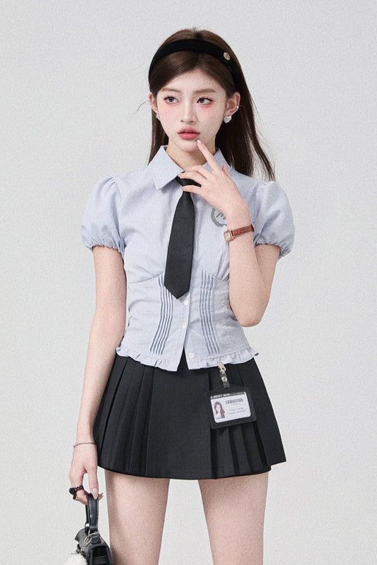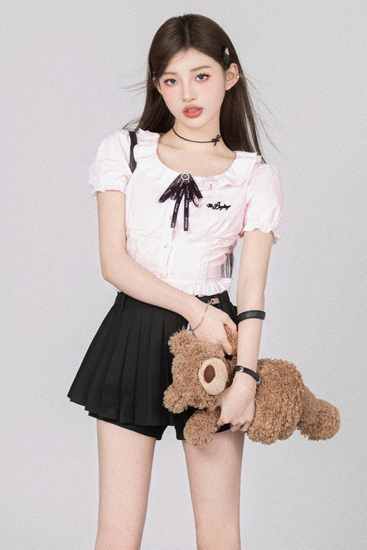 Solid color -Catpo T -shirt+short skirt+black pleats culott