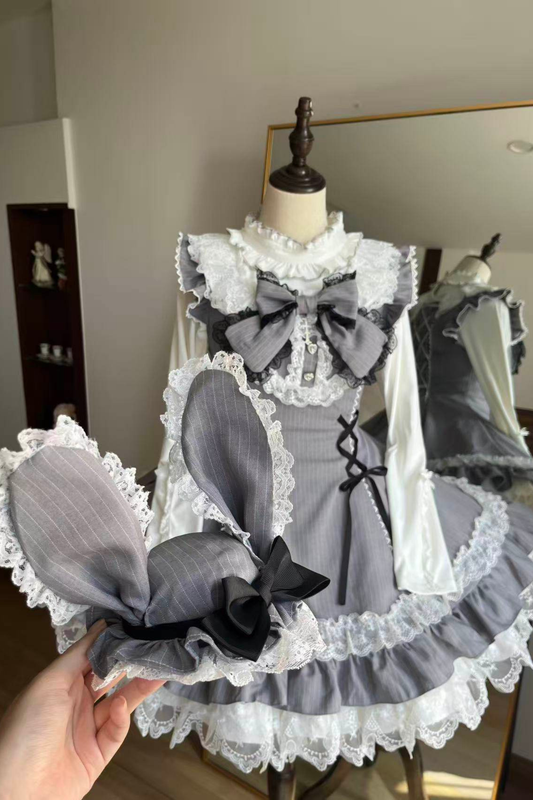 ダークレースアップストライプドロリータドレス+ラビットハット+スリーブ