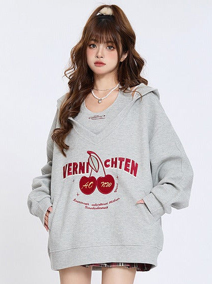 Retro Cherry Embroidery Leaf Hooded Sweatshirt Loose Two Piece