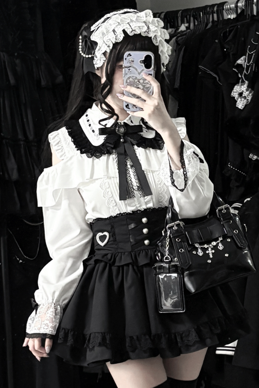 地雷ロングスリーブシャツ+ハイウエストスカート+リボンネクタイ