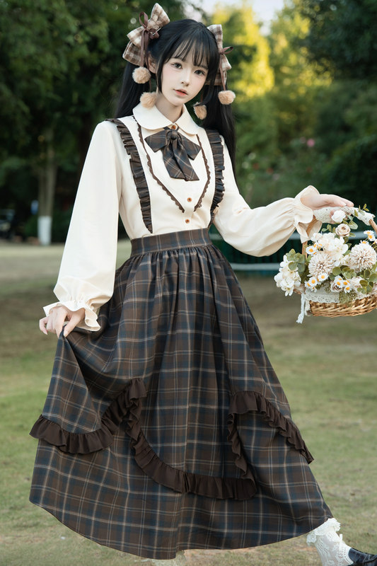 Retro girly check skirt + ruffle blouse