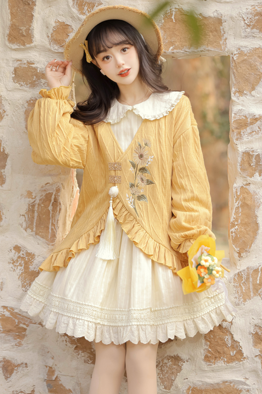 Retro Flower China Cardigan + Flared Doll Collar Dress