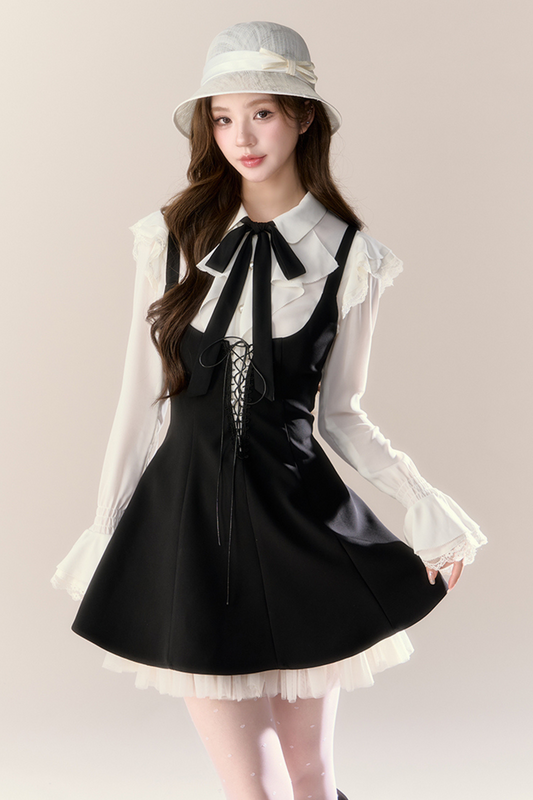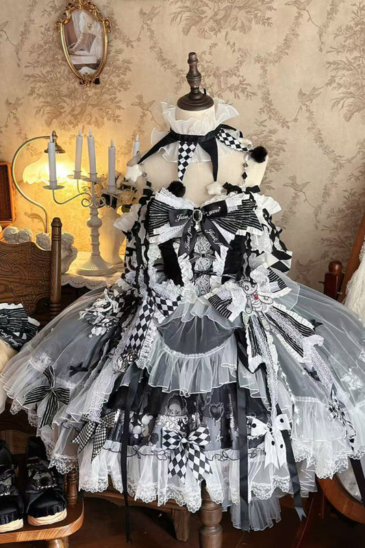 [Deadline for reservations: December 18] Jewel Ribbon Color Lace Check White Black Dress Setup