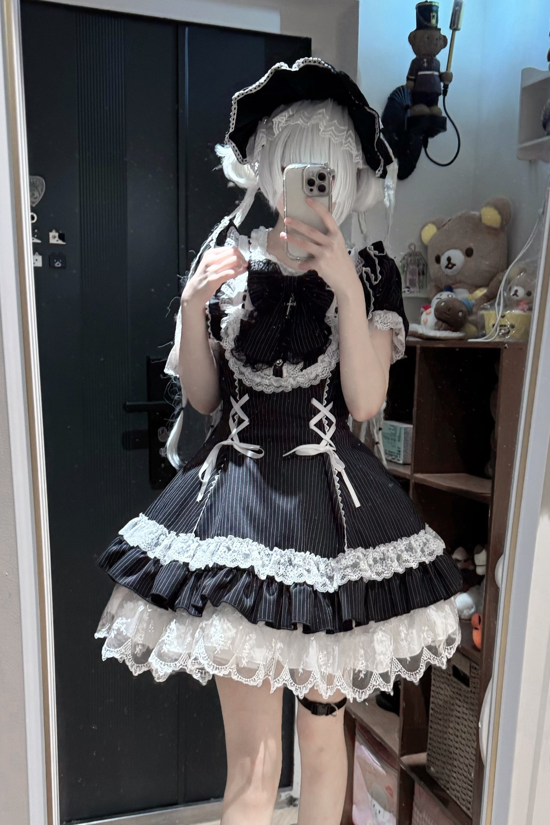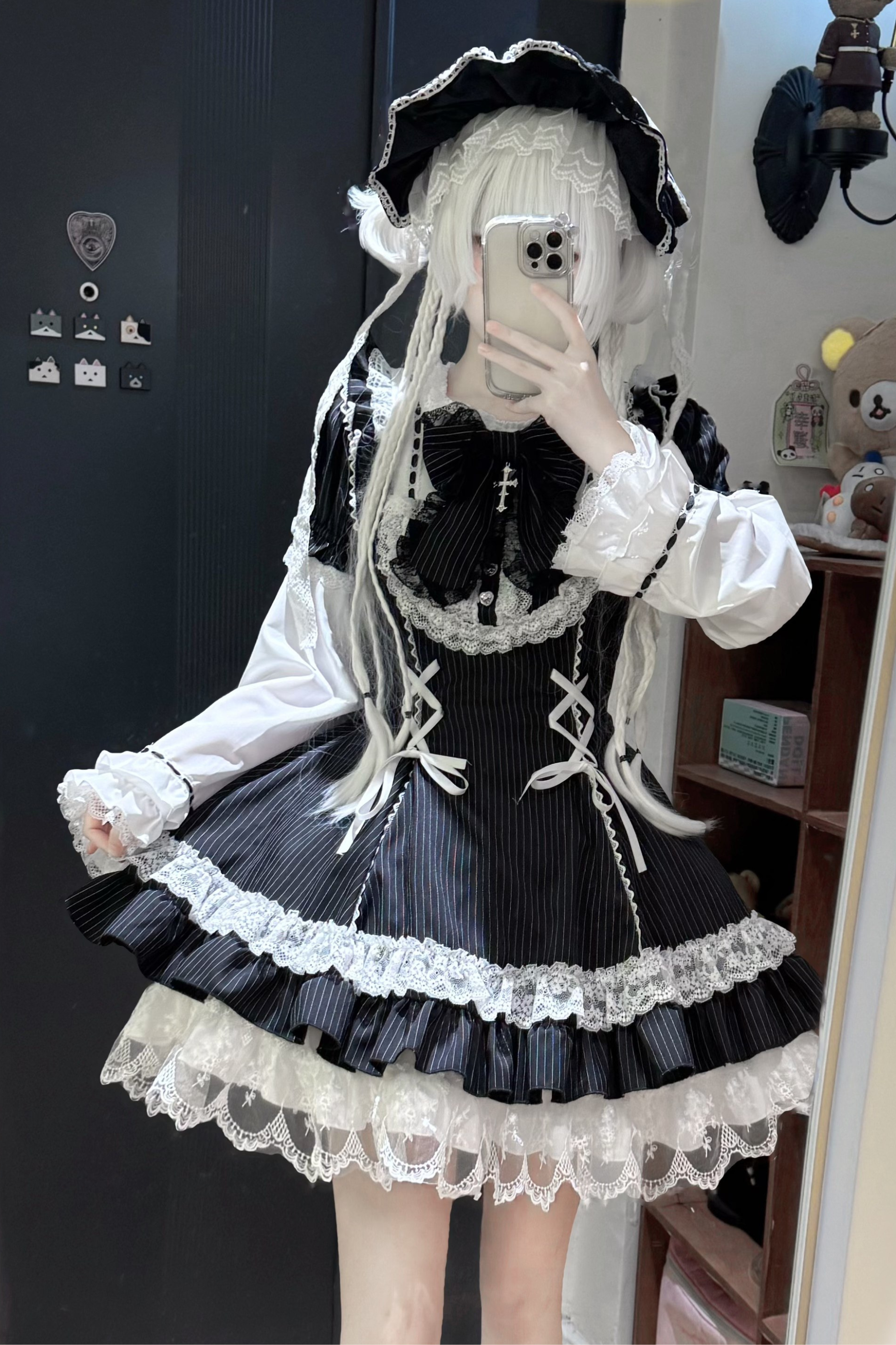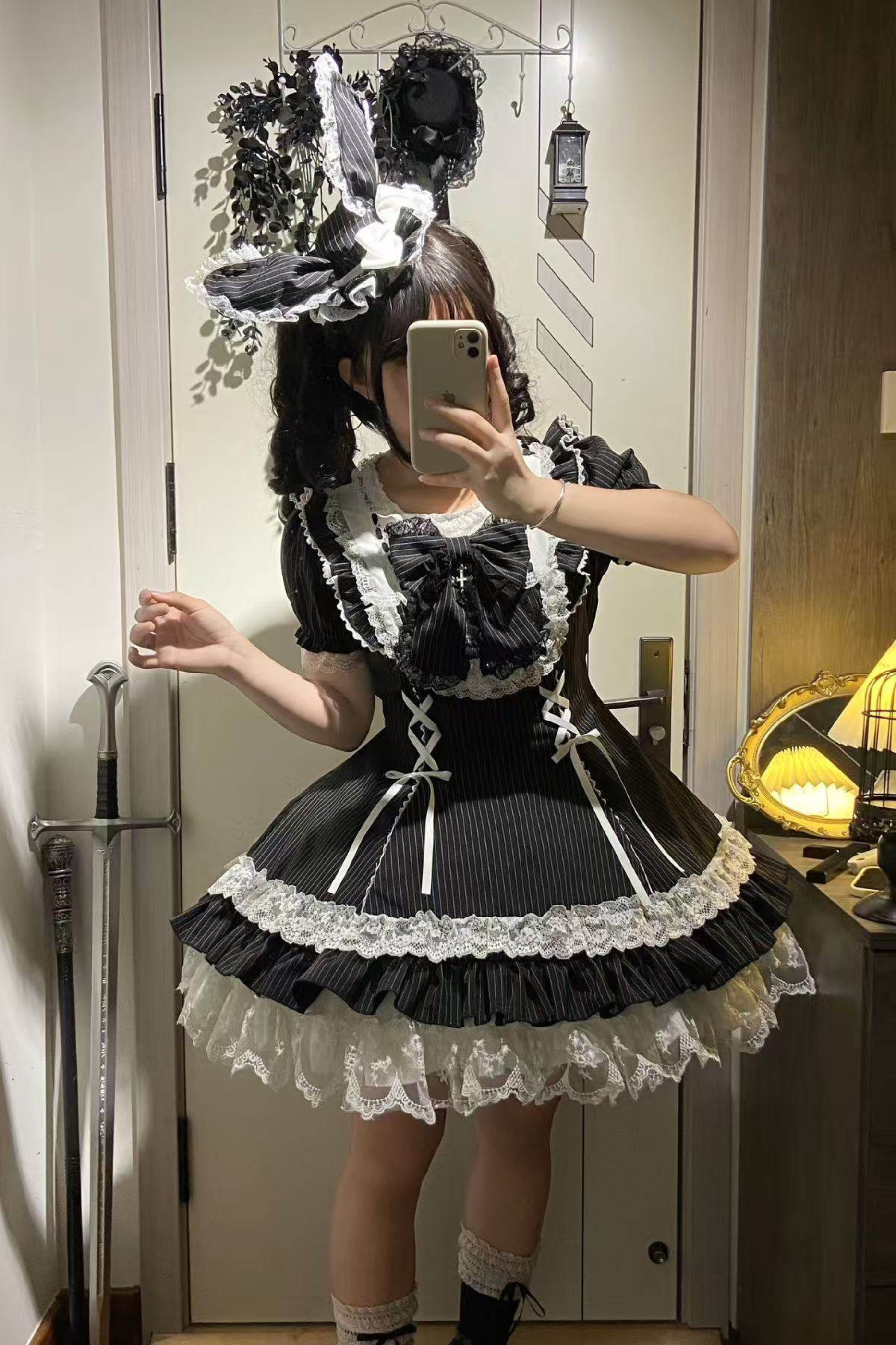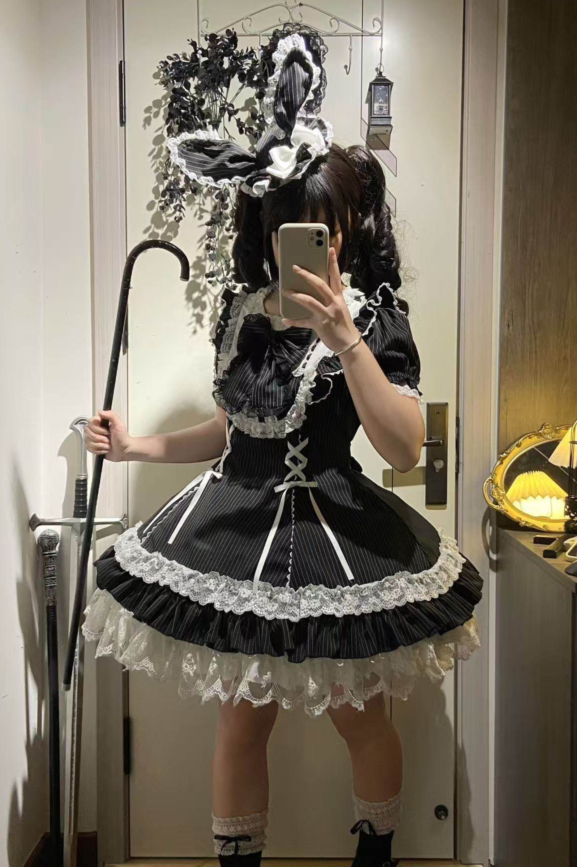 ダークレースアップストライプドロリータドレス+ラビットハット+スリーブ