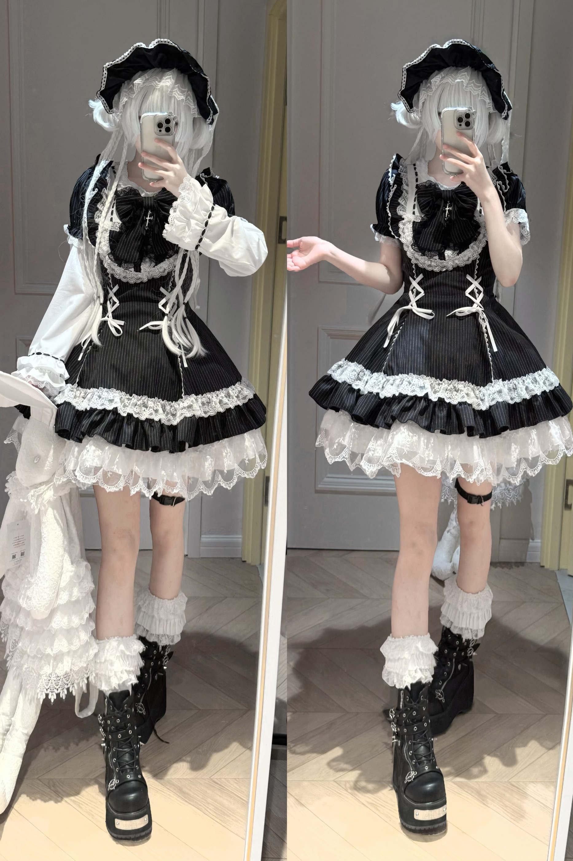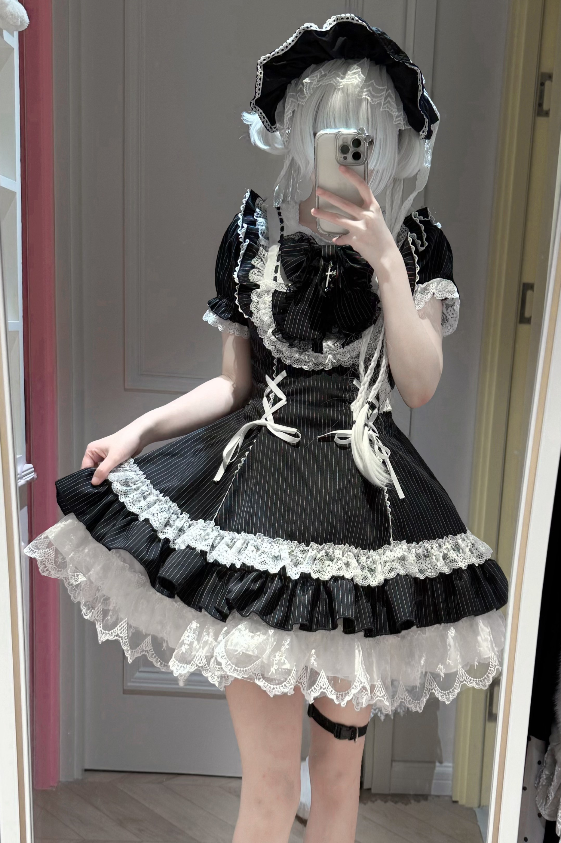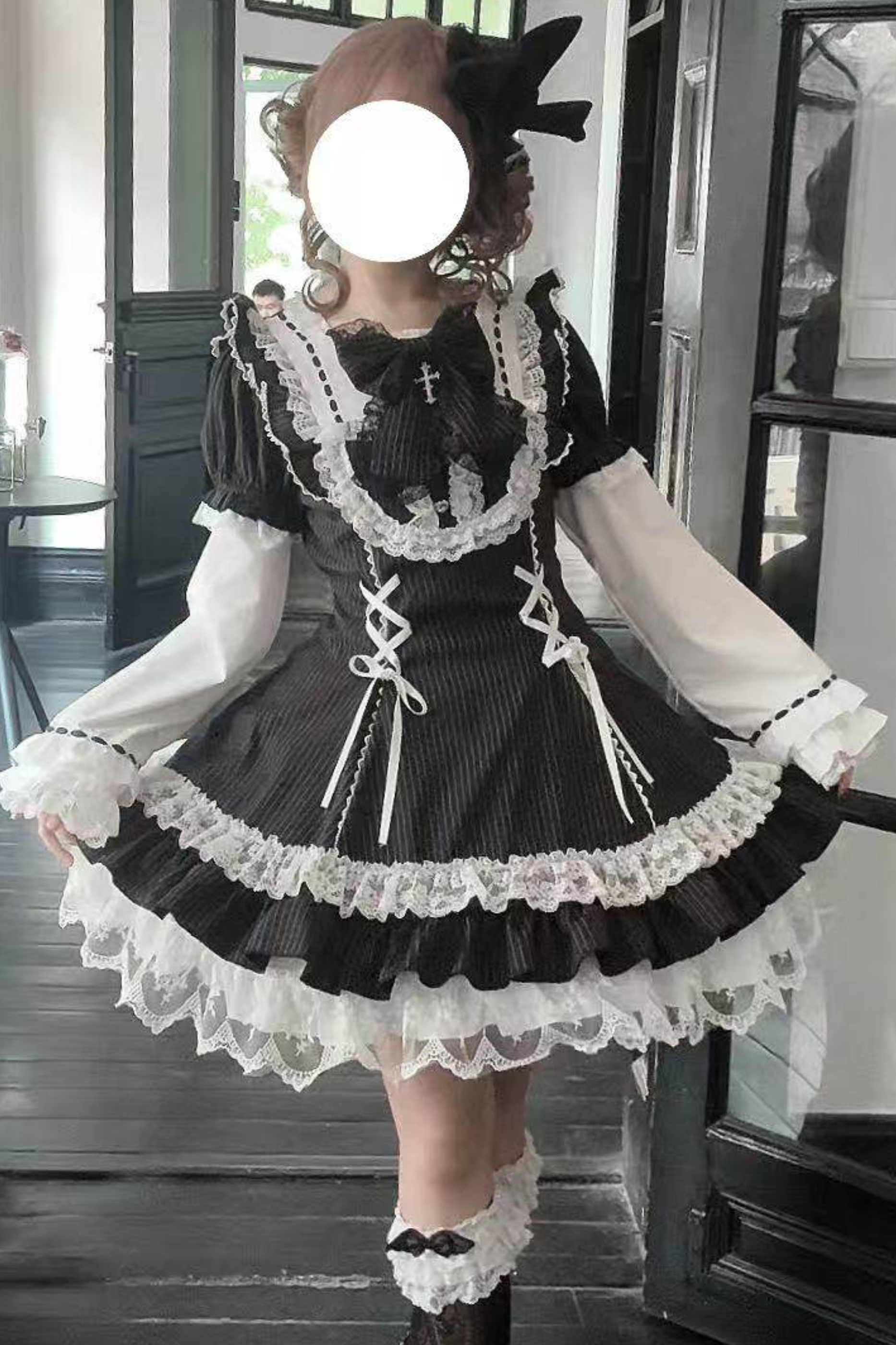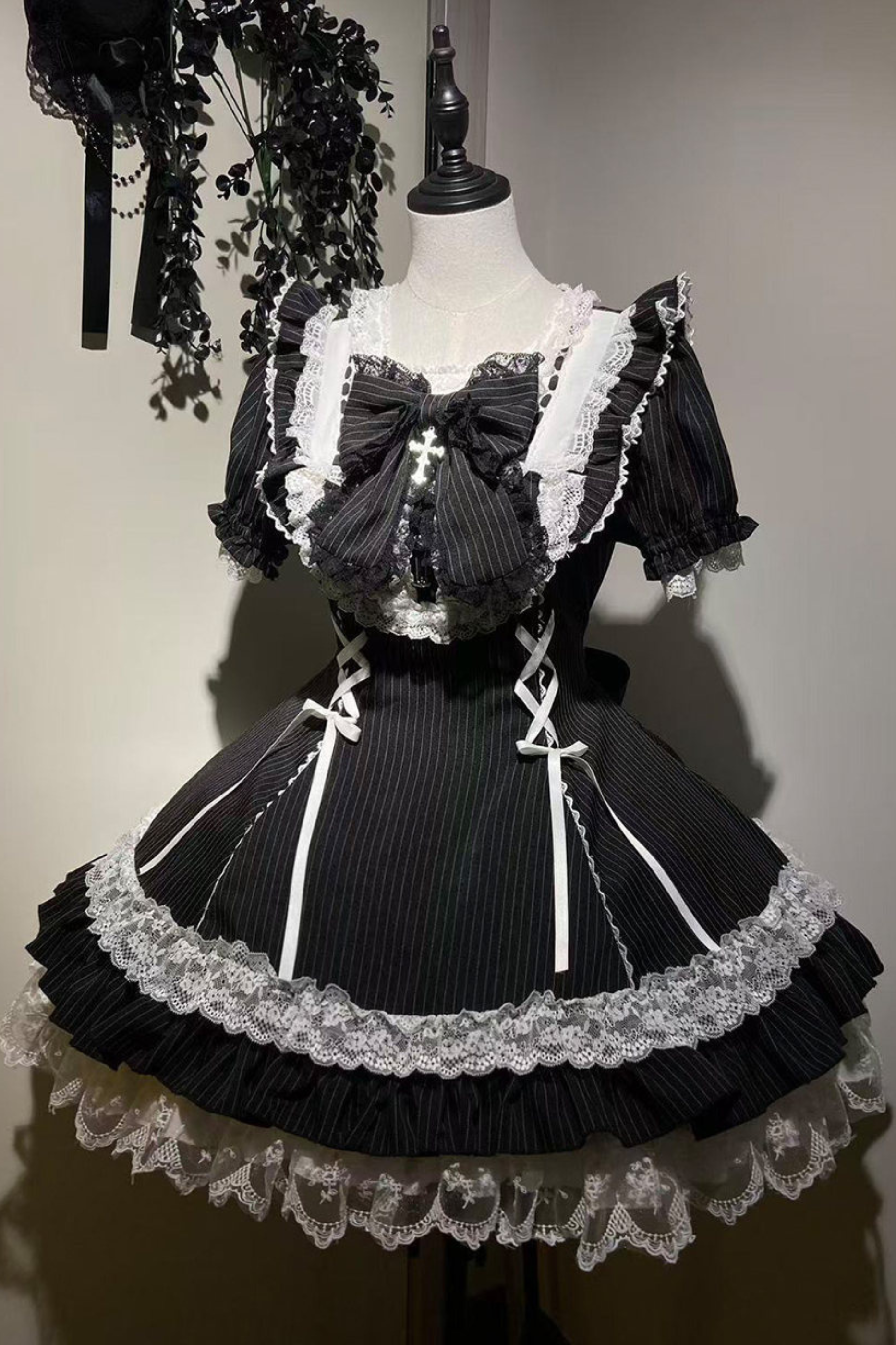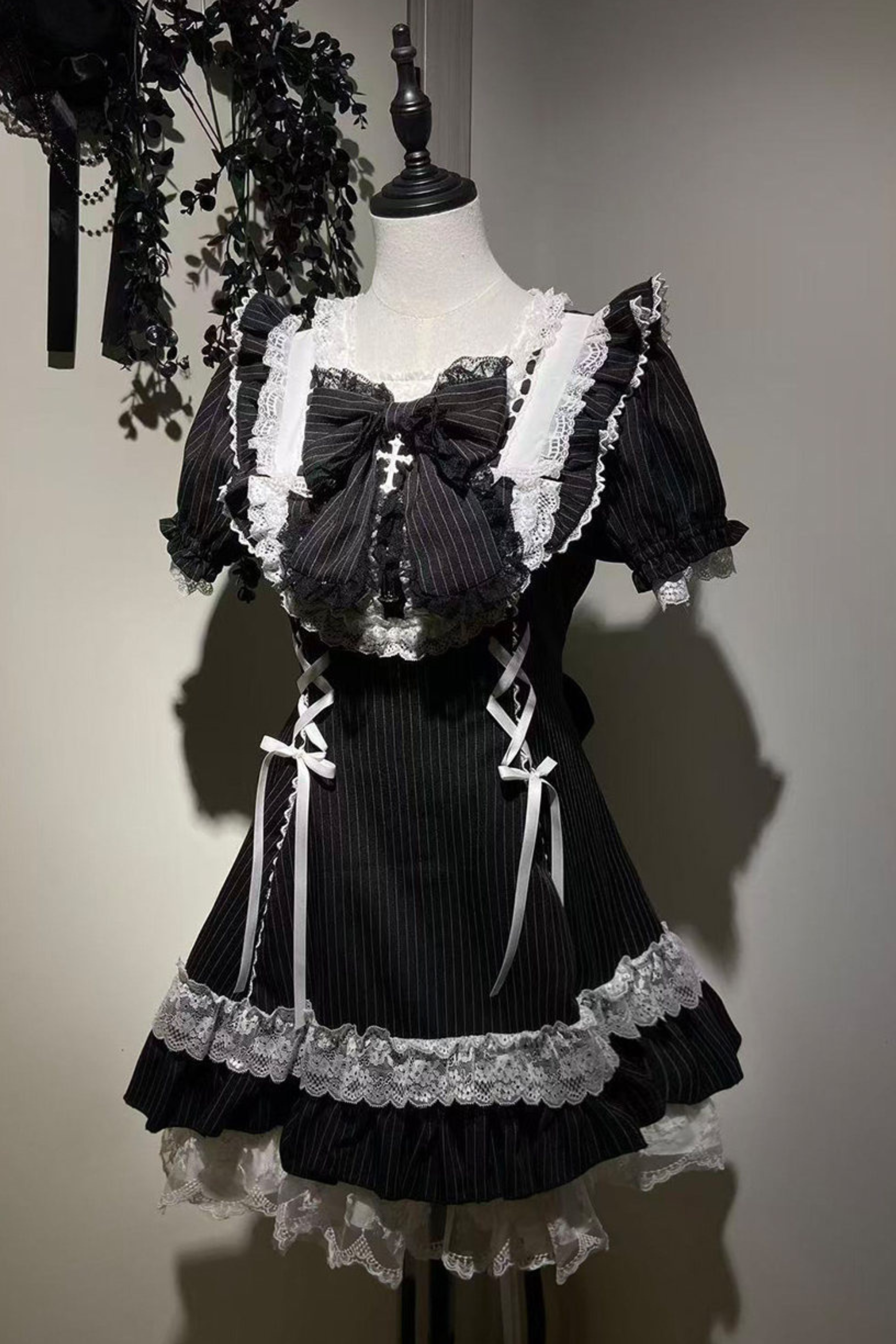 ダークレースアップストライプドロリータドレス+ラビットハット+スリーブ