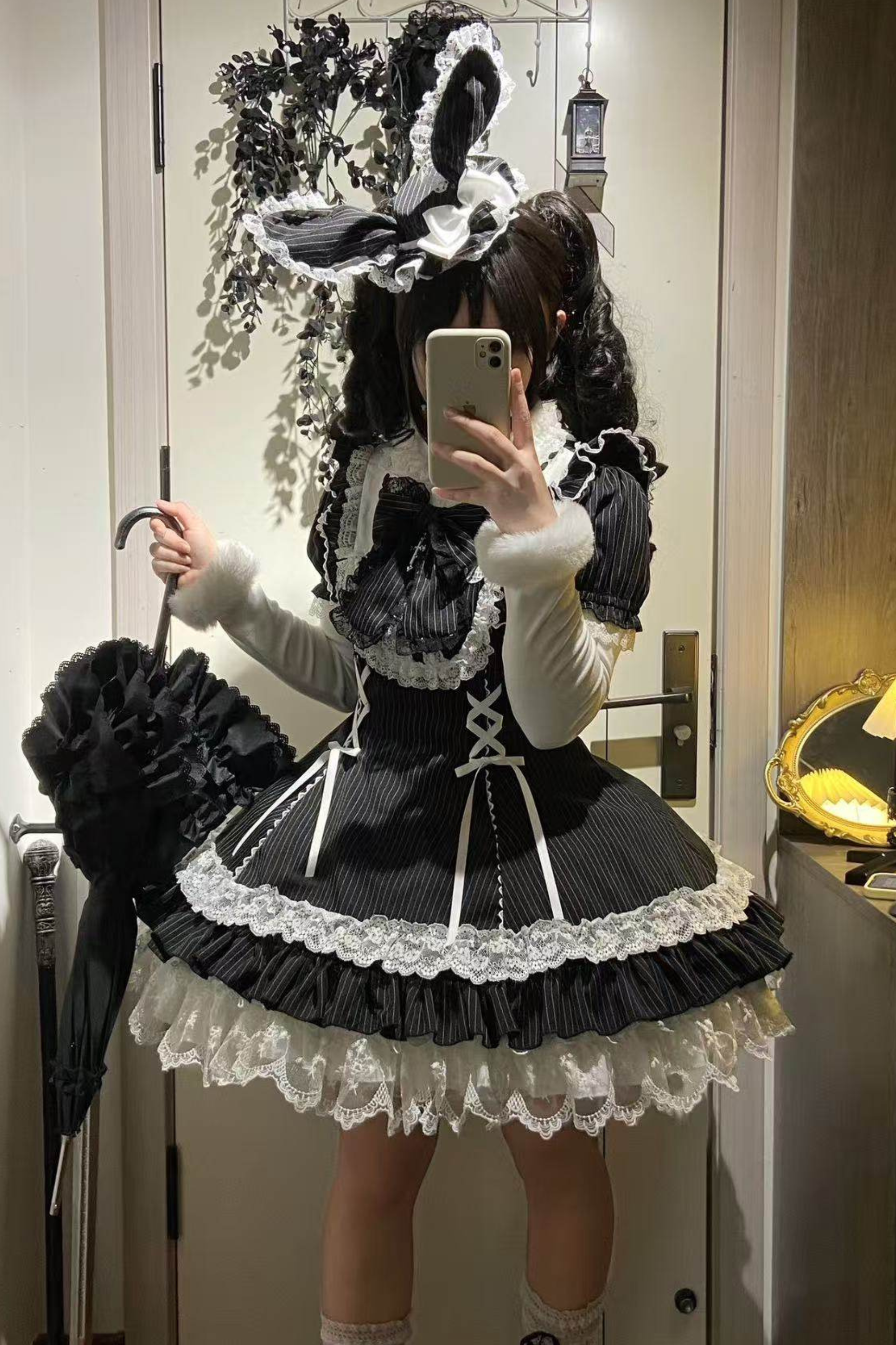 ❤ダークレースアップストライプドロリータドレス+ラビットハット+スリーブ❤