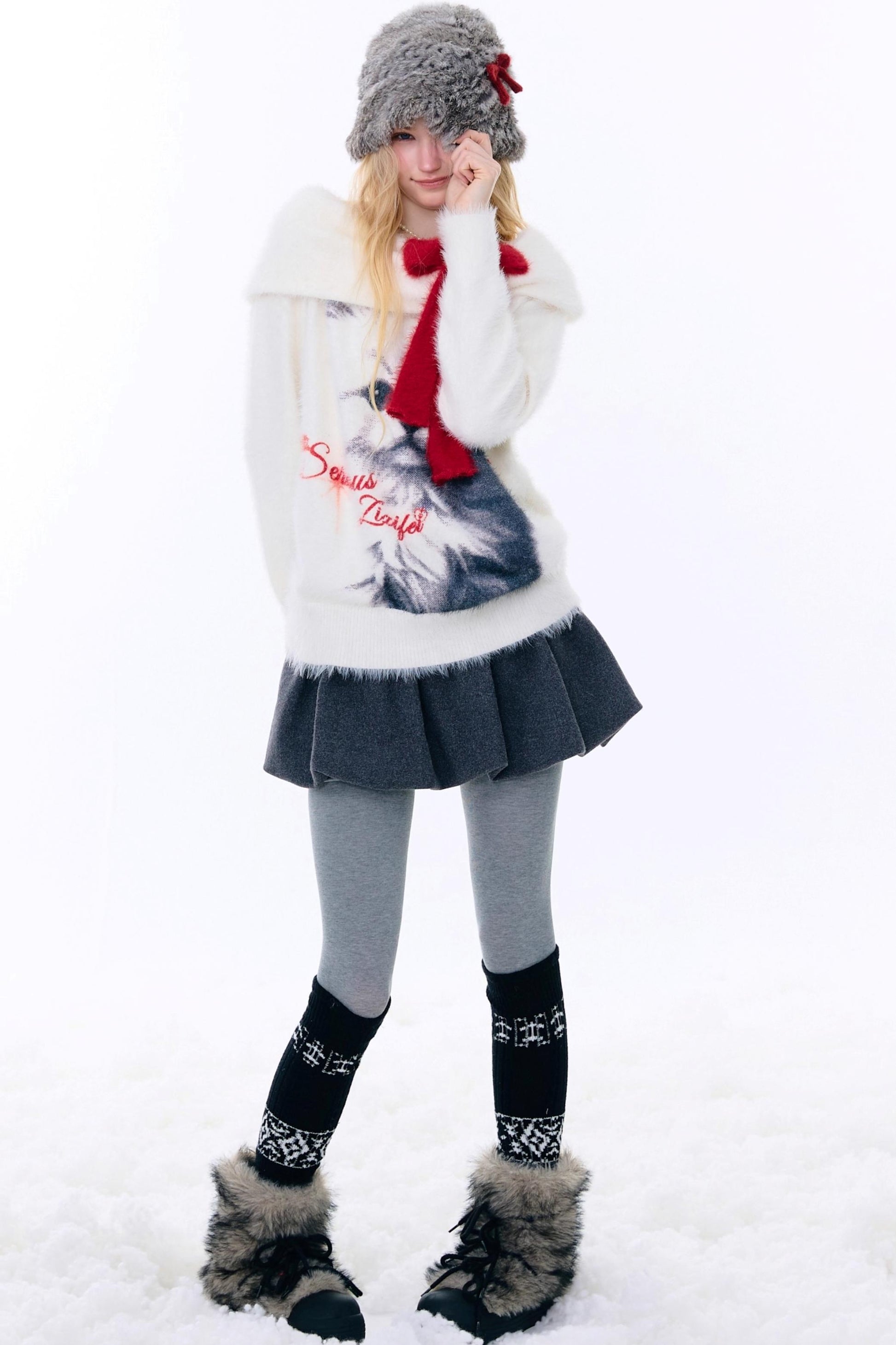 Cat print off-the-shoulder sweater