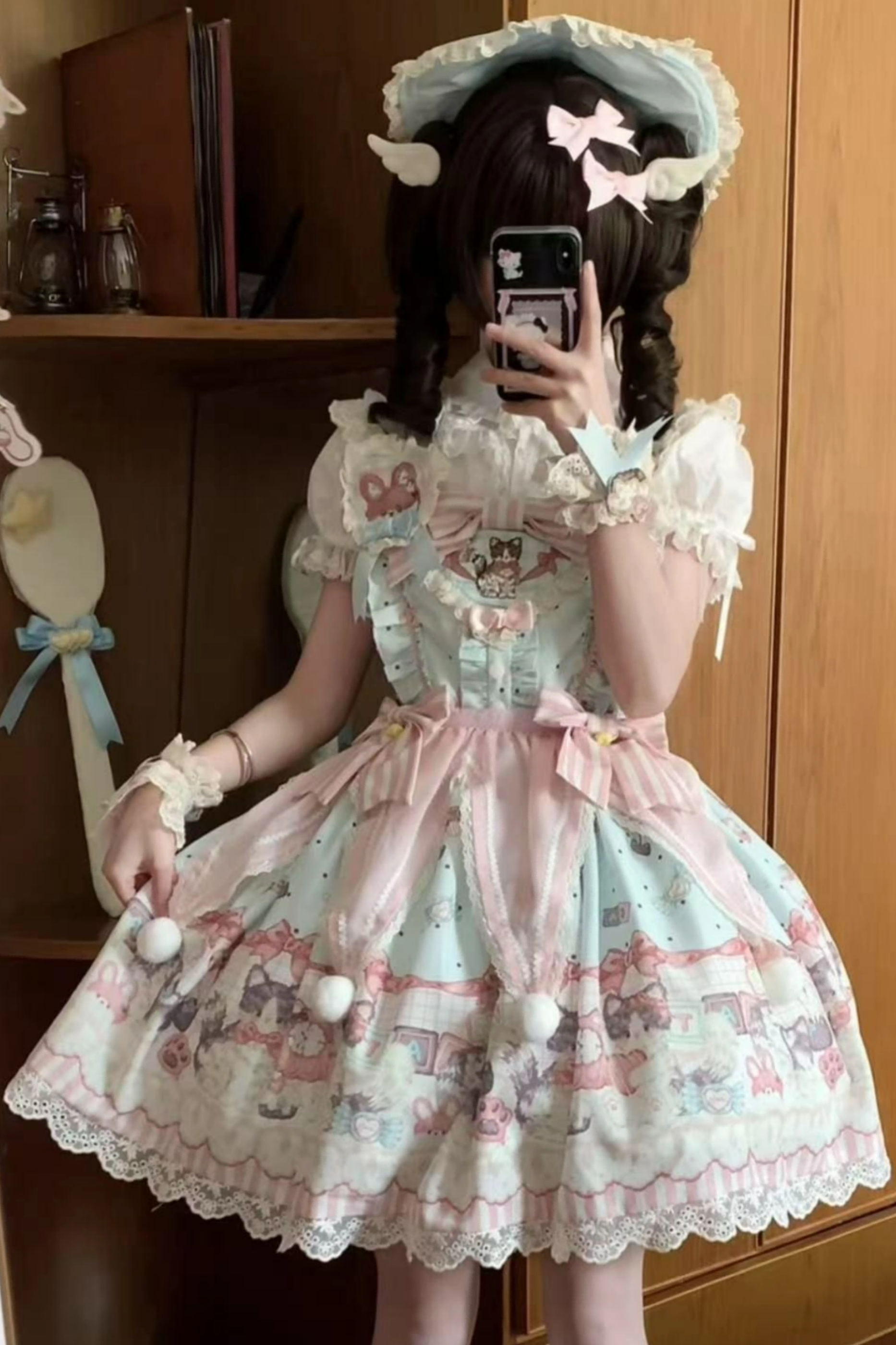 ❤キャビネットロリータジャンパースカート+ドレス+ブローチ+ヘアバンド+ボンネット+エプロン+ハンドスリーブ❤