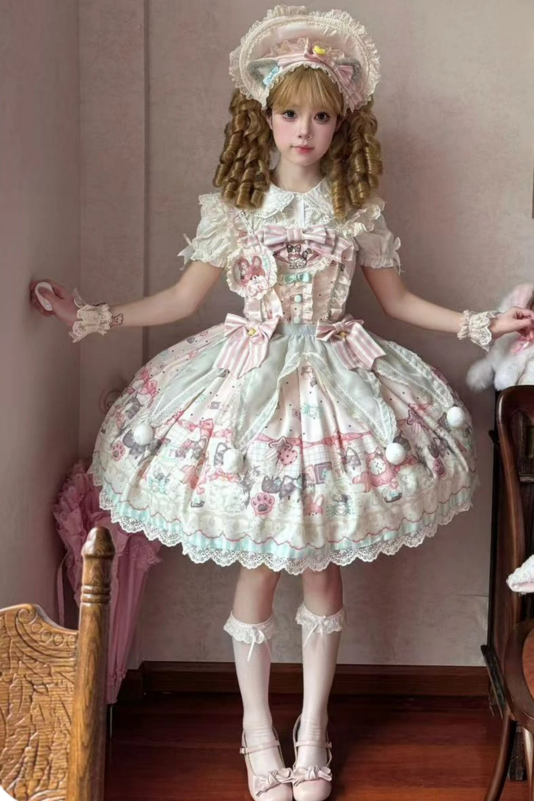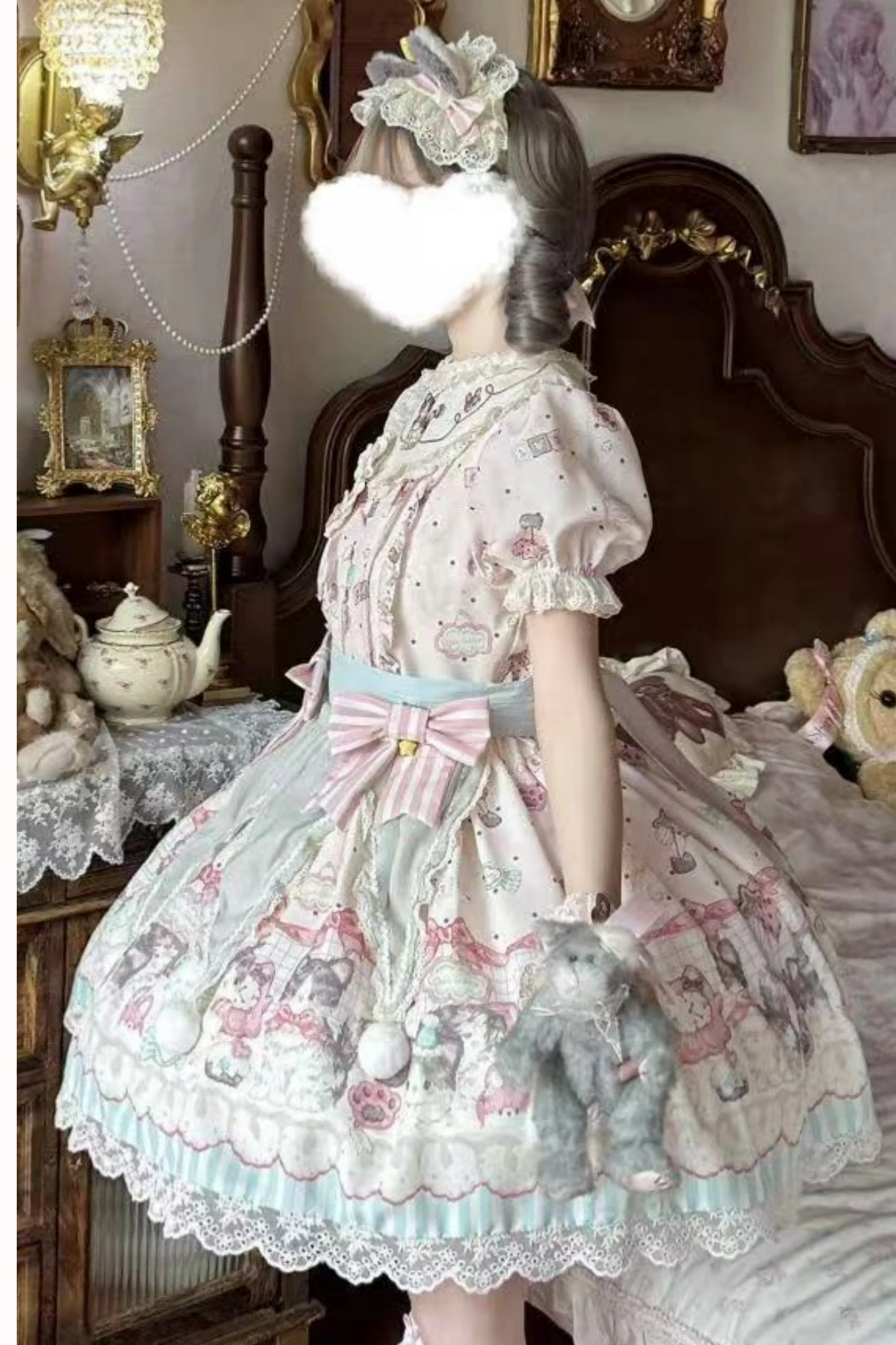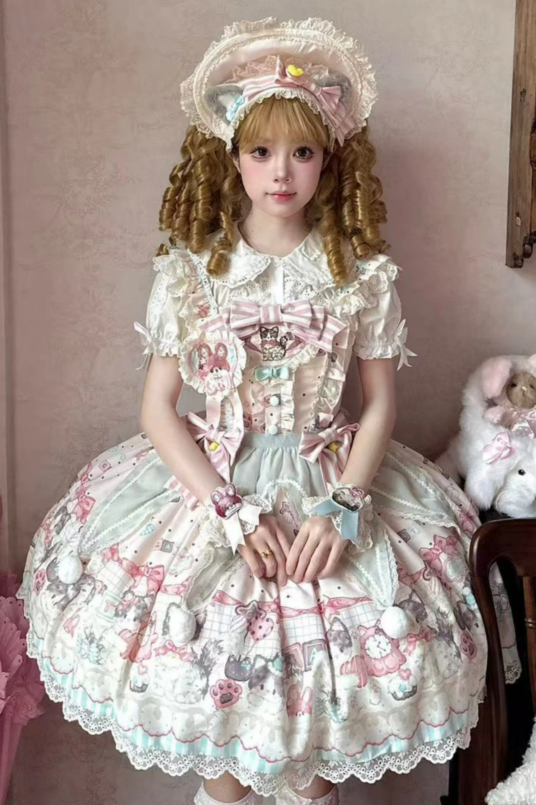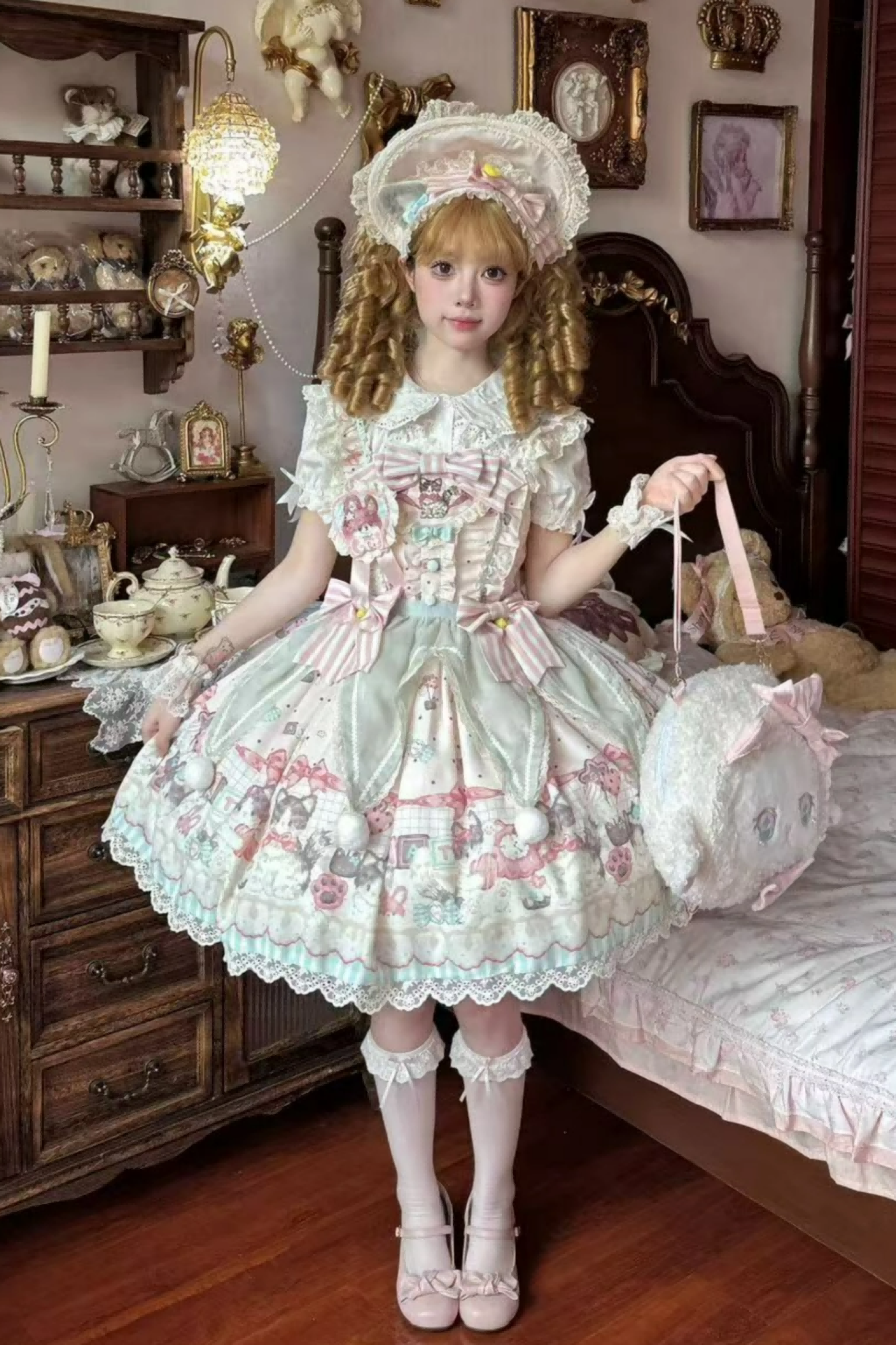 キャビネットロリータジャンパースカート+ドレス+ブローチ+ヘアバンド+ボンネット+エプロン+ハンドスリーブ